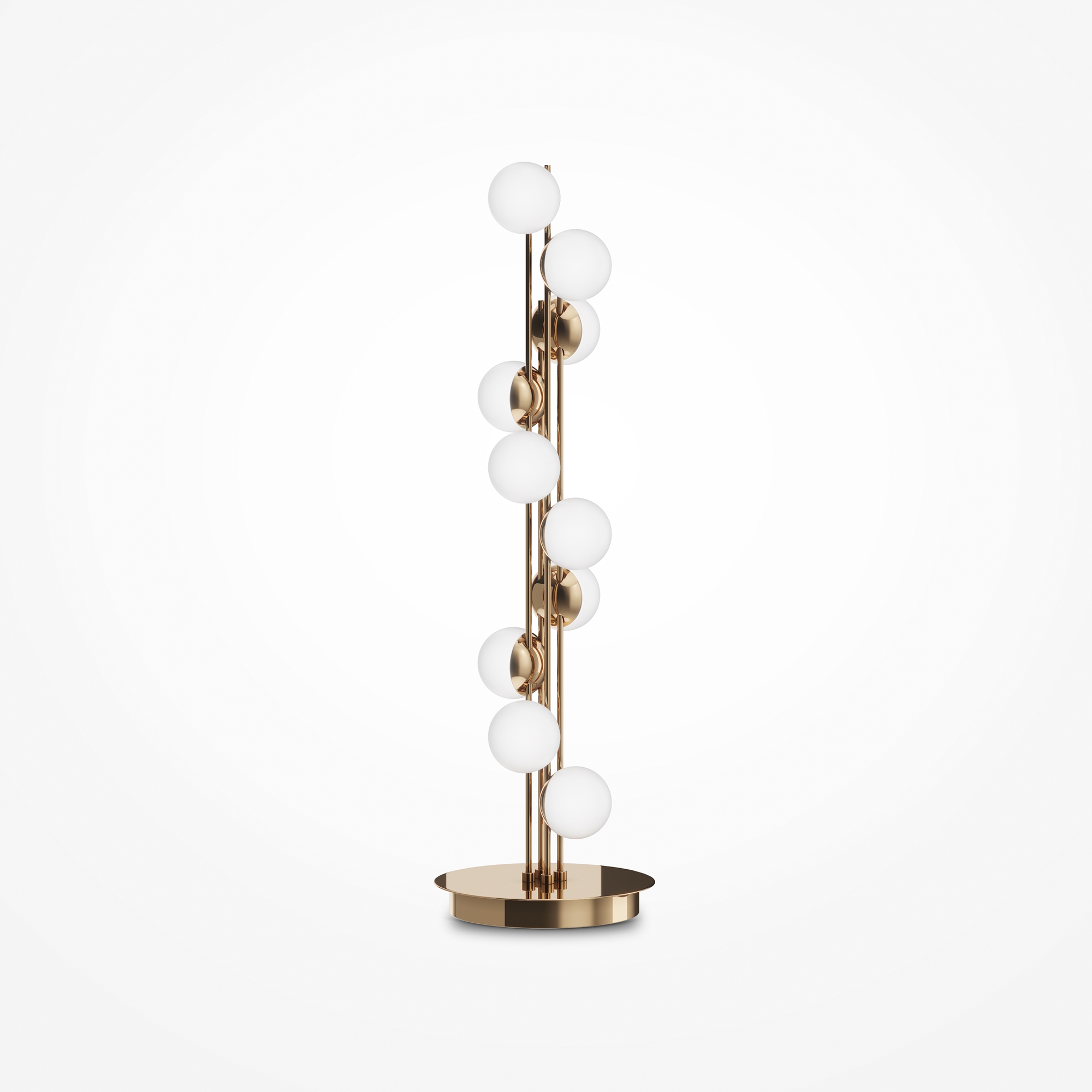 Арматура из металла в золотом цвете. Плафоны-сферы — белый пластик. Дизайн с имитацией молекулярной структуры. LED-источники света.