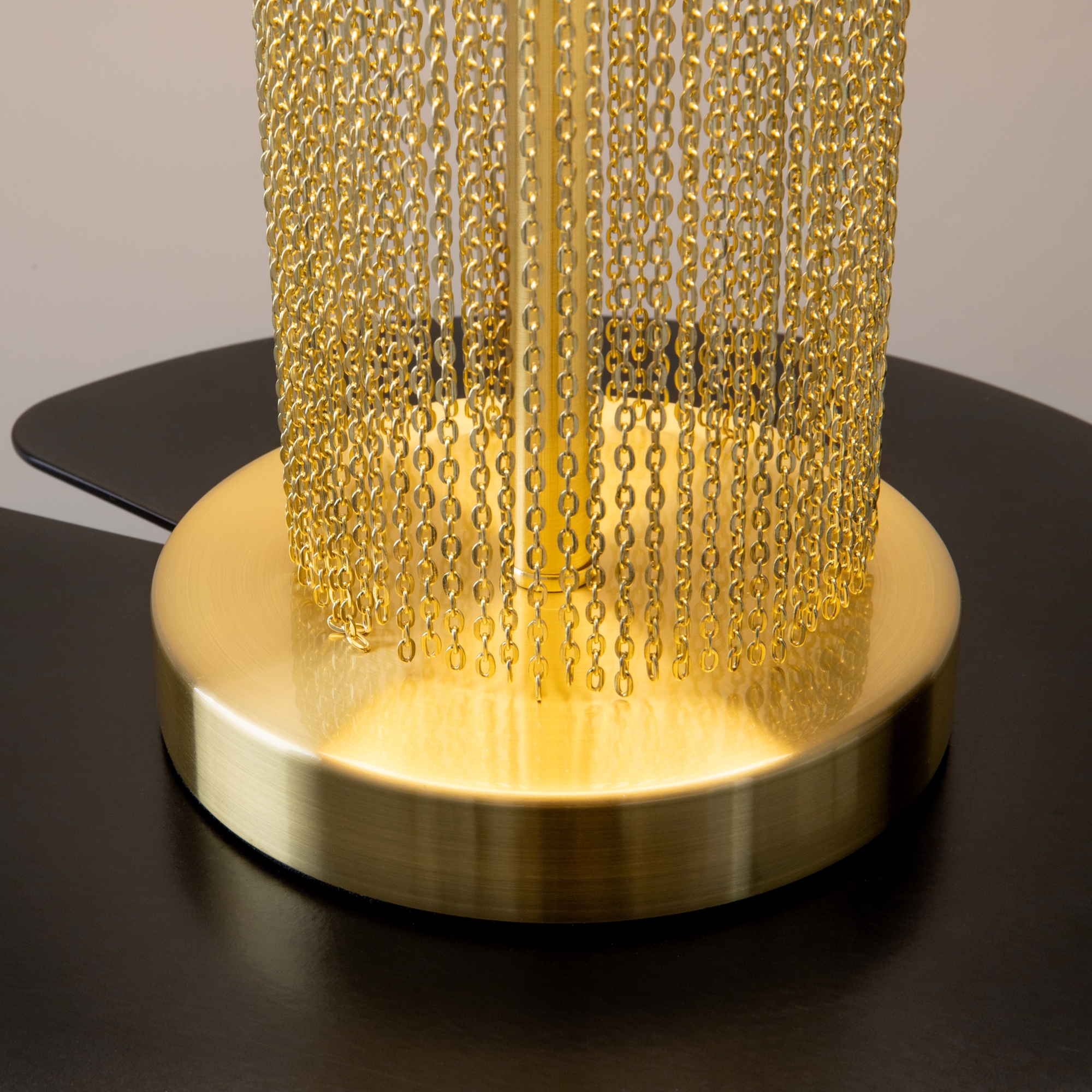 Арматура из нержавеющей стали. Цвет — золото. Абажур — белая ткань. Декоративные цепочки в тон арматуре. Съемный тканевый рассеиватель смягчает световой поток. Источники света — лампы с цоколем Е14.