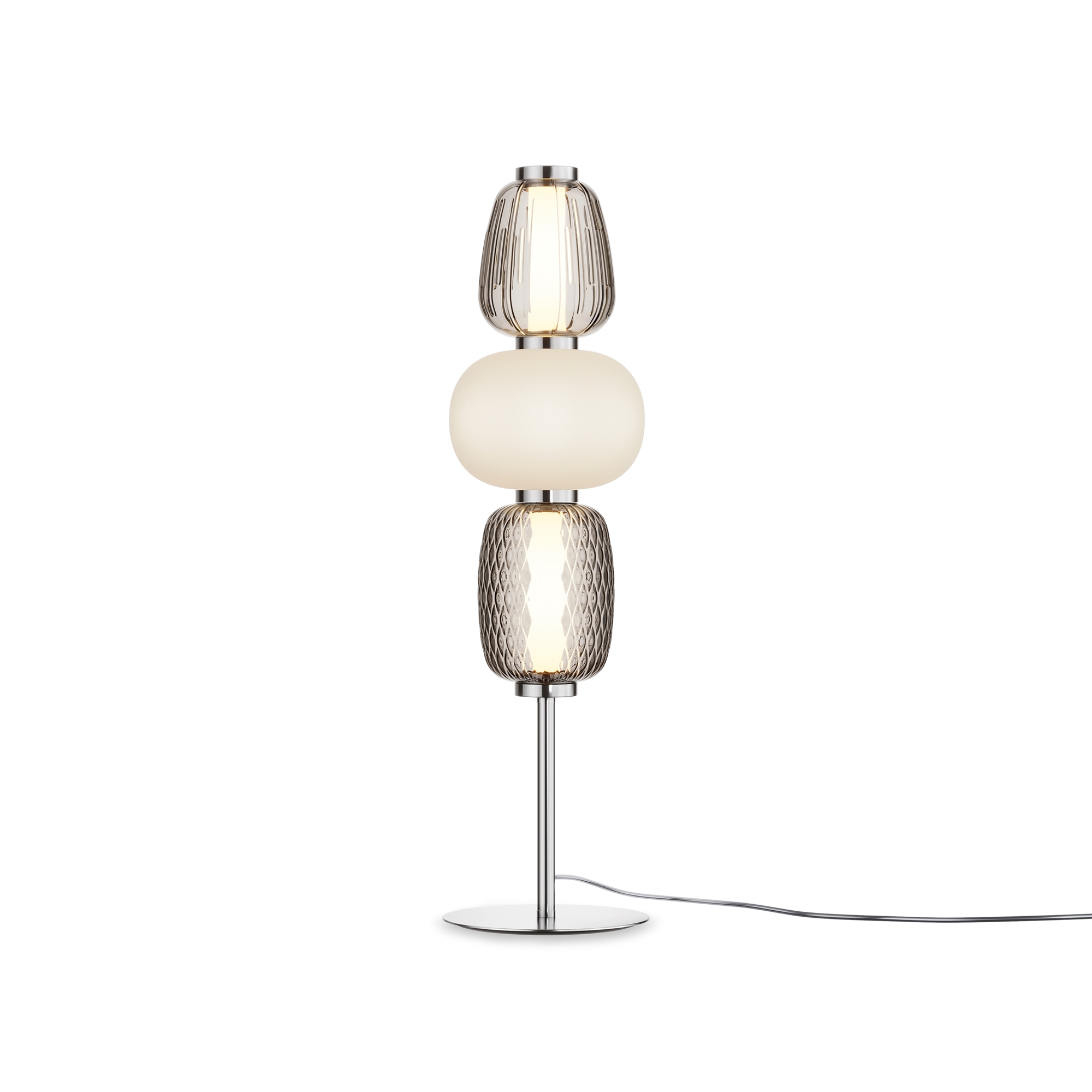 Металлическая арматура, цвет - золото, хром. Микс плафонов округлых и вытянутых форм из белого матового и прозрачного стекла с сетчатым и с линейным повторяющимся рельефным рисунком. Регулируемая высота подвесных моделей, провод - 3 метра. LED-источник света, цветовая температура 3000К.