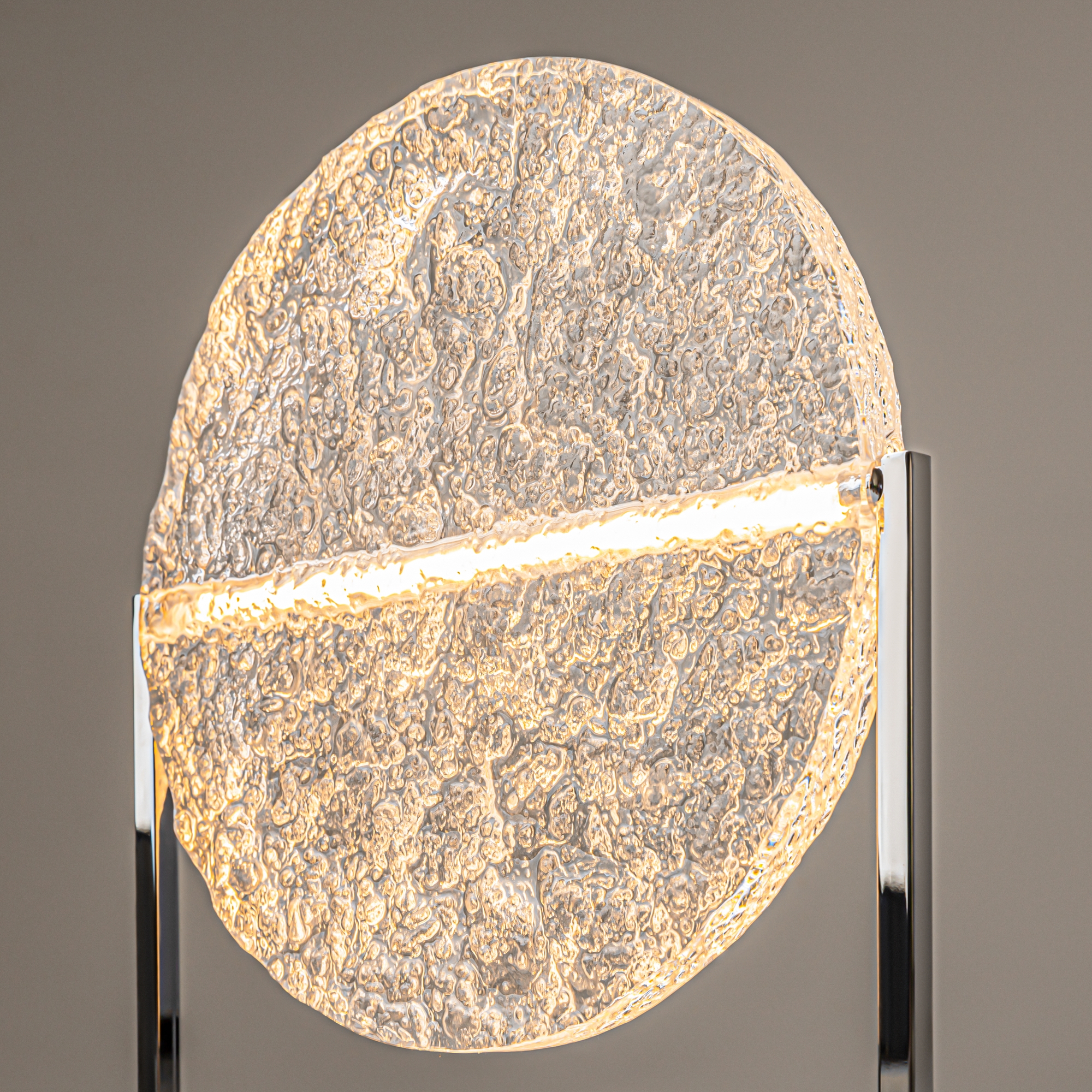 Материал арматуры - металл. Хромированное основание. Поворотный стеклянный рассеиватель, имитирующий лунное отражение на воде. LED-источник света. Настольная лампа и бра в коллекции. Возможность моделирования световых сценариев. Текстурное стекло для мягкого и широкого свечения. Дизайнерская серия, созданная в сотрудничестве с Британской Высшей школой Дизайна.