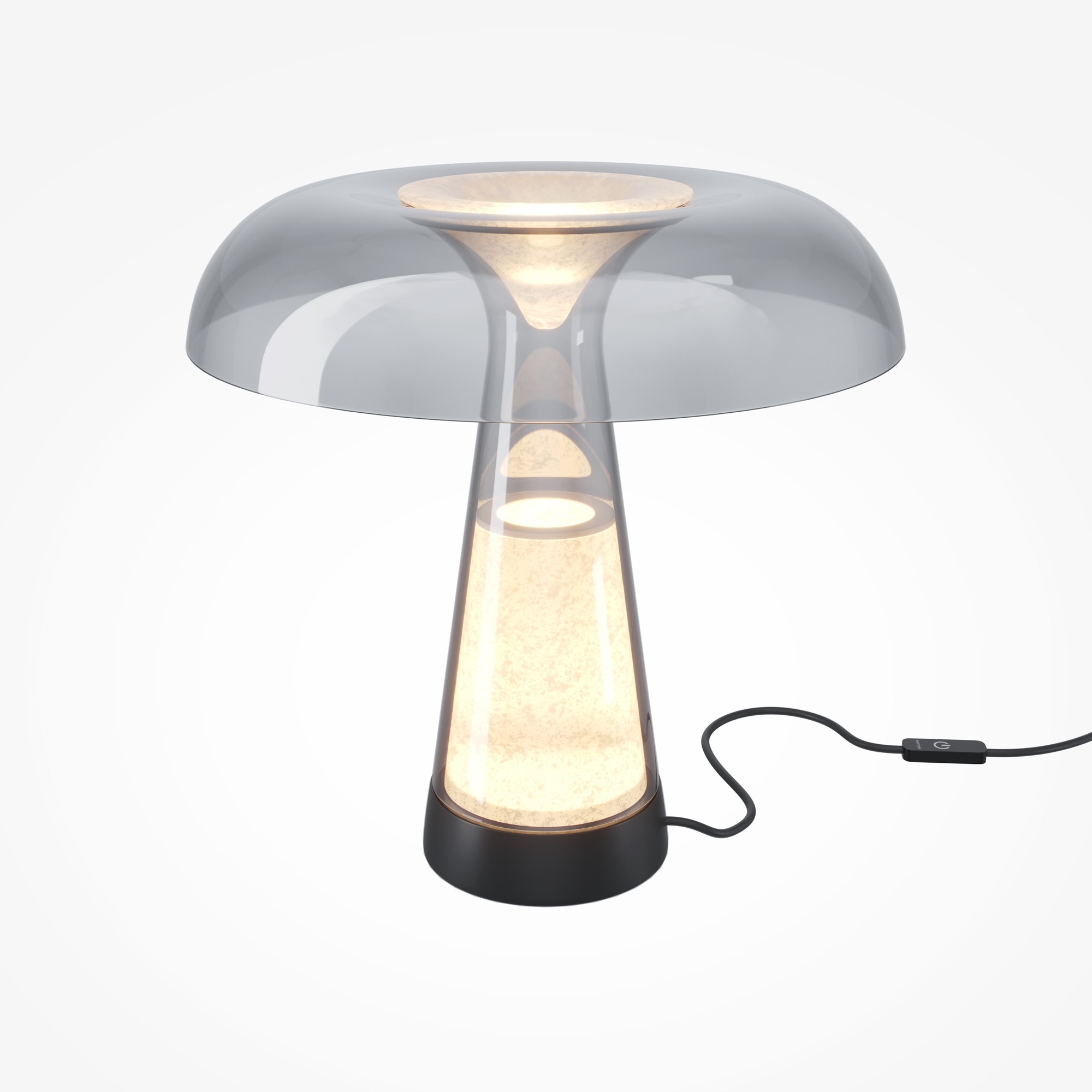 Дизайн представляет собой метафору музейного экспоната. Основной элемент — натуральный белый алебастр, скрытый за тонированным дымчатым стеклом с зеркальным эффектом. Свет LED-источника с переключателем температуры 2700-3000-4000К подчеркивает природную текстуру камня. Основание из черного металла. Управление осуществляется через сенсорный выключатель на проводе с функцией диммирования. При размещении у стены создает оптические эффекты (каустику). Античная эстетика, арт-объект в интерьере.