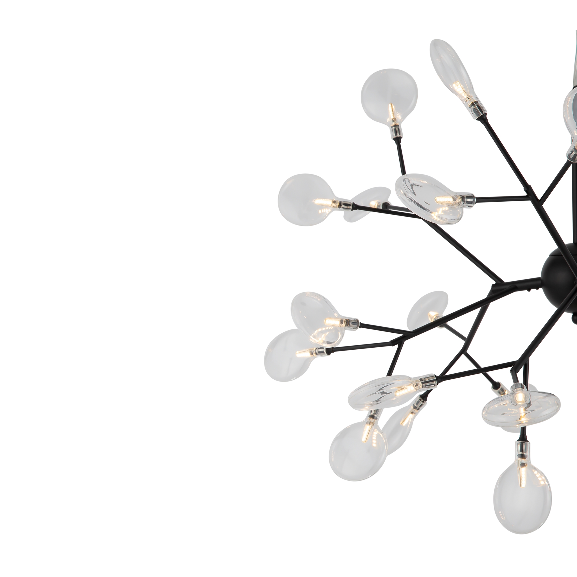 Материал арматуры – металл. Оттенки – черный, белый. Стеклянные плафоны оригинальной формы. Трендовый флористический дизайн. Источник света – лампа G4.