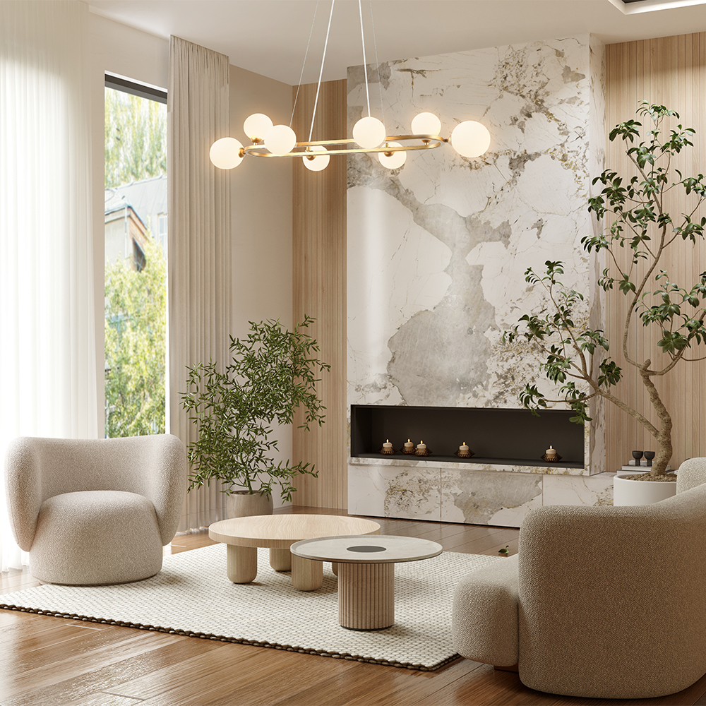 Металлическая арматура, цвета - черный и золотой. Плафоны-сферы из стекла 2х оттенков - матовый белый, полупрозрачный дымчатый - расположены на вытянутом металлическом каркасе, обеспечивая равномерный свет. Тонкие тросы придают светильнику эффект парения. Источник света - лампа с цоколем G9.