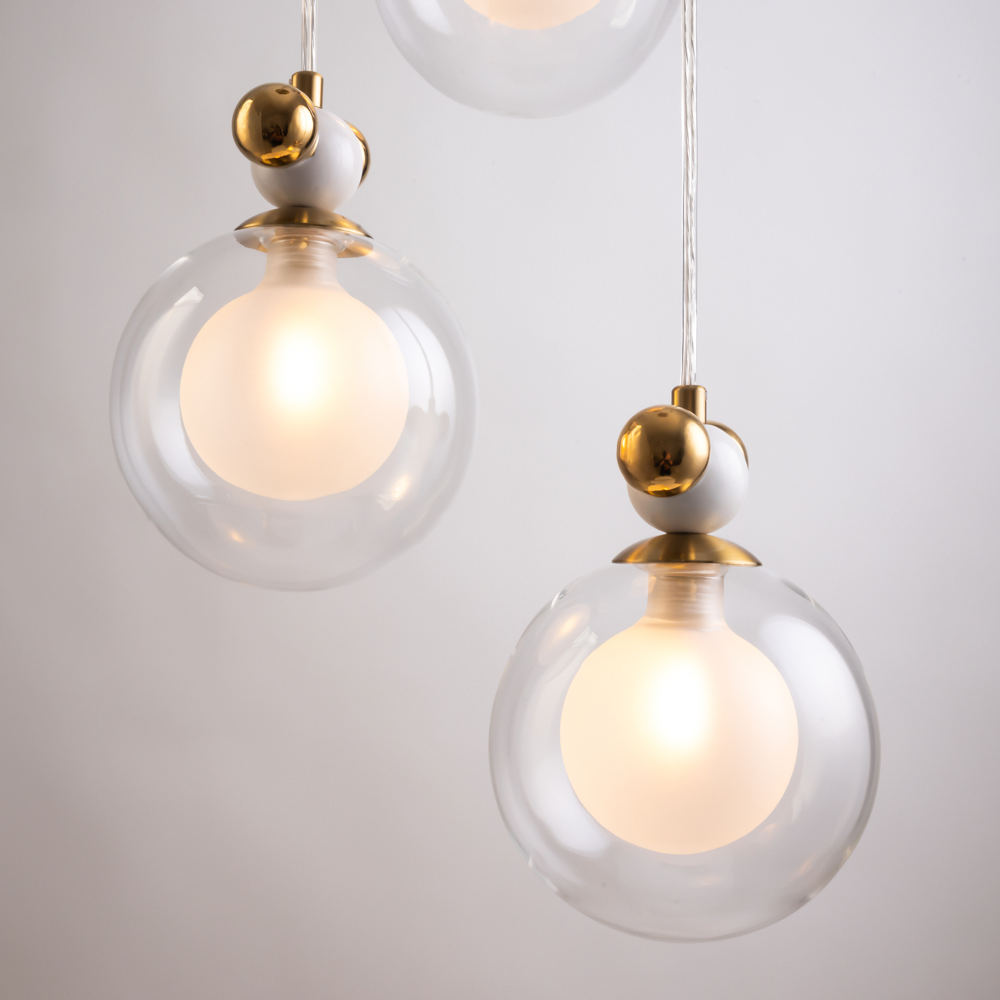 Металлическая арматура, два цвета — латунь и хром. Разные по форме плафоны — цилиндрические или овальные, украшены металлическими шариками. Стекло двойное, прозрачное или с легким матовым напылением. Конструкцию можно регулировать по высоте. Источником света служит лампа с цоколем G9 или Е14.