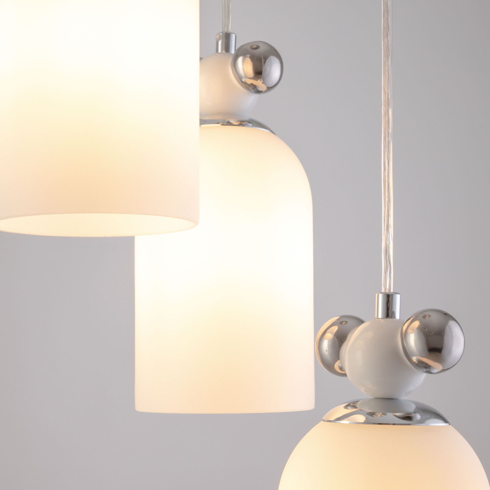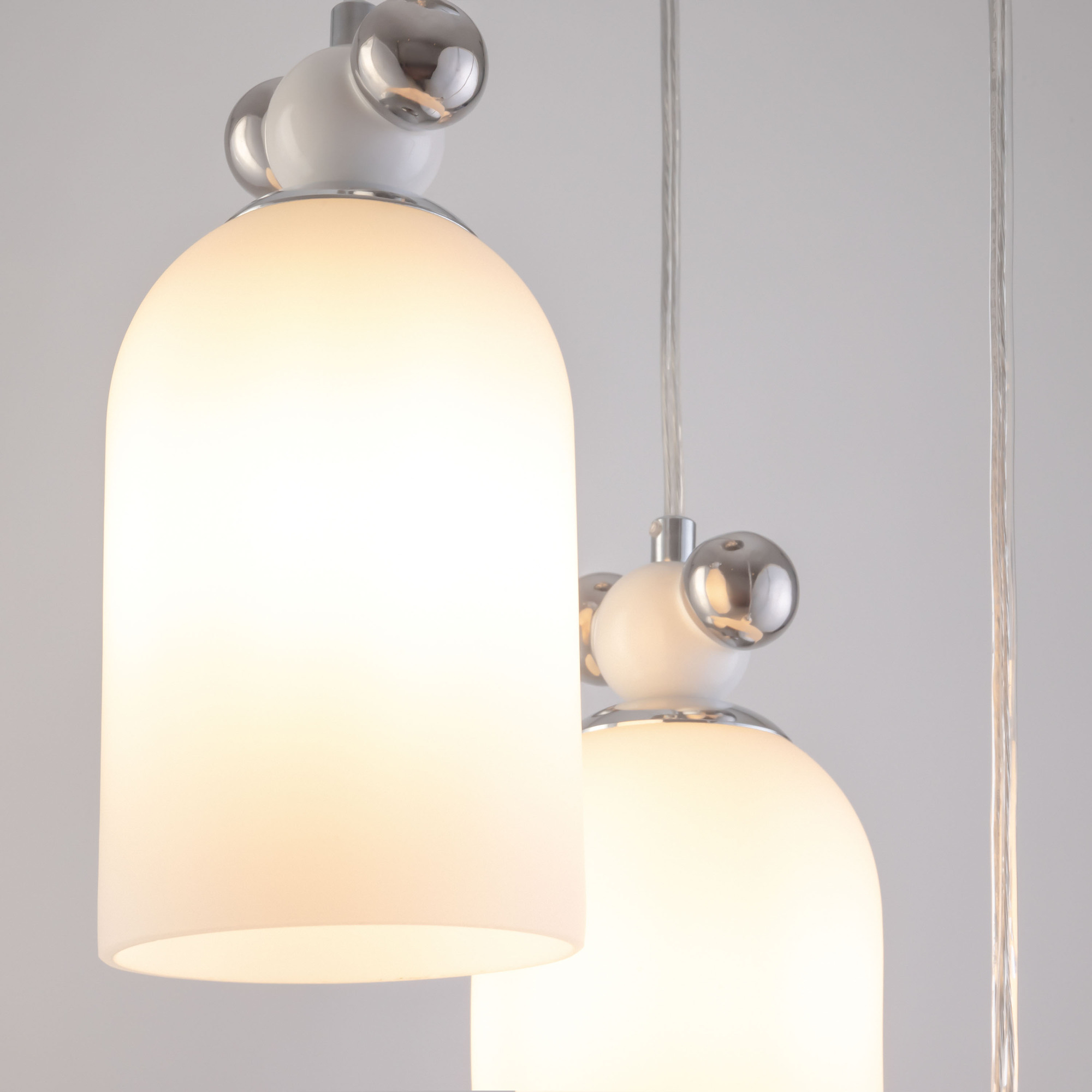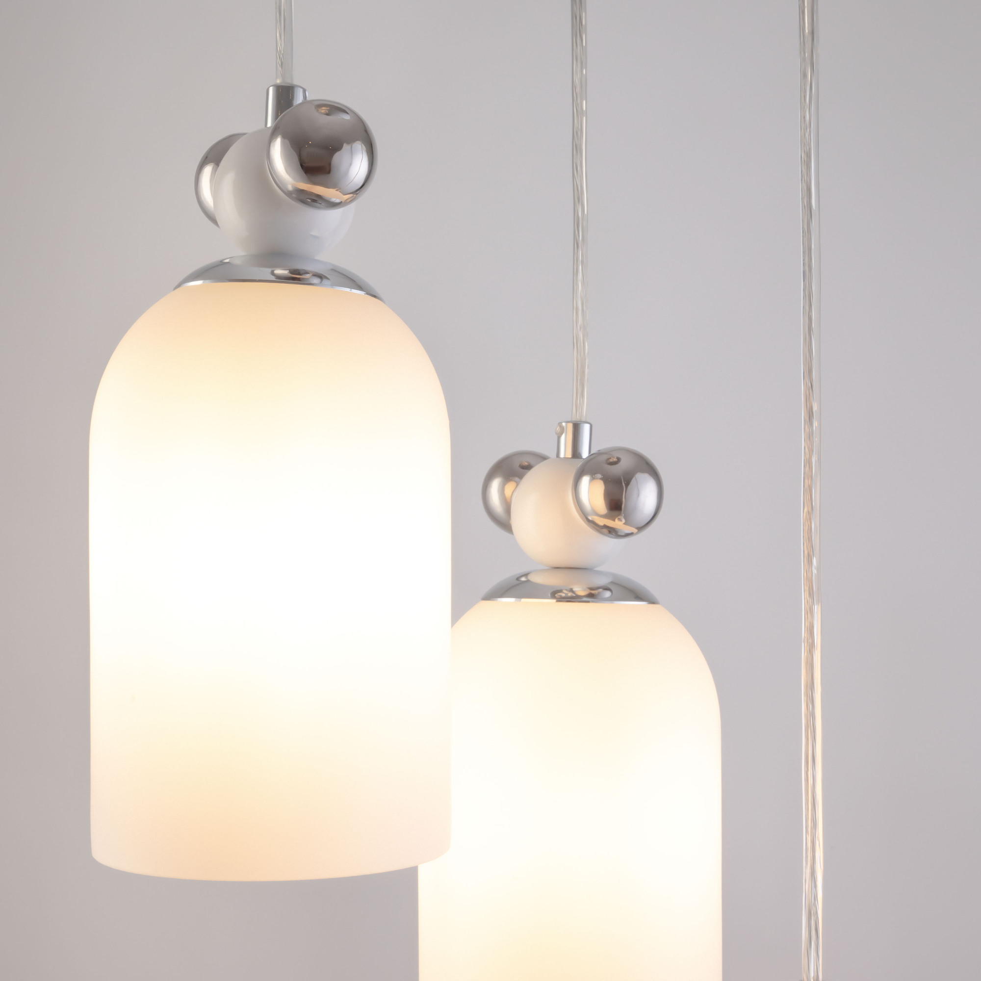 Металлическая арматура, два цвета — латунь и хром. Разные по форме плафоны — цилиндрические или овальные, украшены металлическими шариками. Стекло двойное, прозрачное или с легким матовым напылением. Конструкцию можно регулировать по высоте. Источником света служит лампа с цоколем G9 или Е14.