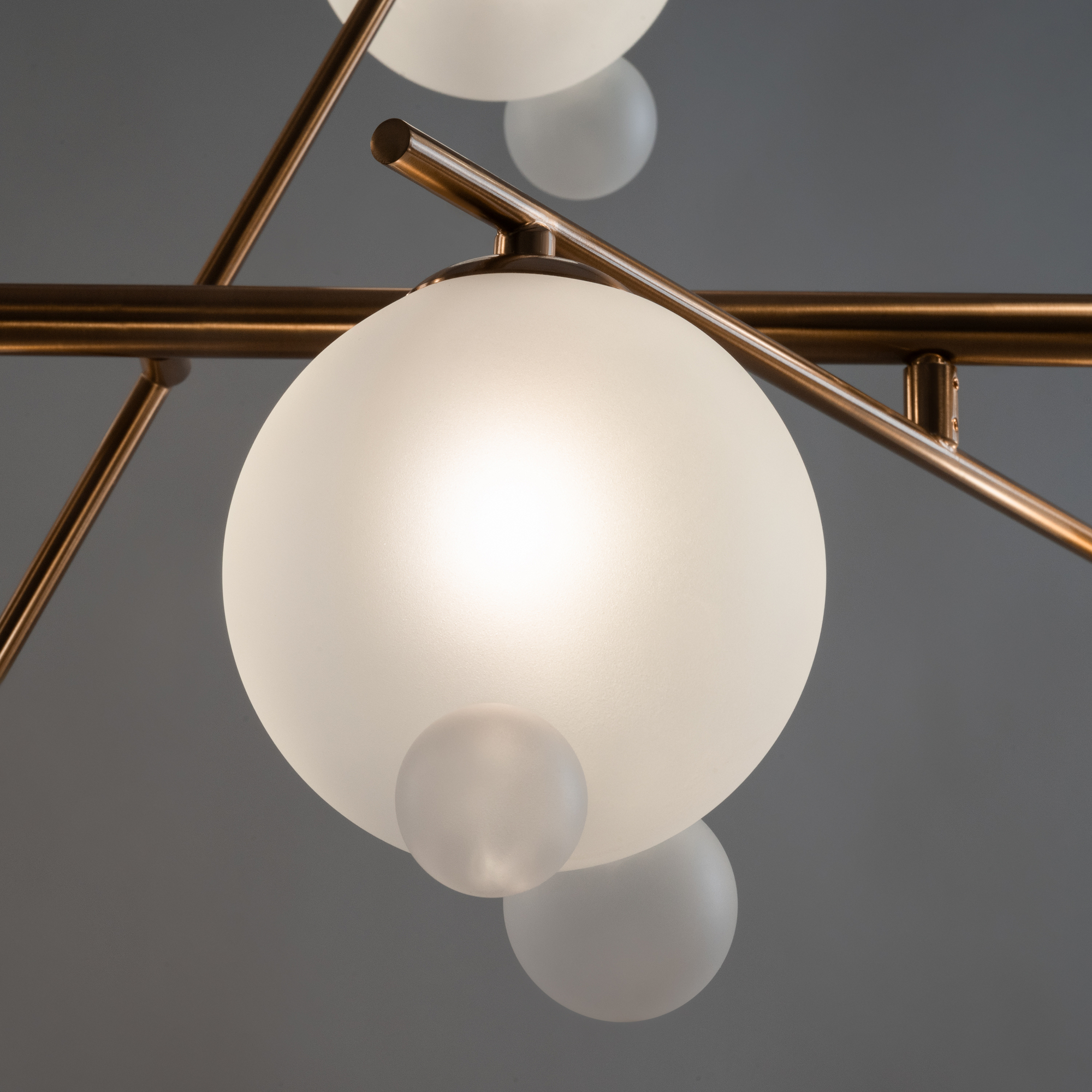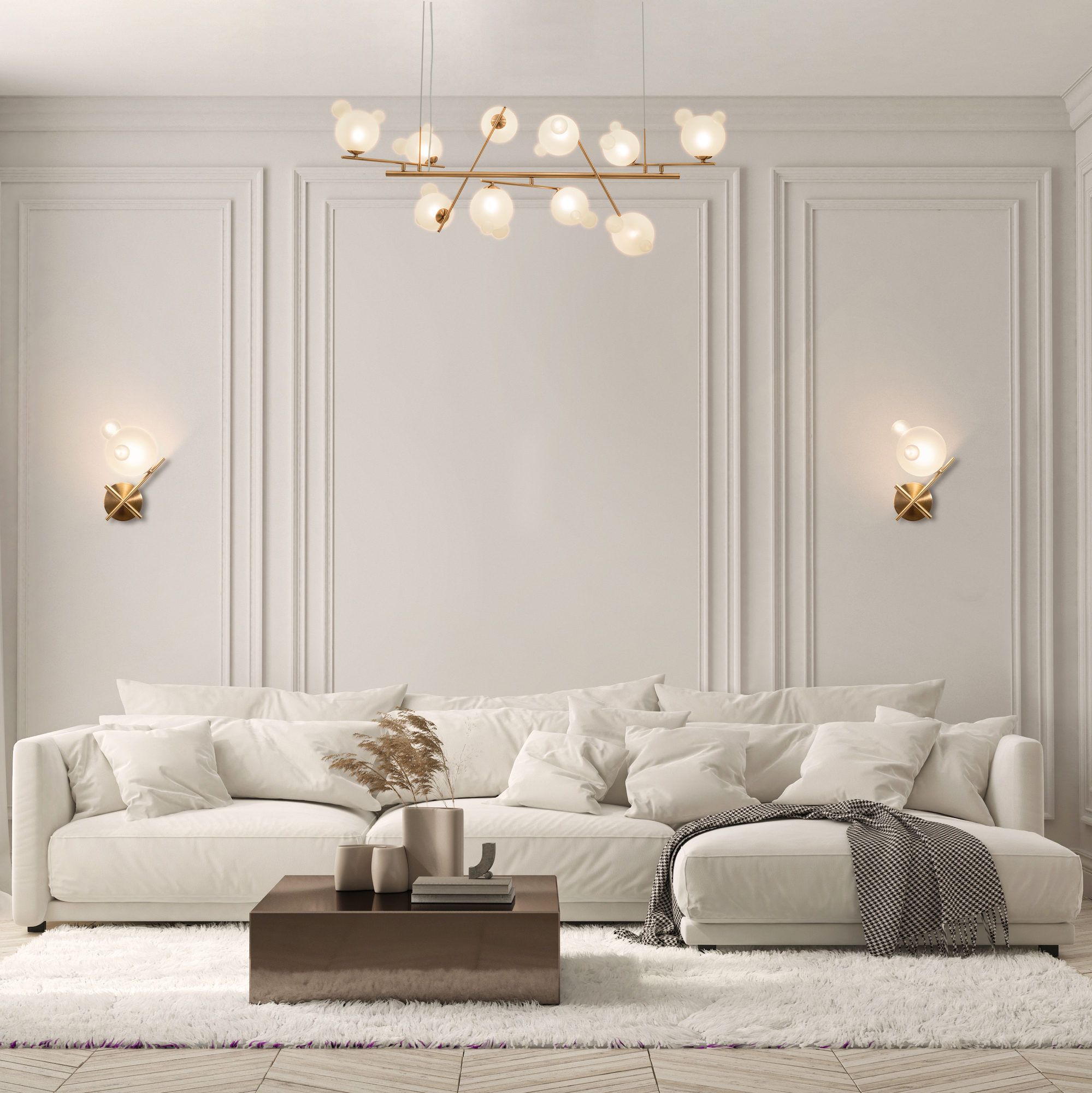 Арматура — металл, цвет— латунь. Белые плафоны из стекла с декоративными “ушками” - напоминают образ знаменитого диснеевского героя. Ассиметричный силуэт создает эффект подвижной игры. Высота подвесных моделей регулируется. Источник света - лампа с цоколем G9