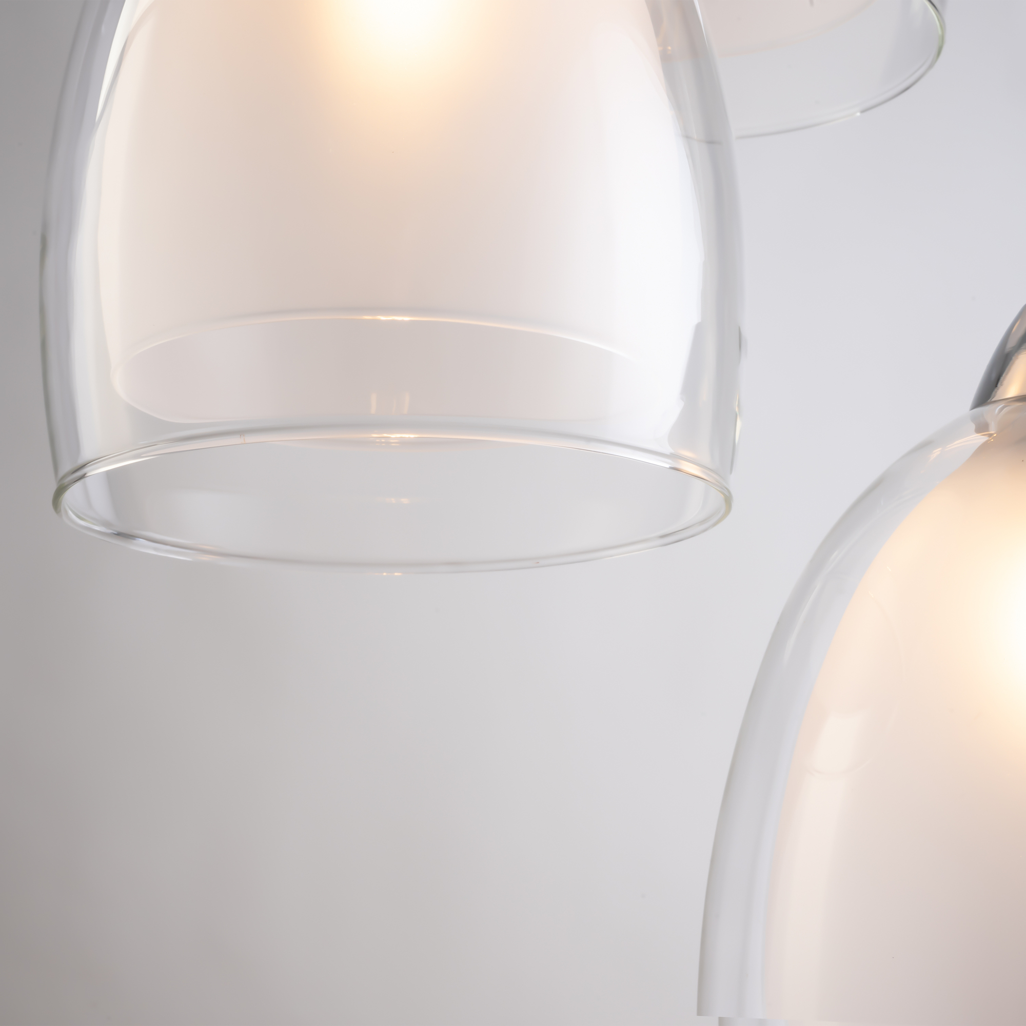 Арматура из металла в цвете хром. Двойные стеклянные плафоны в 3-х оттенках: дымчатый, коньячный, прозрачный. Компактные светильники-каскады в 2-х комбинациях — с одним плафоном и тремя. Высота тросов регулируется. Источник света — лампа с цоколем Е27