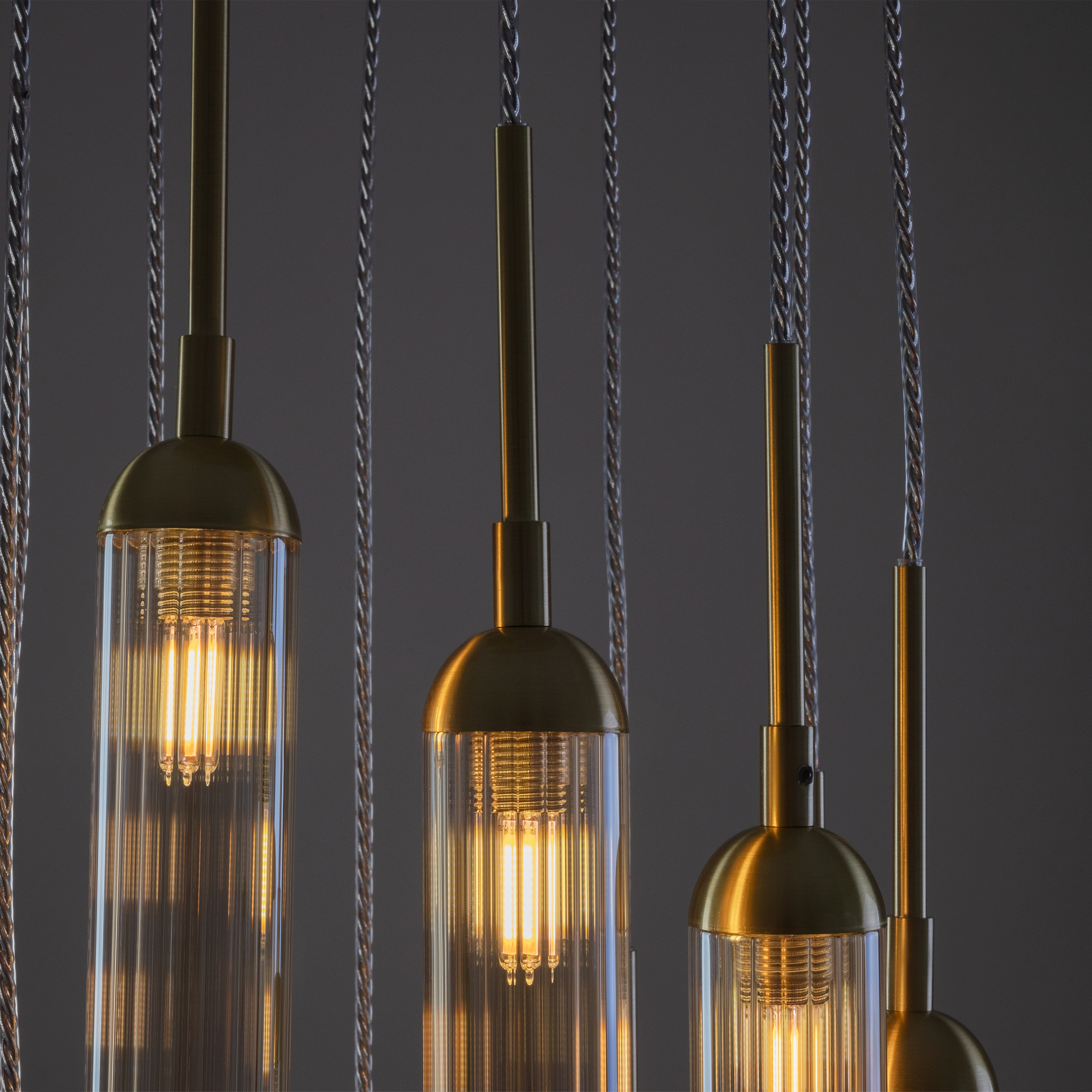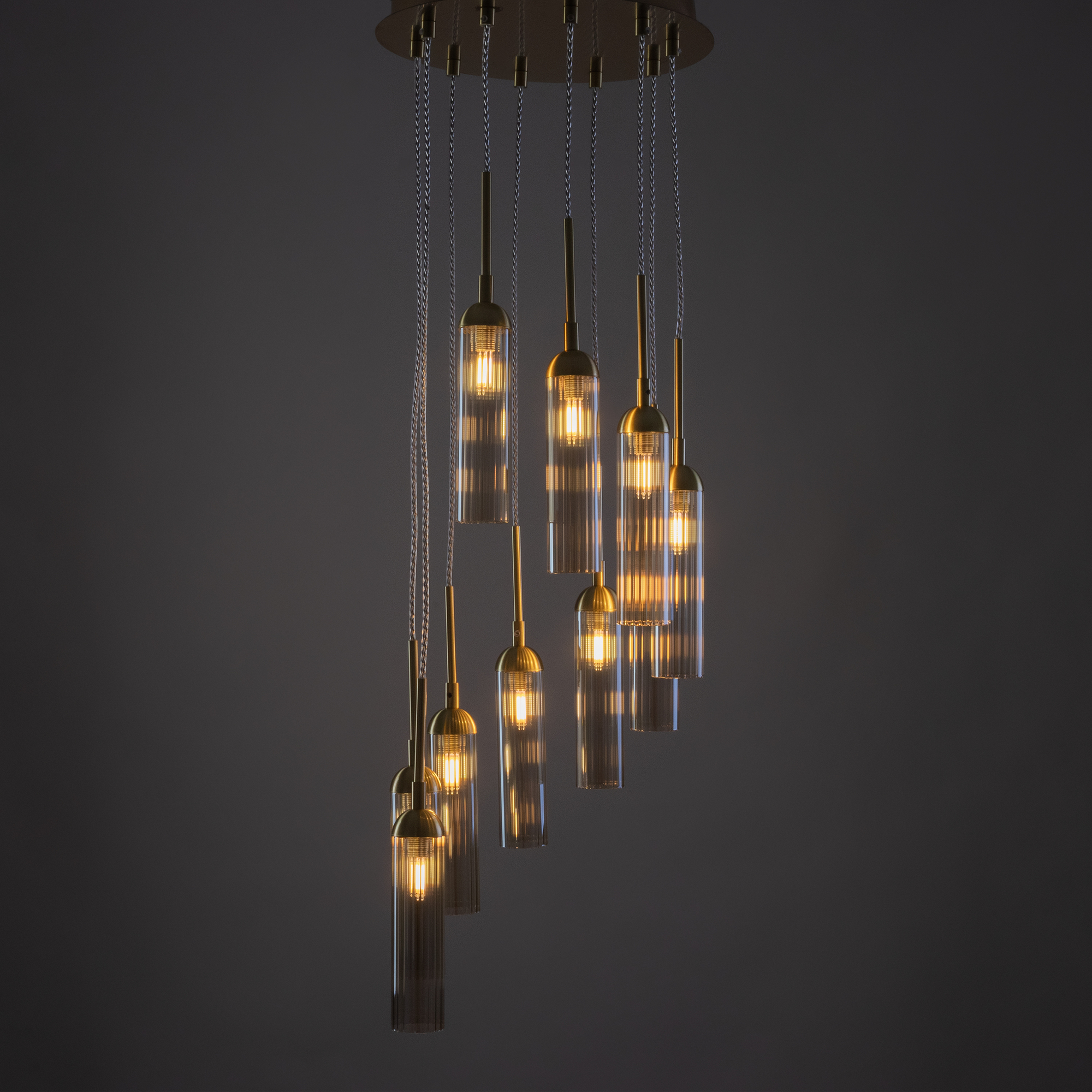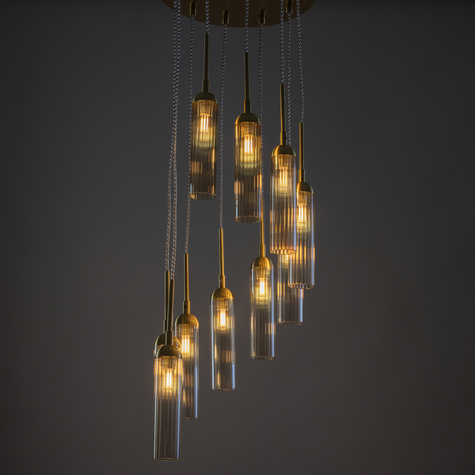 Арматура из металла, цвет — золото. Рельефные плафоны в тренде ZIGZAG. Материал — стекло, цвет — янтарный. Высота подвесных светильников регулируется. Плафоны закреплены на металлическую сферу. Источник света — лампа с цоколем G9.