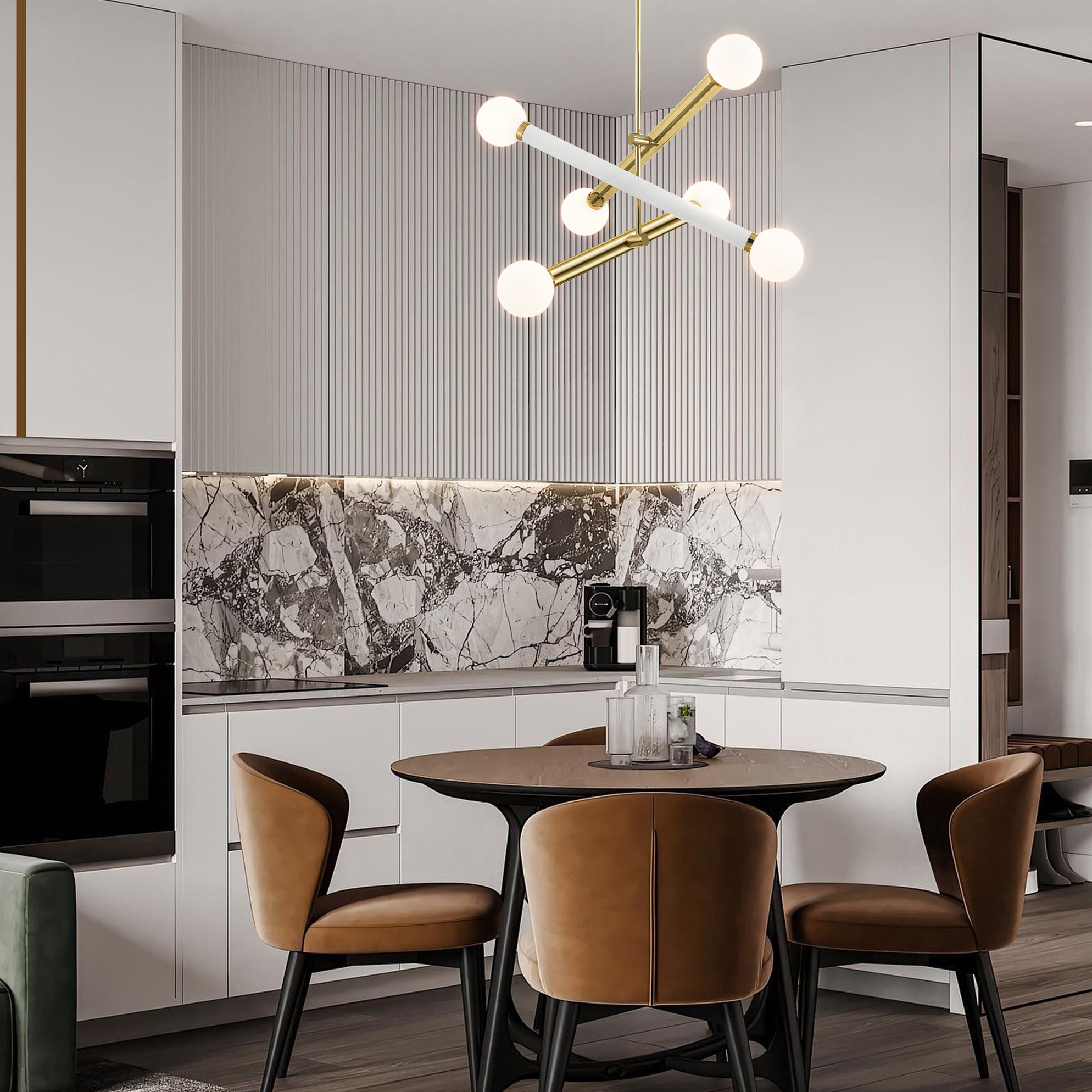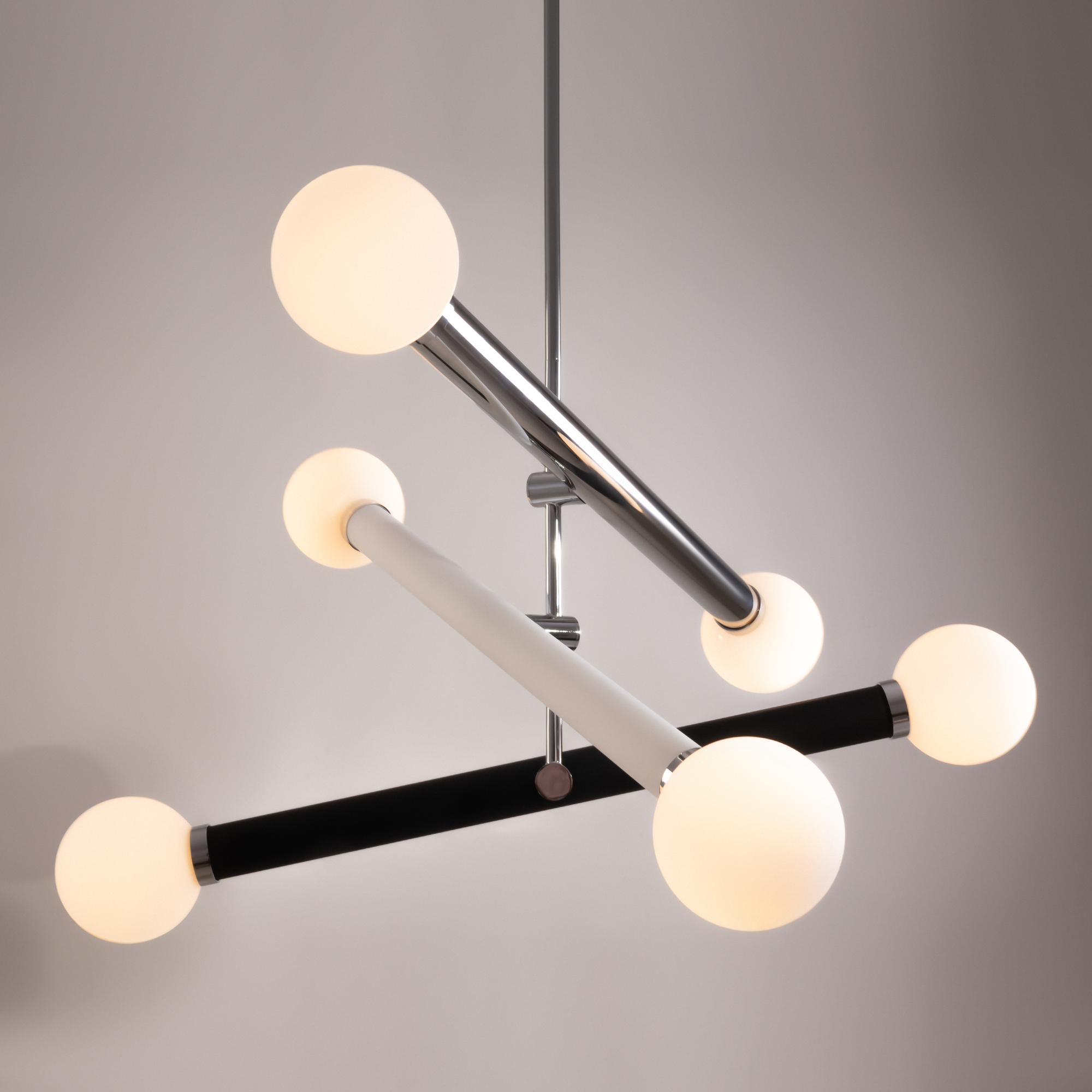 Арматура - металл, плафоны - стекло. Цветовые комбинации арматуры и плафона: черный + прозрачный, черный + янтарный, латунь + прозрачный. Элементы декора - выдувные «бусины» из стекла. Высота проводов регулируется. Источник света - лампа с цоколем GU10.