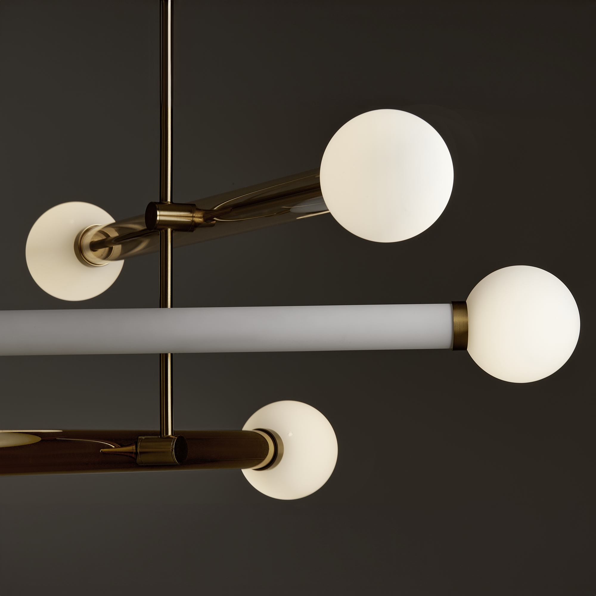 Арматура - металл, плафоны - стекло. Цветовые комбинации арматуры и плафона: черный + прозрачный, черный + янтарный, латунь + прозрачный. Элементы декора - выдувные «бусины» из стекла. Высота проводов регулируется. Источник света - лампа с цоколем GU10.