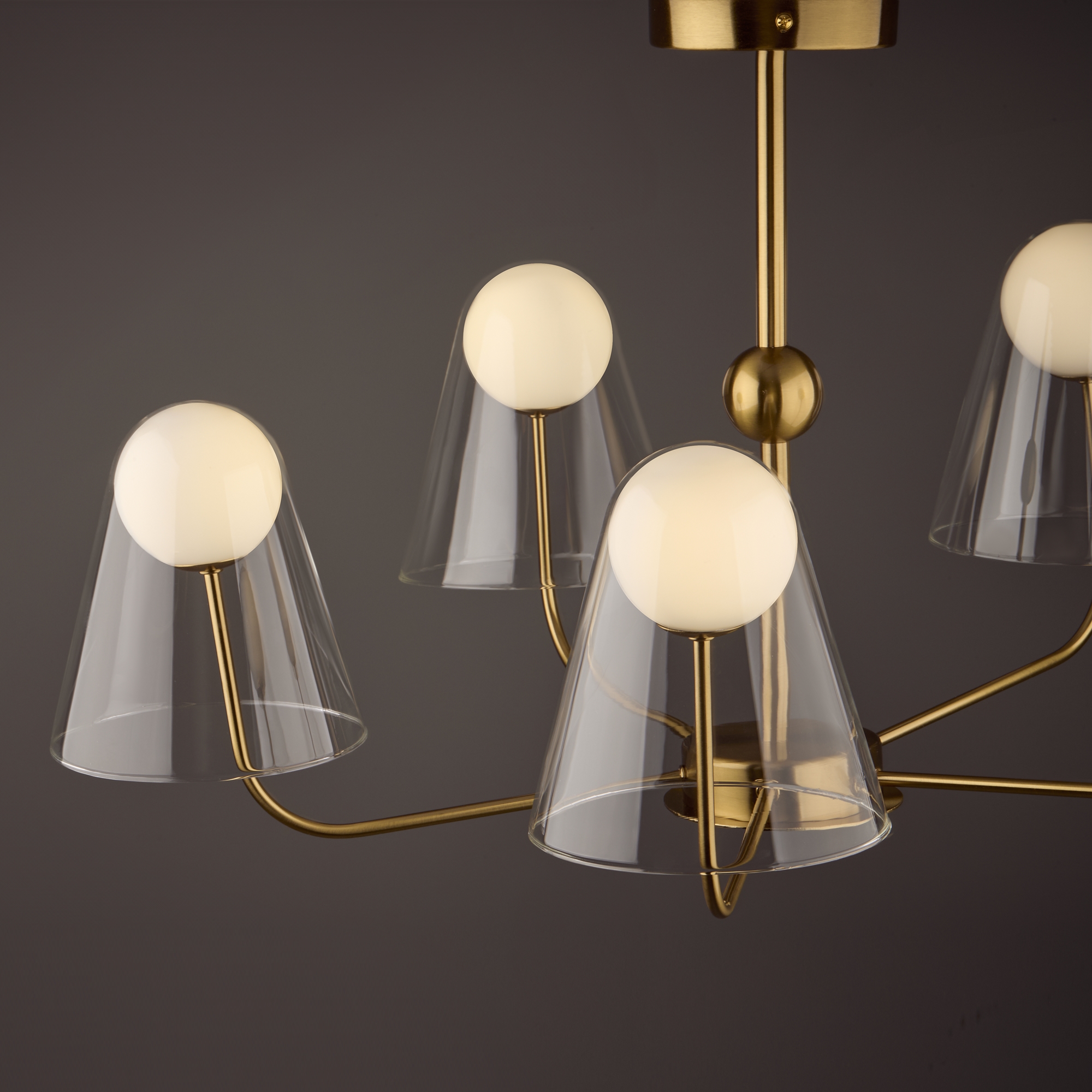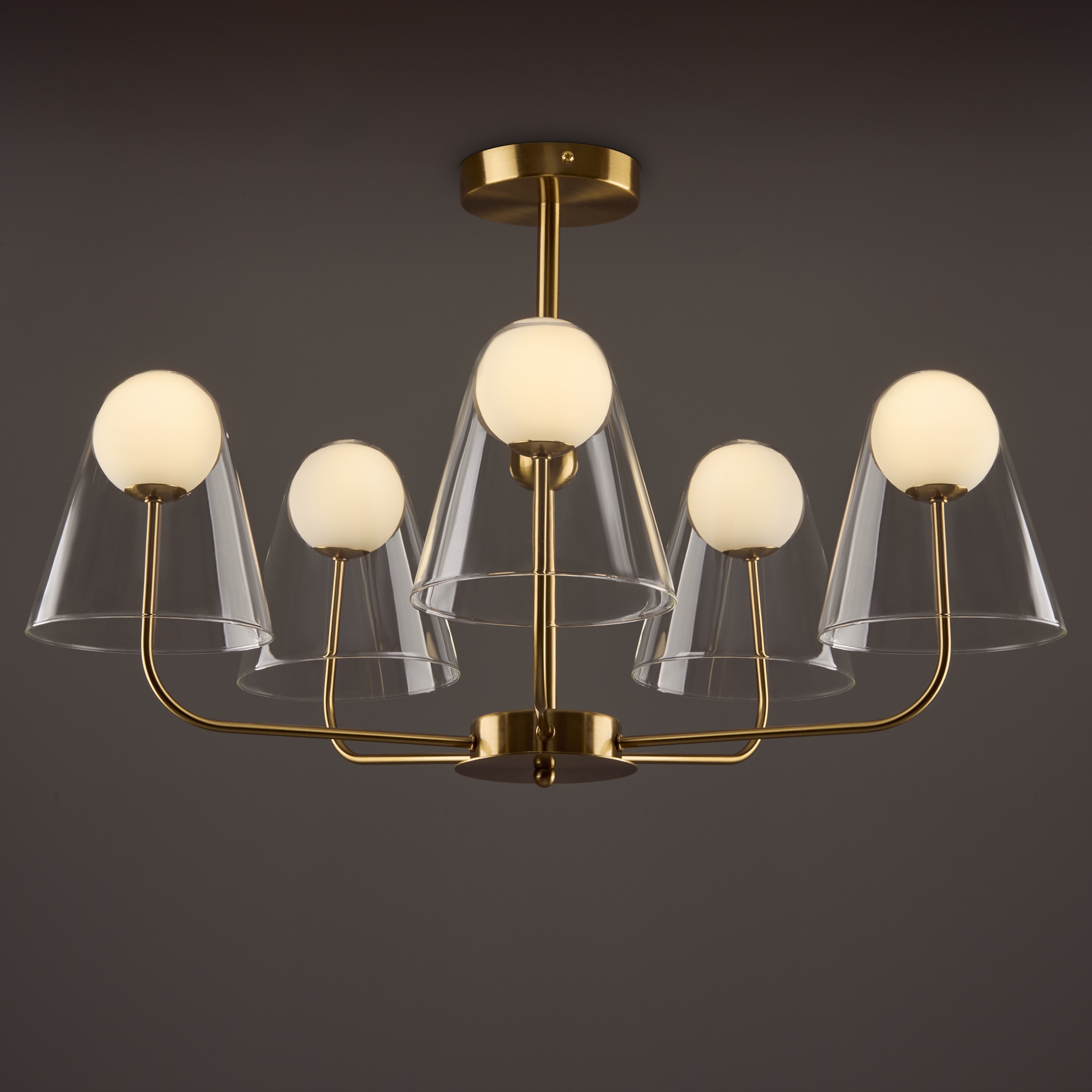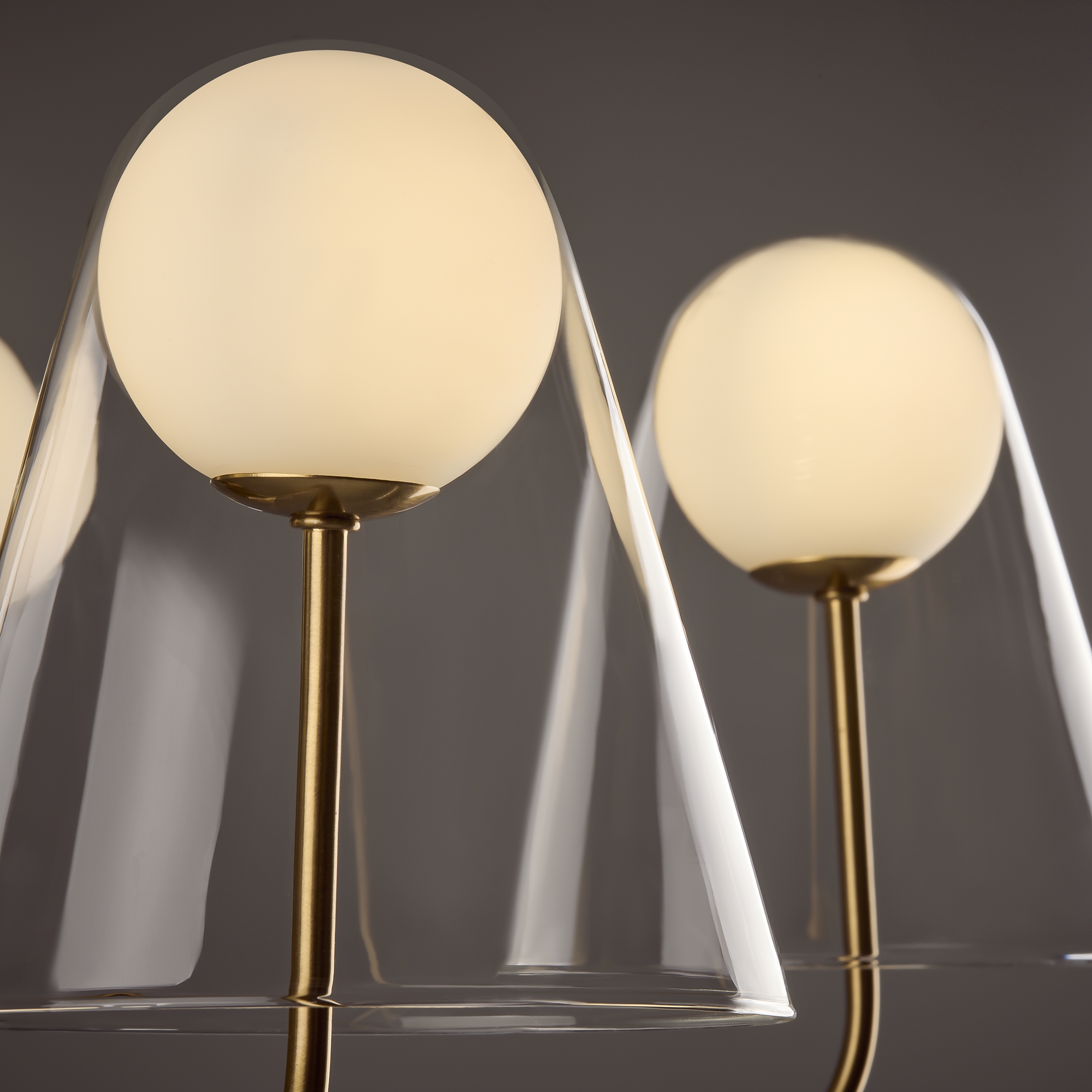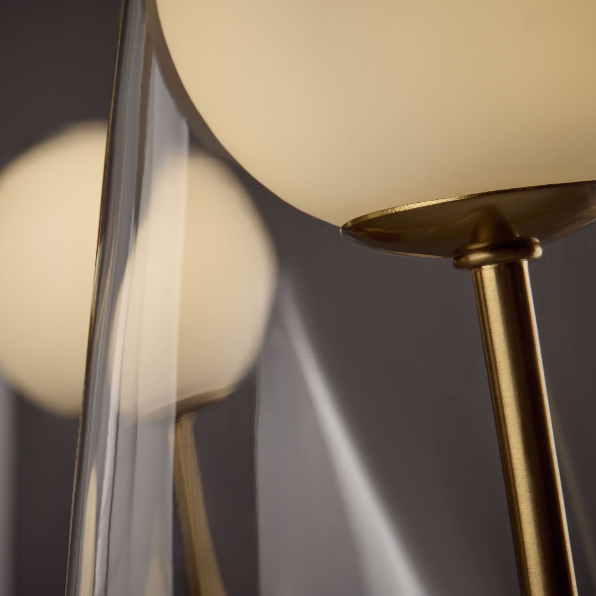 Арматура — металл, цвет — латунь. Двойные плафоны из стекла. Внешний — прозрачный в форме конуса плавно обрамляет контуры внутреннего матового сферического плафона. Свежий взгляд в дизайне на комбинацию форм и фактур. Источником света служит лампа с цоколем G9.