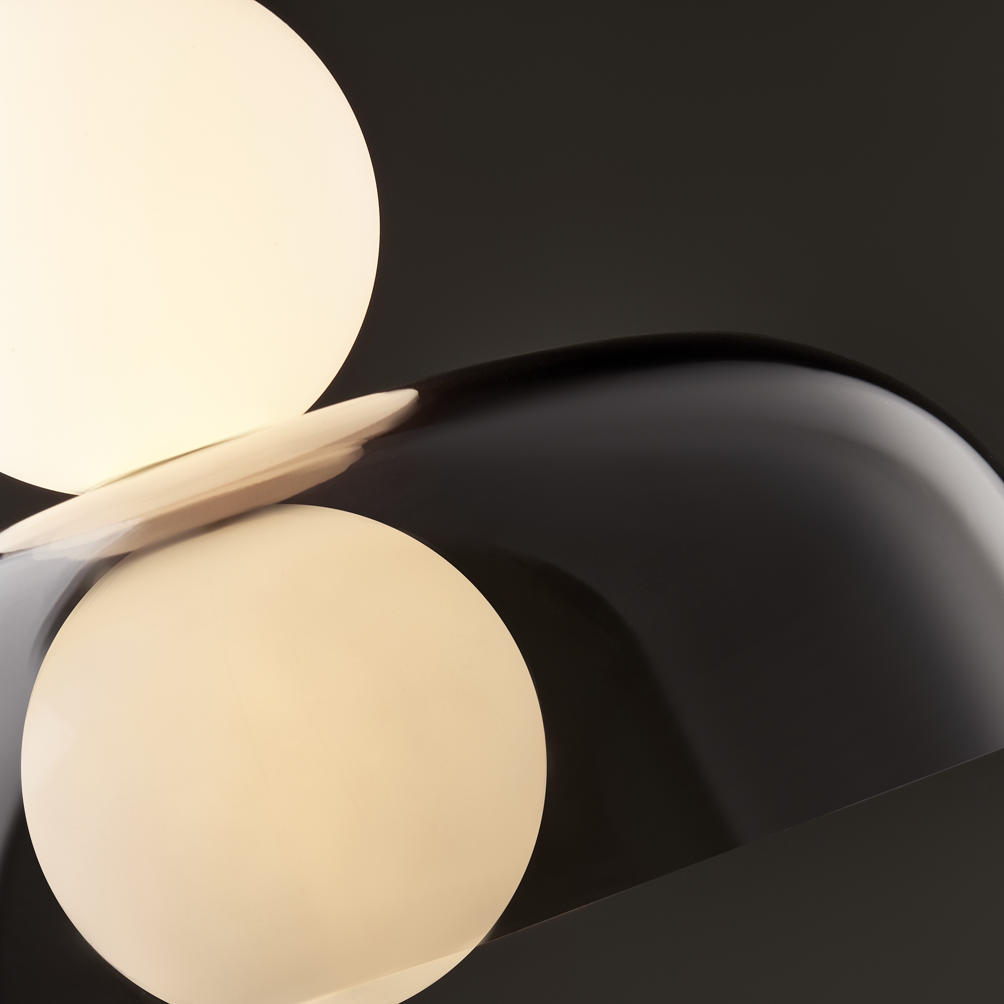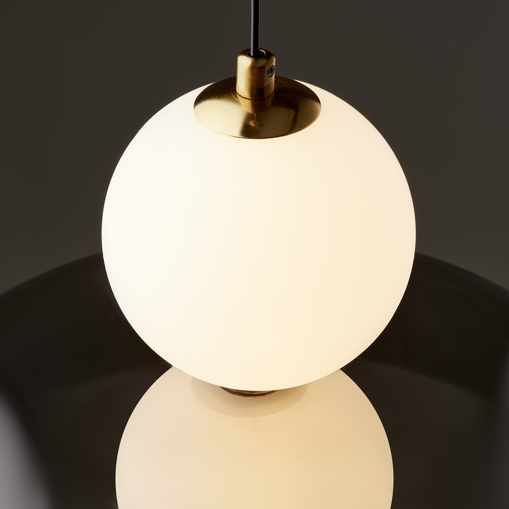 Арматура - металл, цвет - латунь. Стеклянные плафоны в виде сдвоенных матовых “шариков” дополнены широкими декоративными плафонами из стекла двух оттенков: дымчатый и янтарный. LED-источник света. Цветовая температура - 3000К. Светильники подойдут для светлых интерьеров и детских комнат.