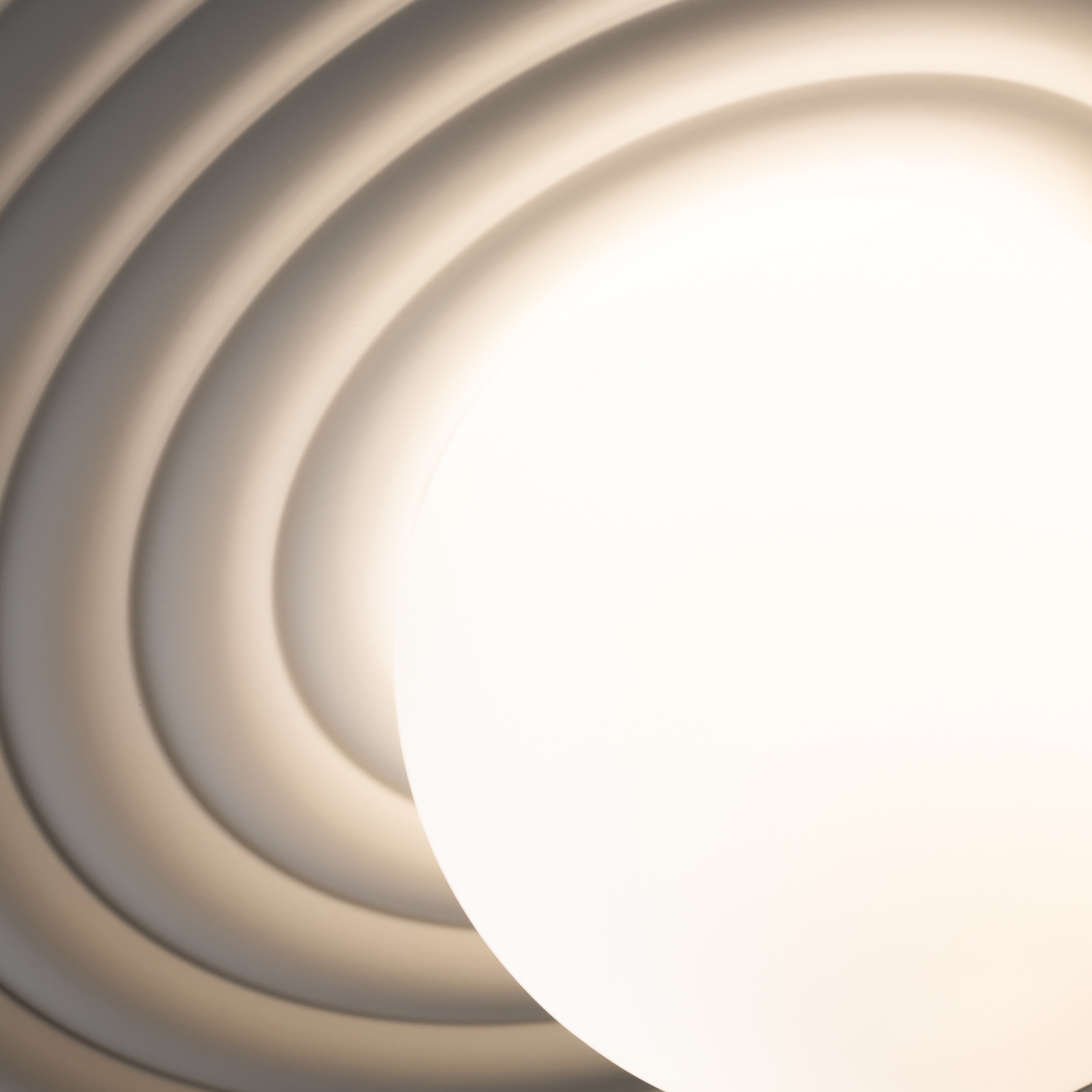 Арматура — металл, цвета — чёрный и белый. Матовый белый плафон с декоративным элементом — металлической тарелкой. Можно регулировать минимальную и максимальную высоту. Лампа с цоколем G9 служит источником света.