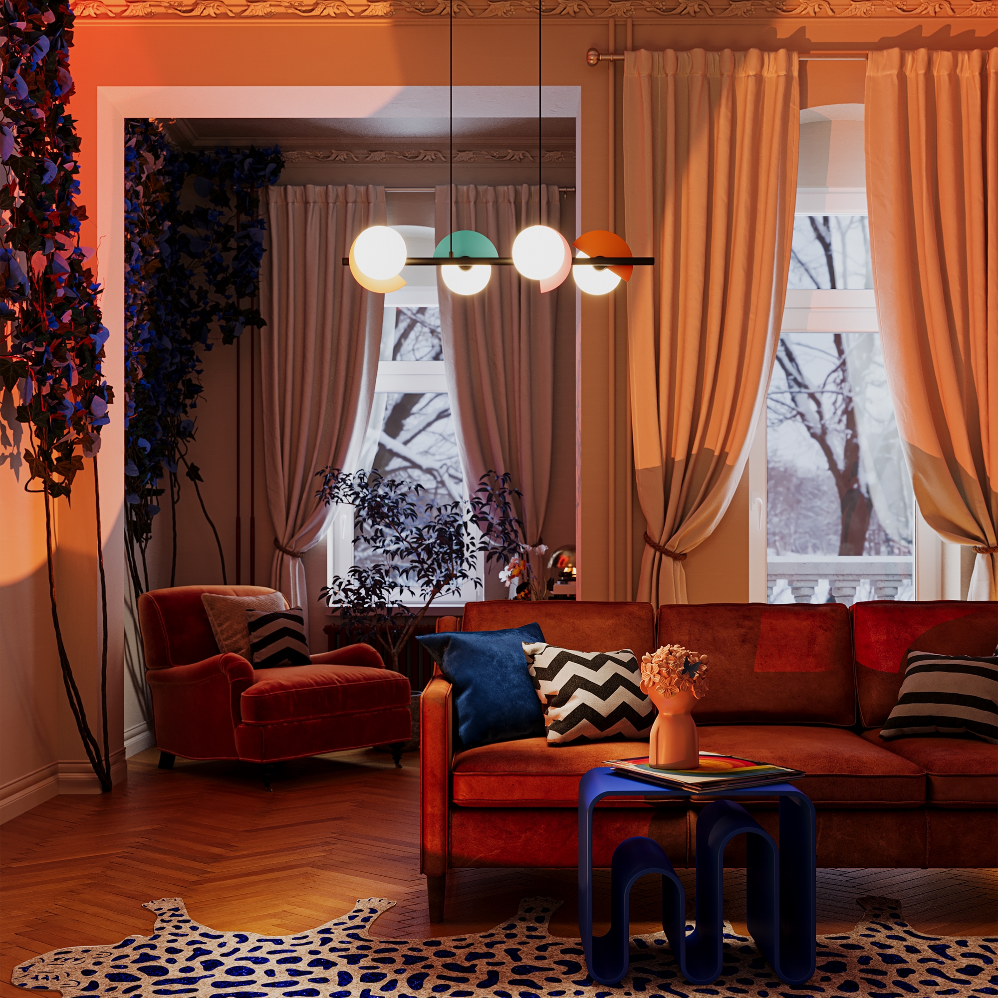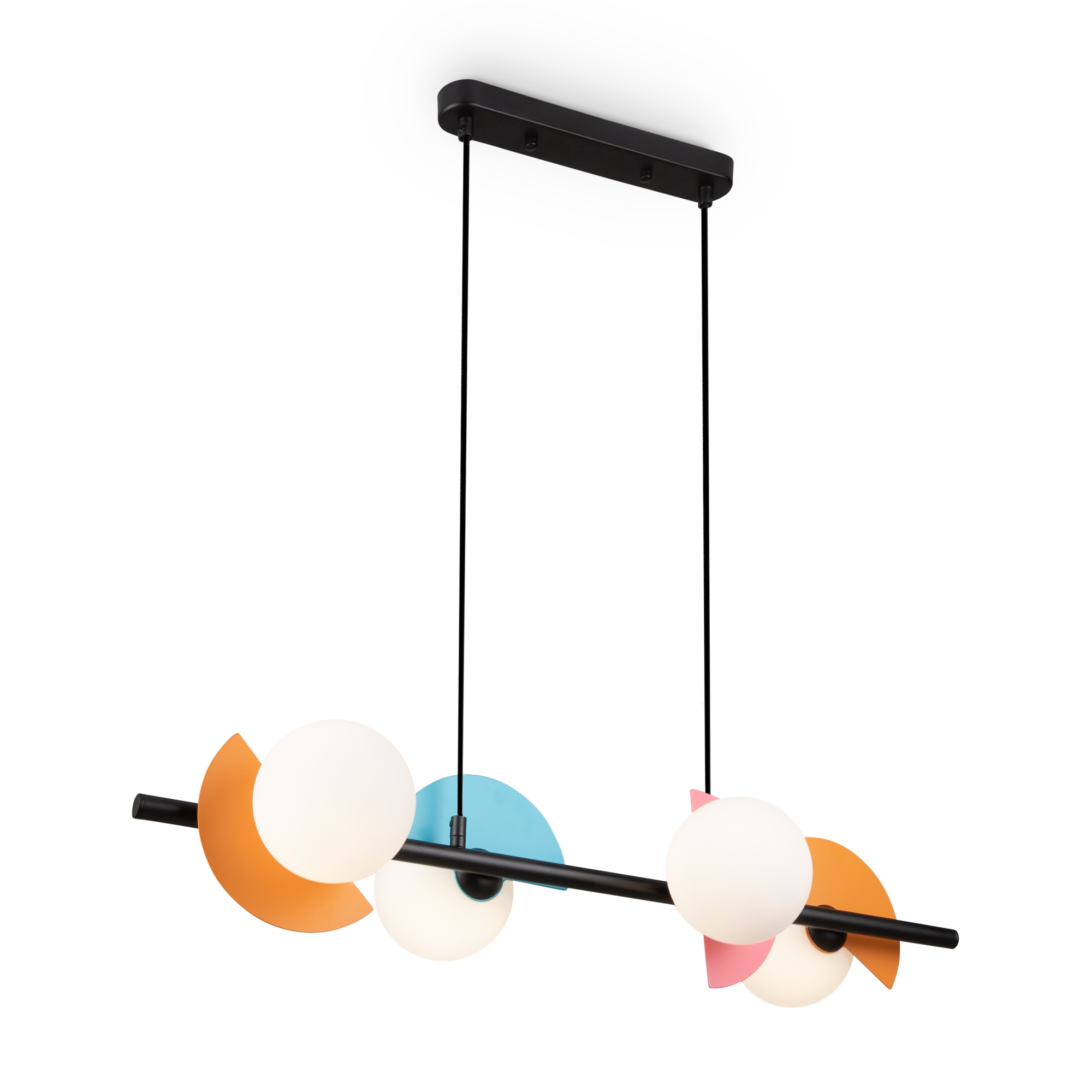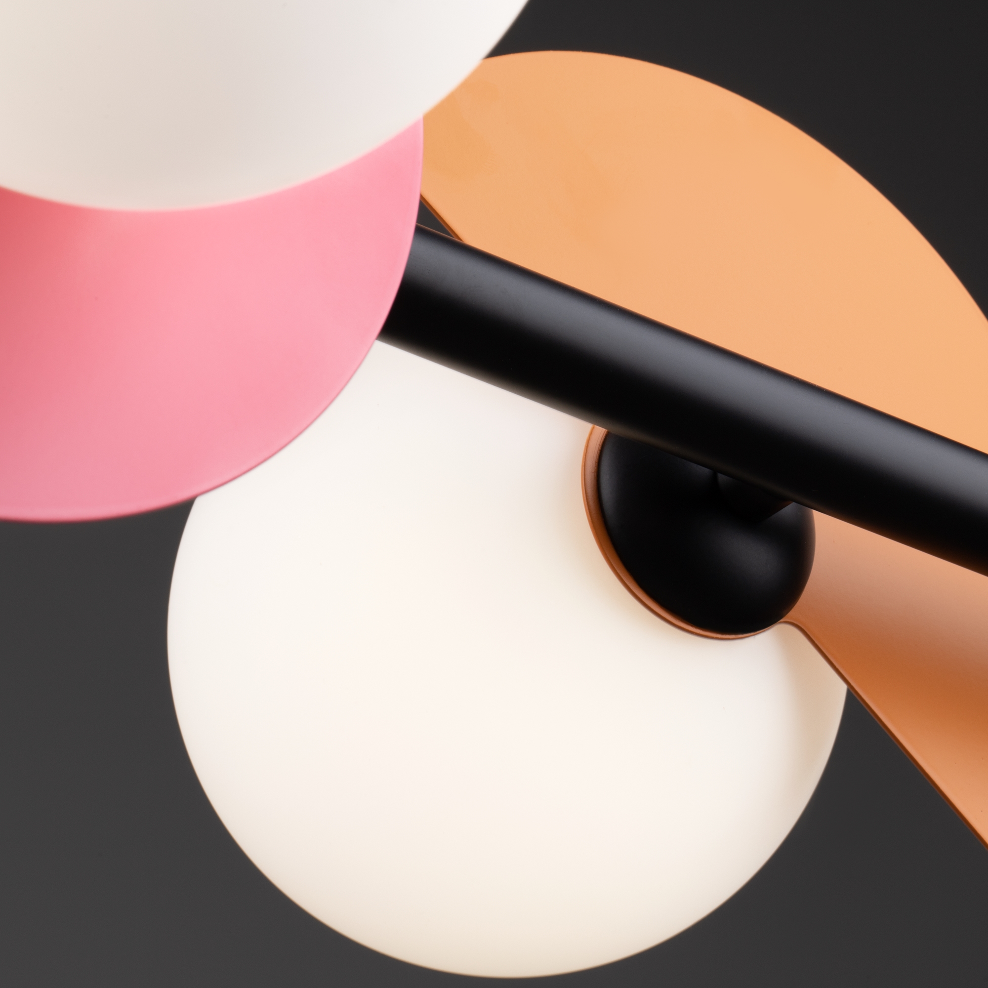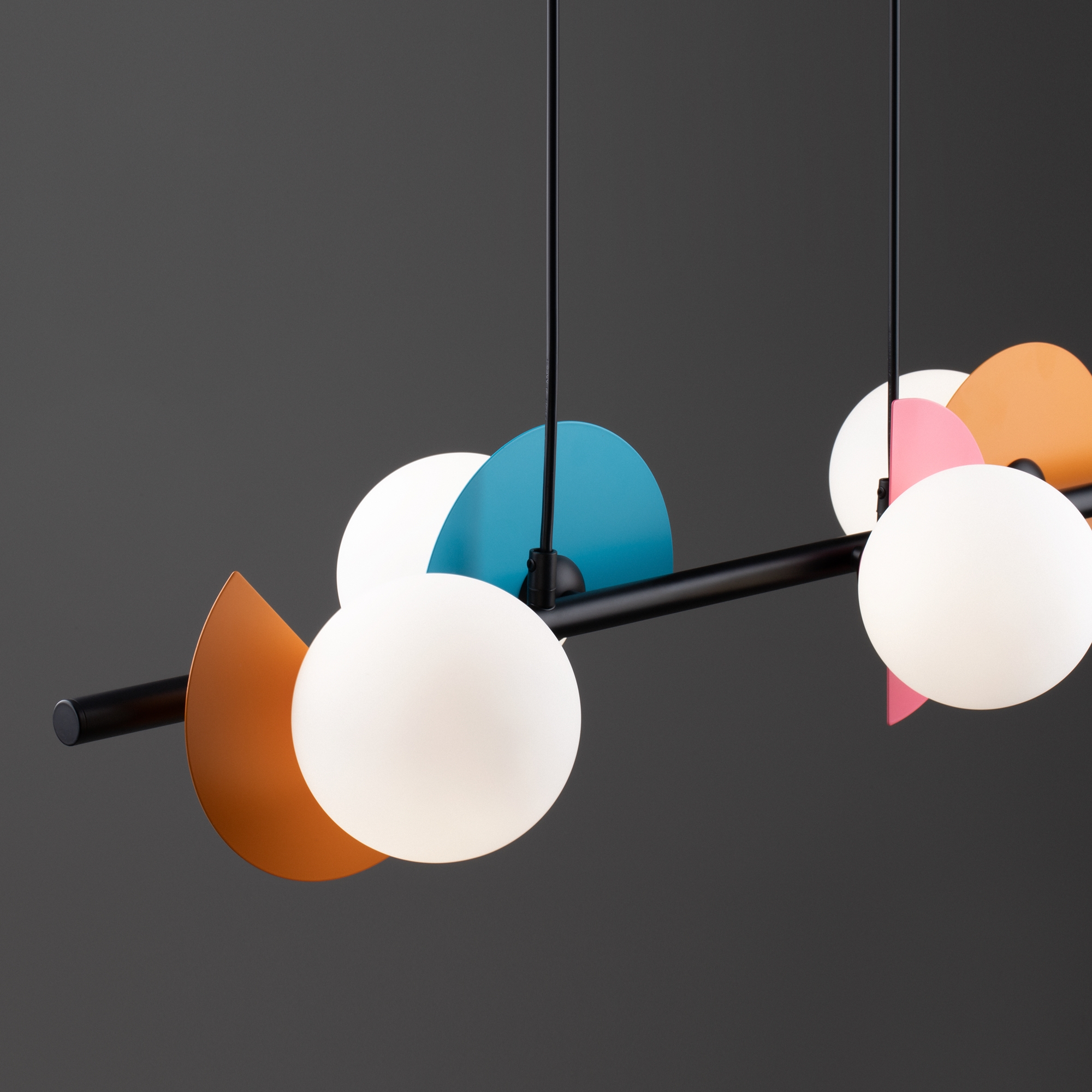 Арматура — металл, цвет — разноцветный или латунь. Белые матовые плафоны из стекла украшены металлическими золотыми или цветными лепестками. Динамичный дизайн для интерьеров в стиле Мемфис. Разнообразие форм в одной конструкции позволяет создать яркое освещение в больших комнатах. Высота регулируется. Источником света служит лампа с цоколем G9.