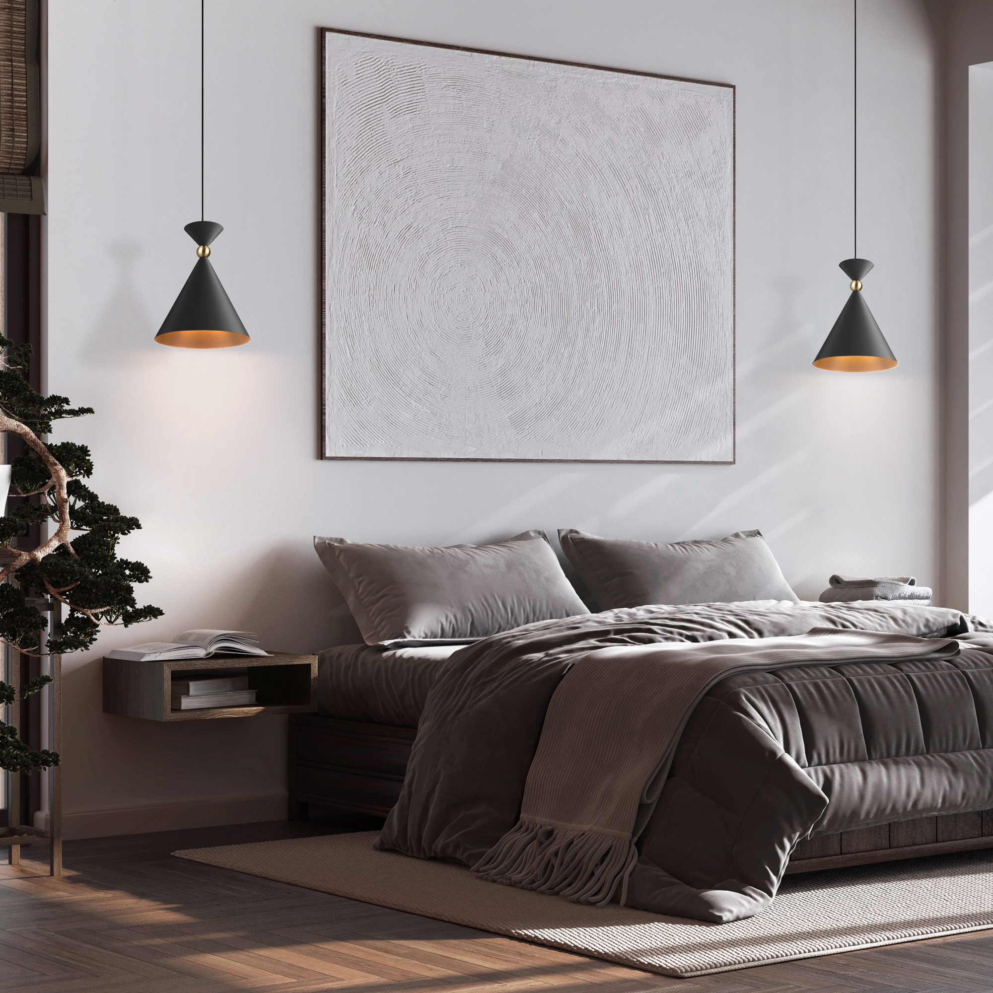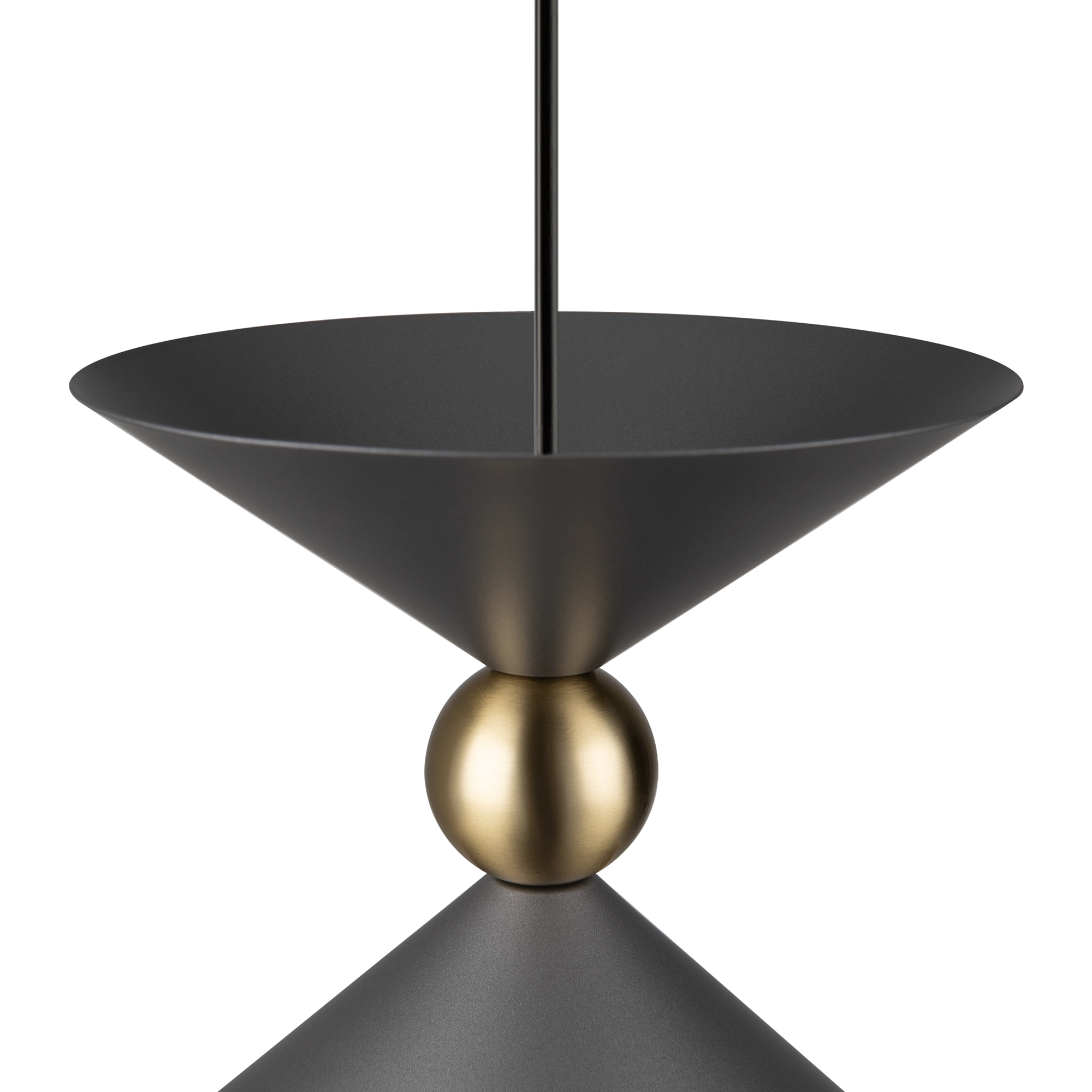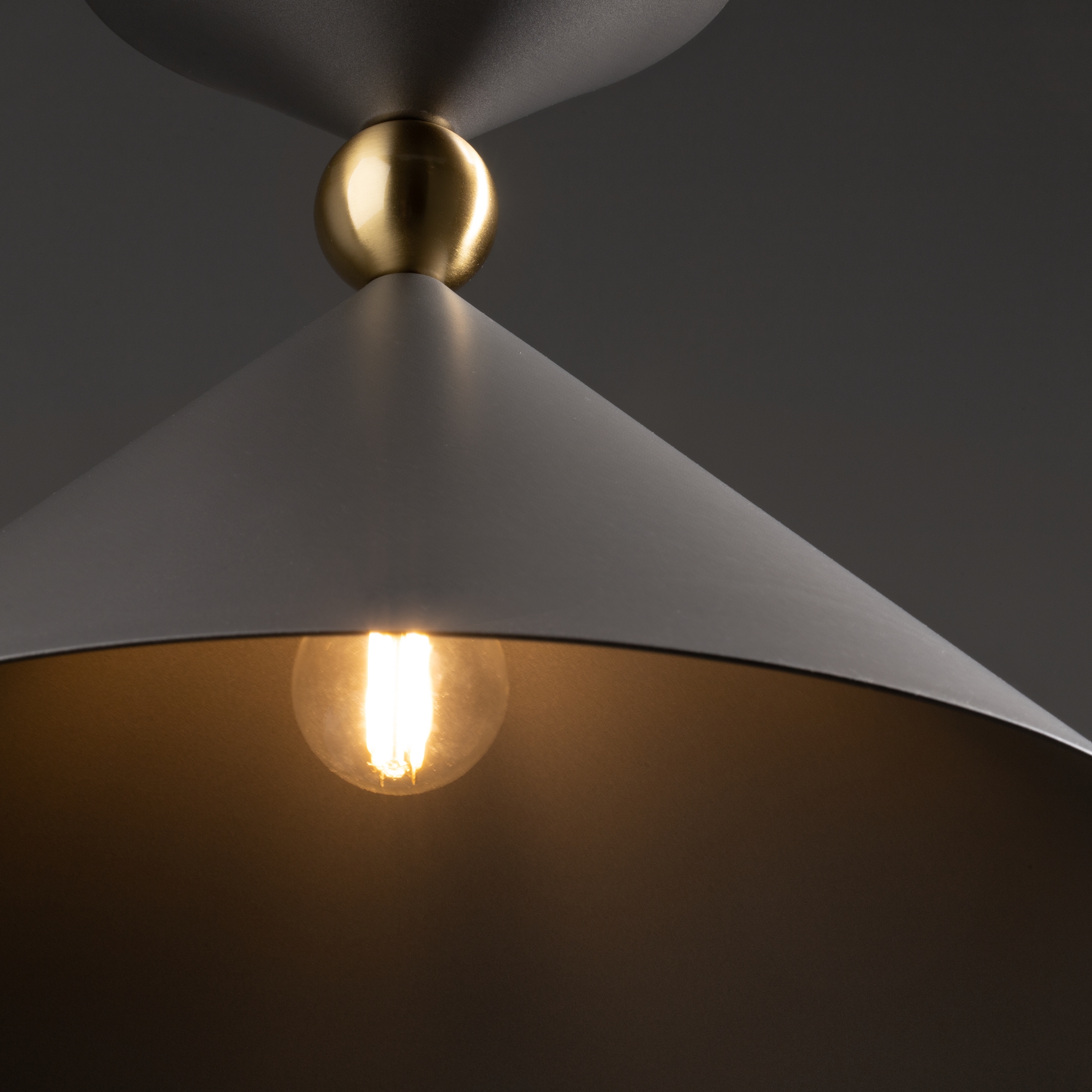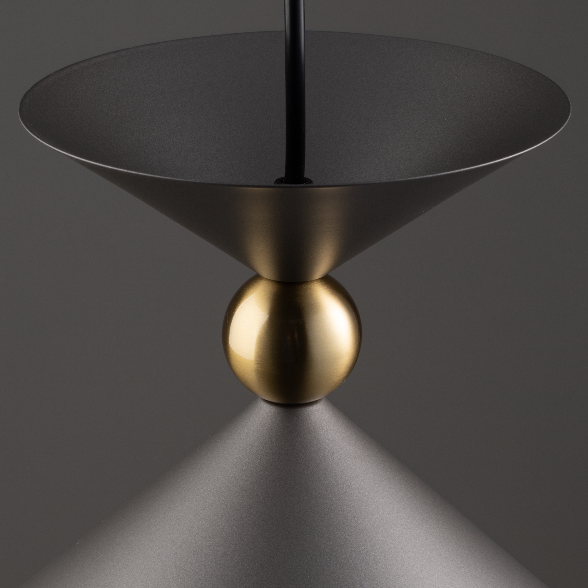 Арматура и плафоны из металла в двух цветах — белом и сером. Плафон состоит из 2-х конусов разных размеров, соединённых золотистым декоративным элементом. Высота регулируется. Идеальны для составления композиций. Источник света — лампа с цоколем Е27.