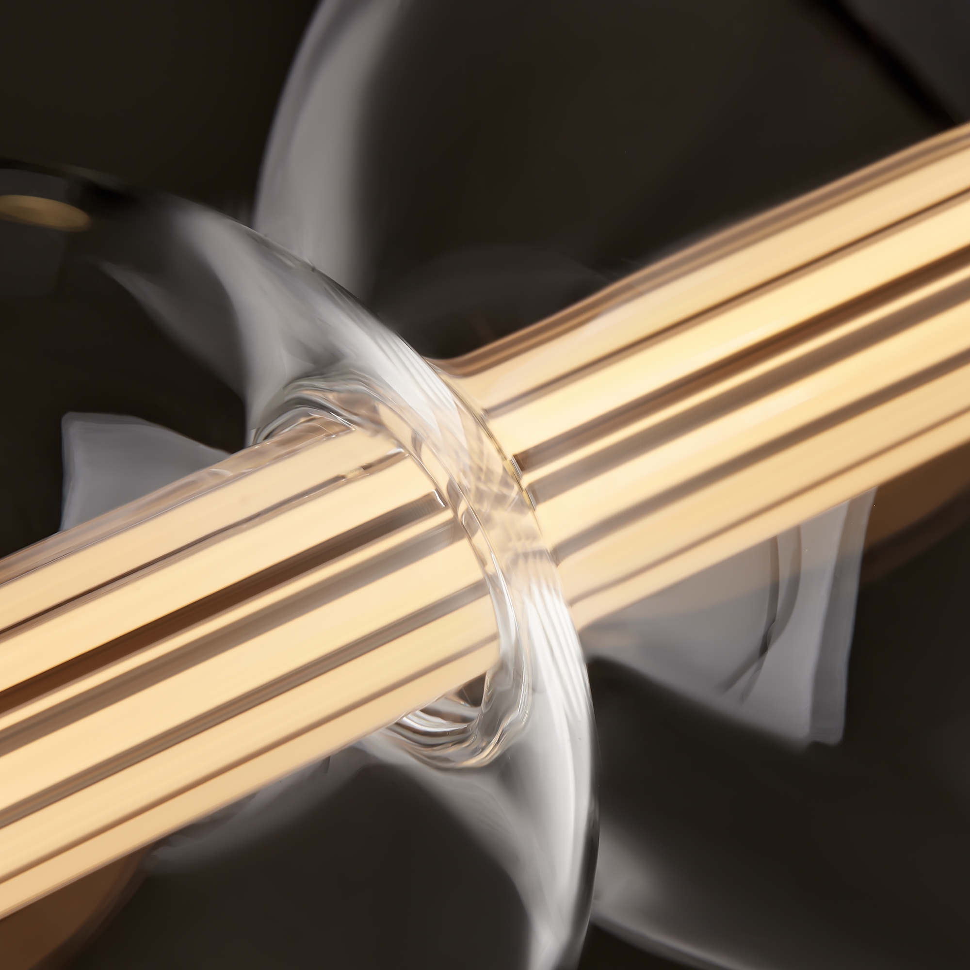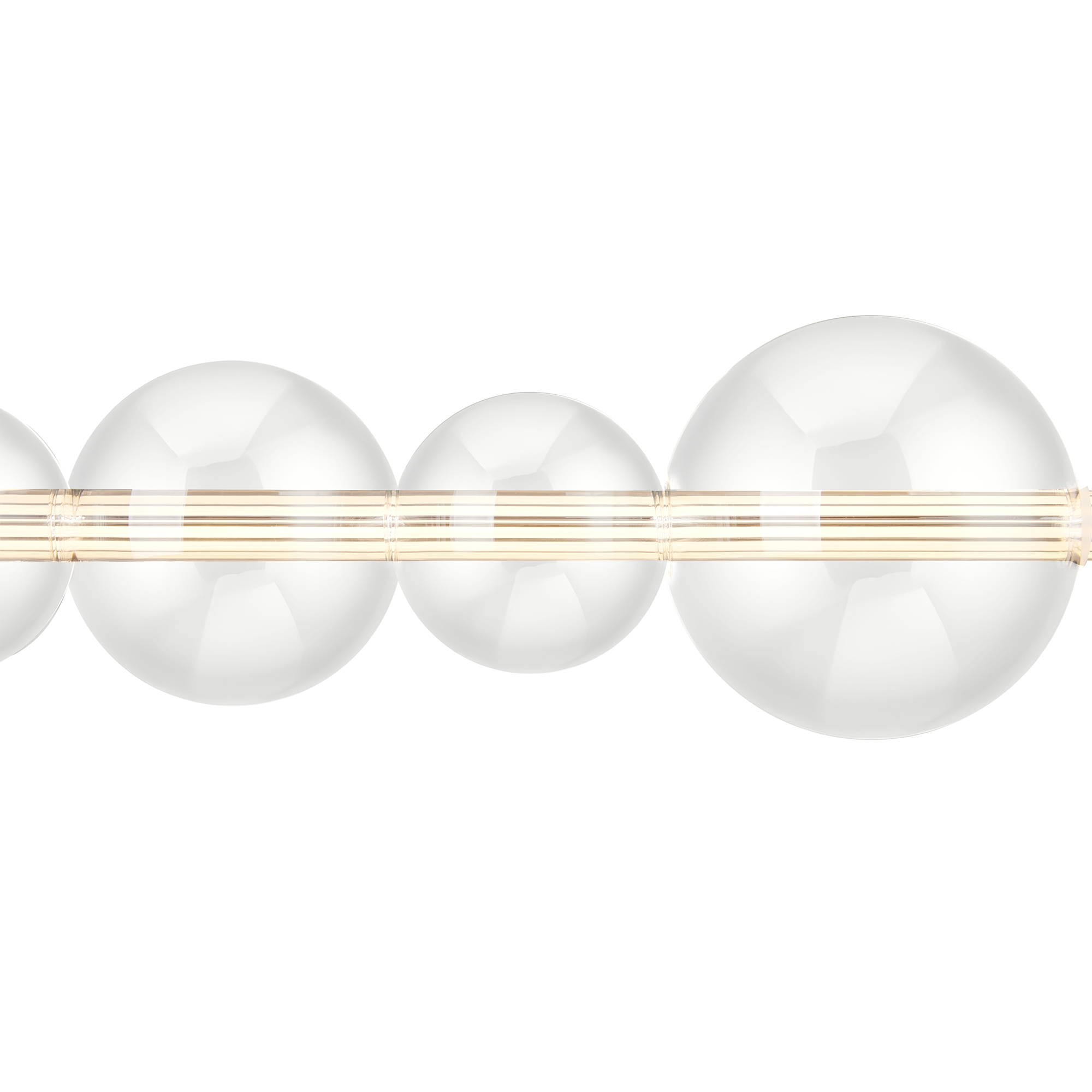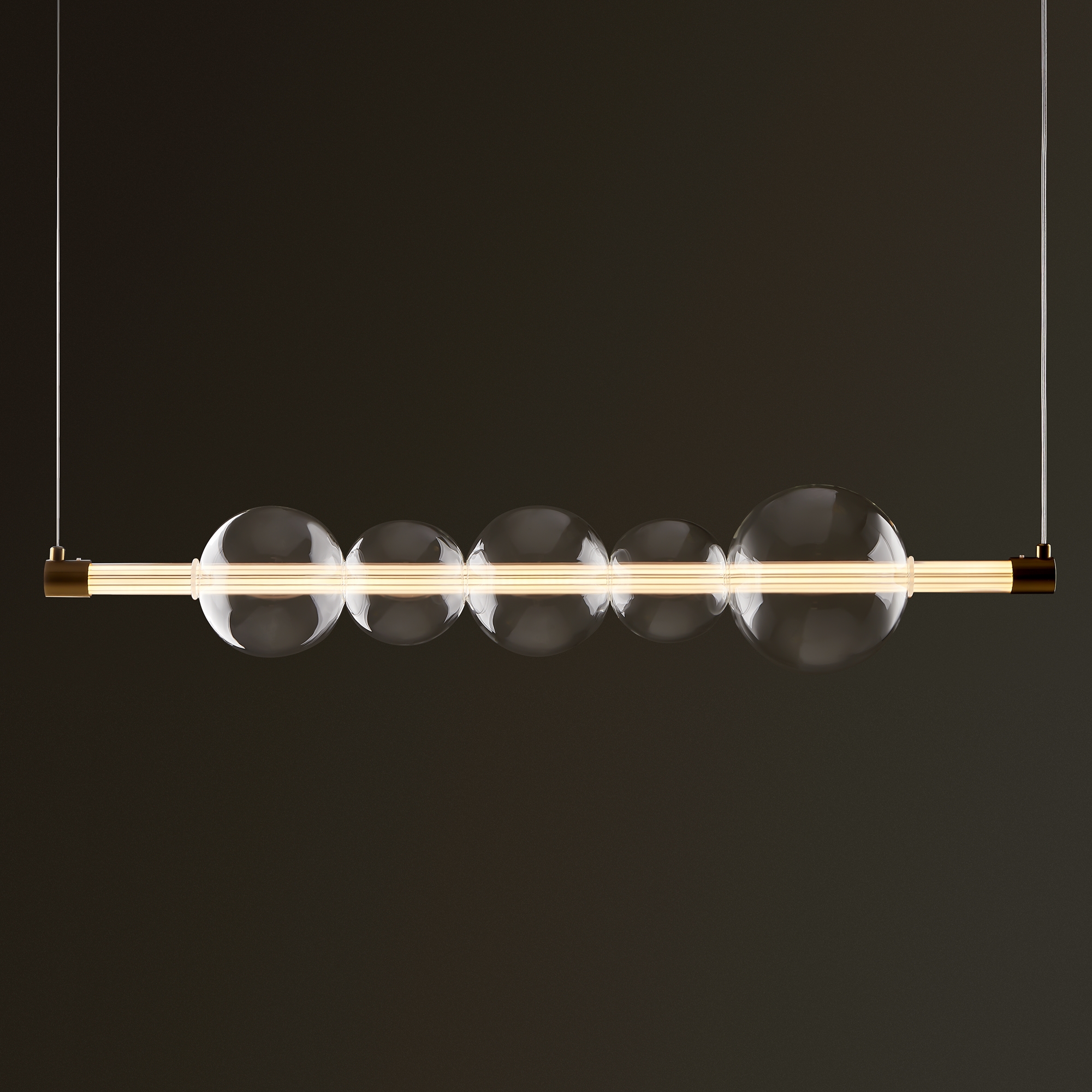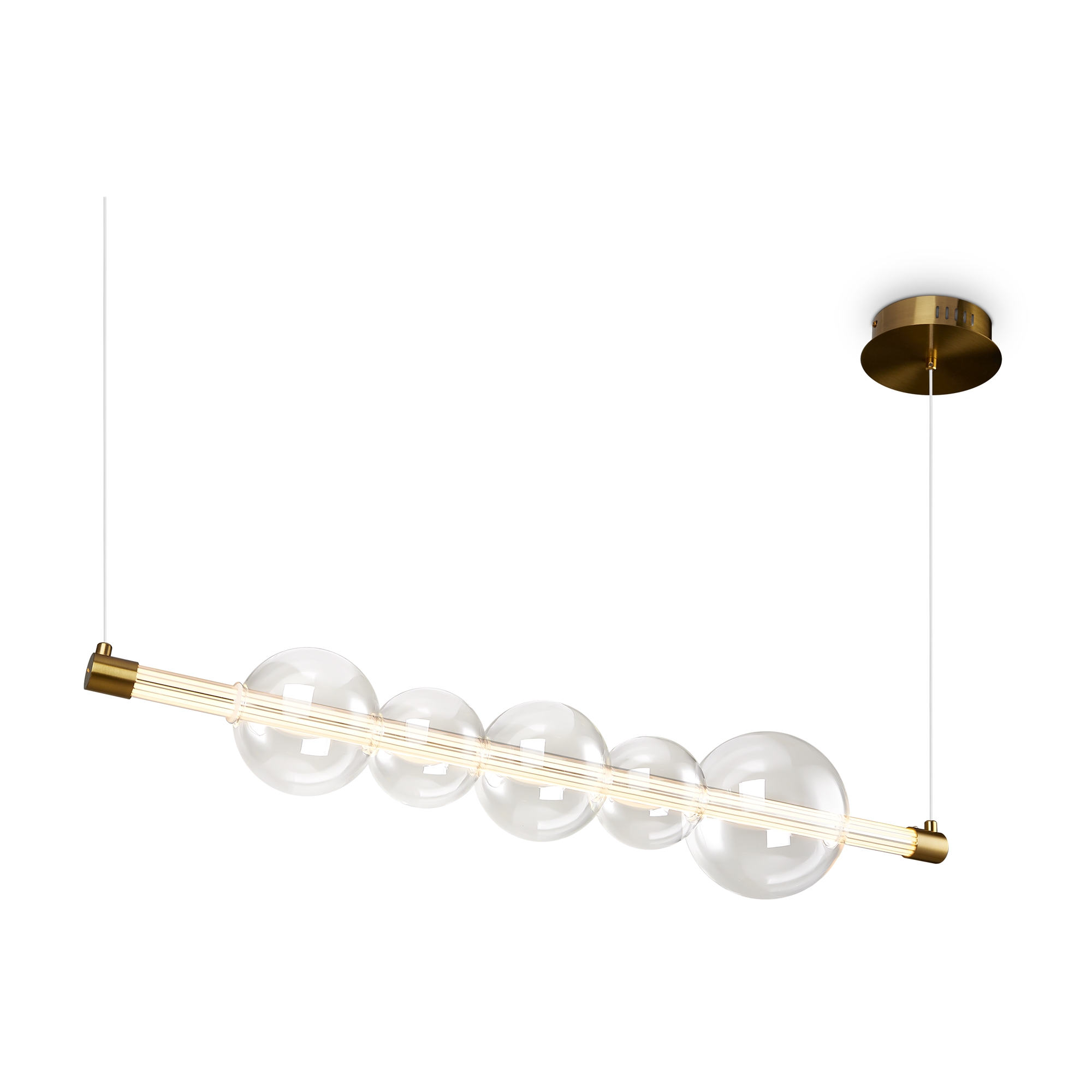 Арматура — металл, цвет — латунь. Тренд «invisible light» - LED-источник света скрыт в горизонтальной стеклянной трубке, пронизывая ряд декоративных плафонов-шаров разного размера из прозрачного стекла. Воздушная минималистичная горизонтальная конструкция. Регулируемая высота. Цветовая температура - 3000К.