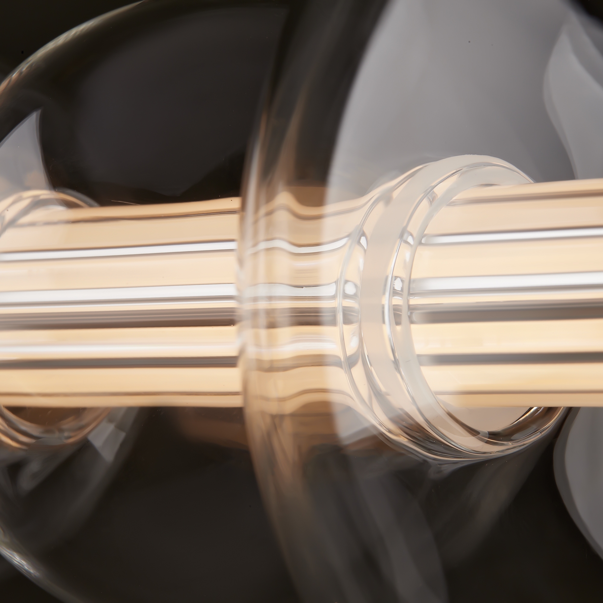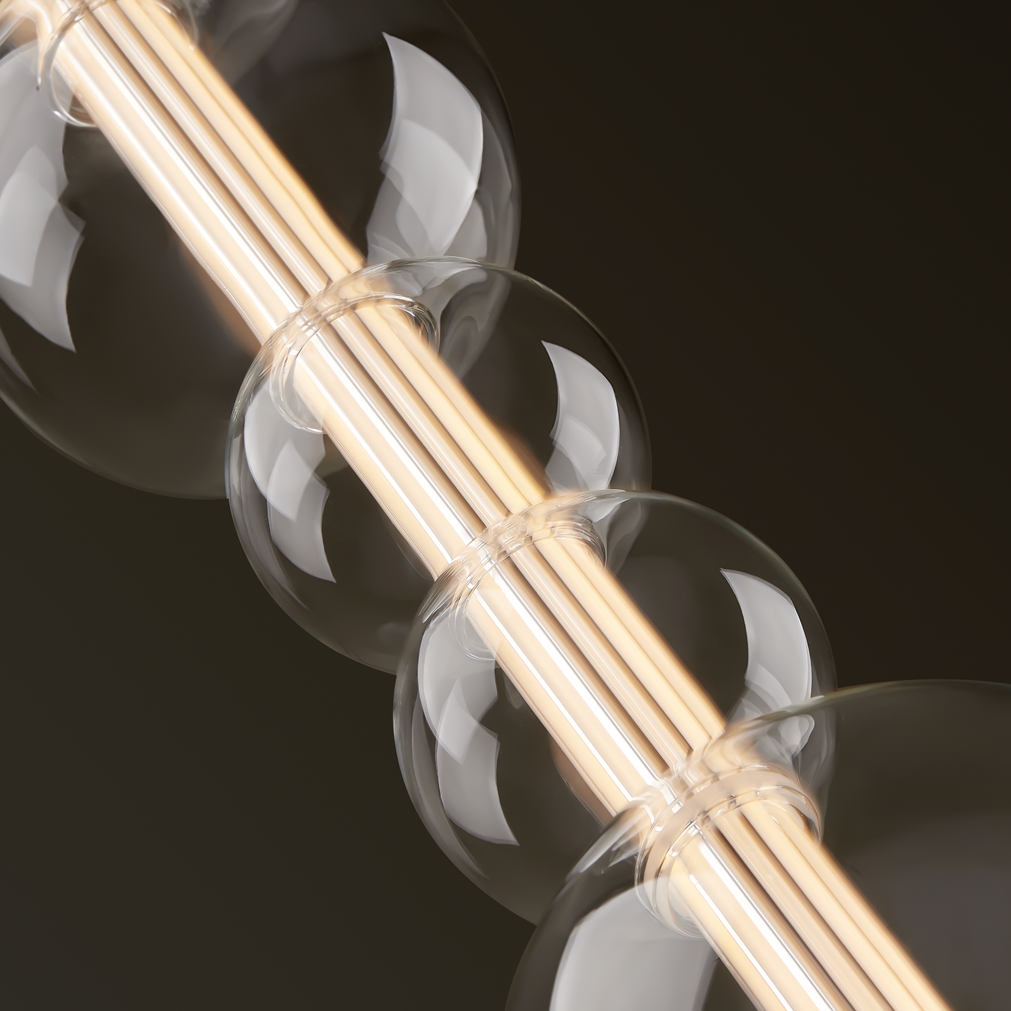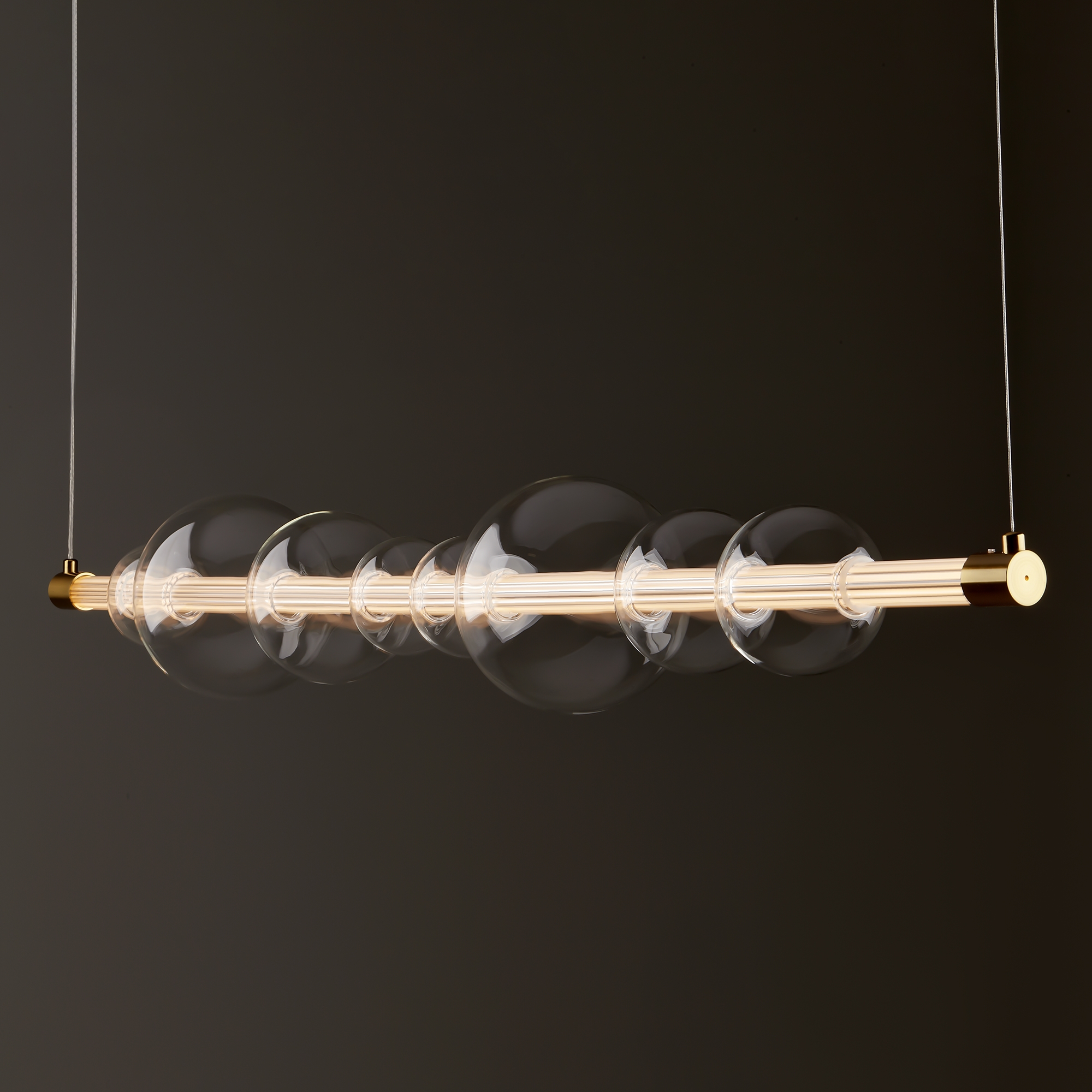 Арматура — металл, цвет — латунь. Тренд «invisible light» - LED-источник света скрыт в горизонтальной стеклянной трубке, пронизывая ряд декоративных плафонов-шаров разного размера из прозрачного стекла. Воздушная минималистичная горизонтальная конструкция. Регулируемая высота. Цветовая температура - 3000К.