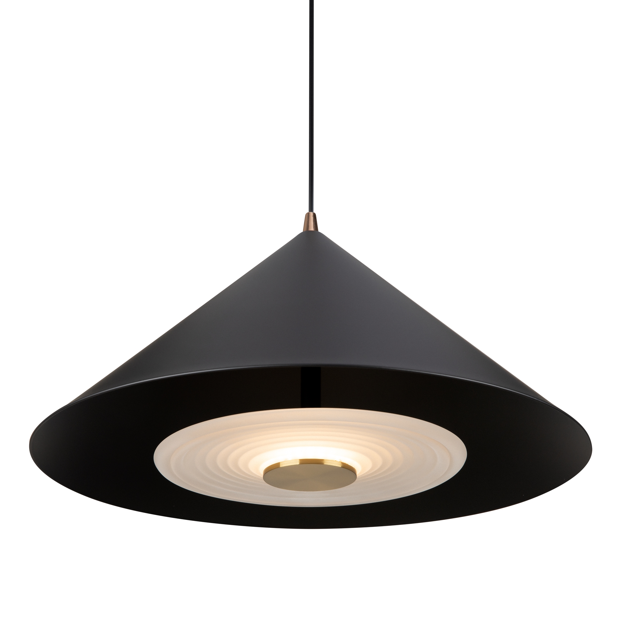 Металлическая арматура, цвета — чёрный и белый. Плафоны — конусовидные, среднего размера. Универсальный минималистичный дизайн, регулируемая высота. Светодиодный источник света. Цветовая температура — 3000К.