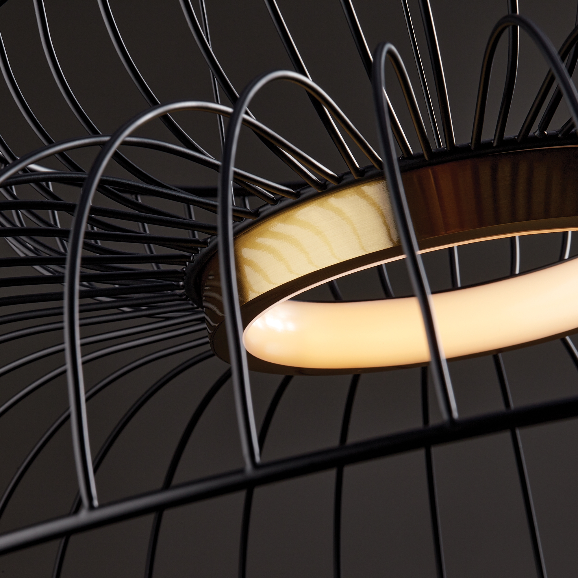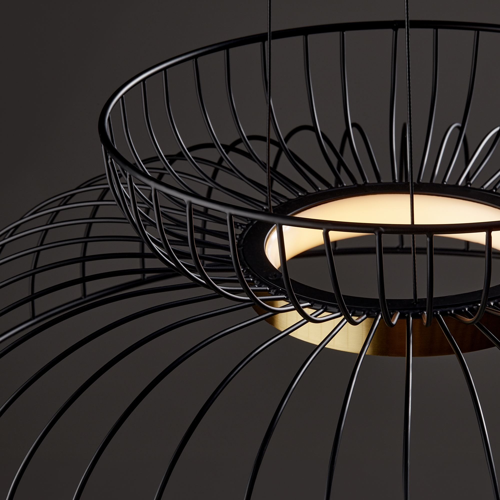 Металлическая арматура чёрного цвета. LED-источник света обрамлен декоративным металлическим кольцом цвета латунь. Минималистичный дизайн - хорошо сочетается с другими осветительными приборами. Высота подвеса регулируется. Цветовая температура - 3000К.