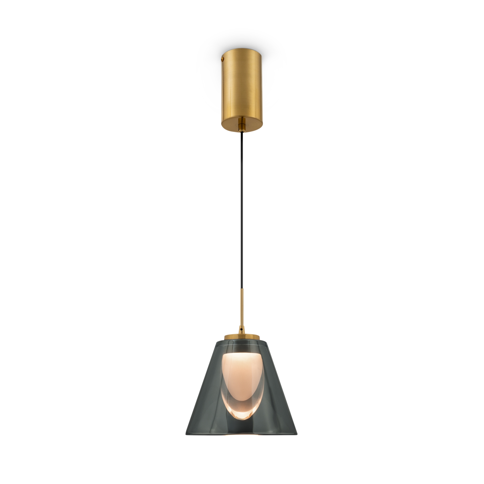 Арматура — металл, цвет — латунь. Плафоны из прозрачного стекла с дымчатым оттенком в форме овала, круга или конуса. Универсальный минималистичный дизайн позволяет составлять комбинации из нескольких подвесов. Регулируемая высота. Тренд «invisible light» - LED-источник света утоплен в основание плафона. Цветовая температура - 3000К.