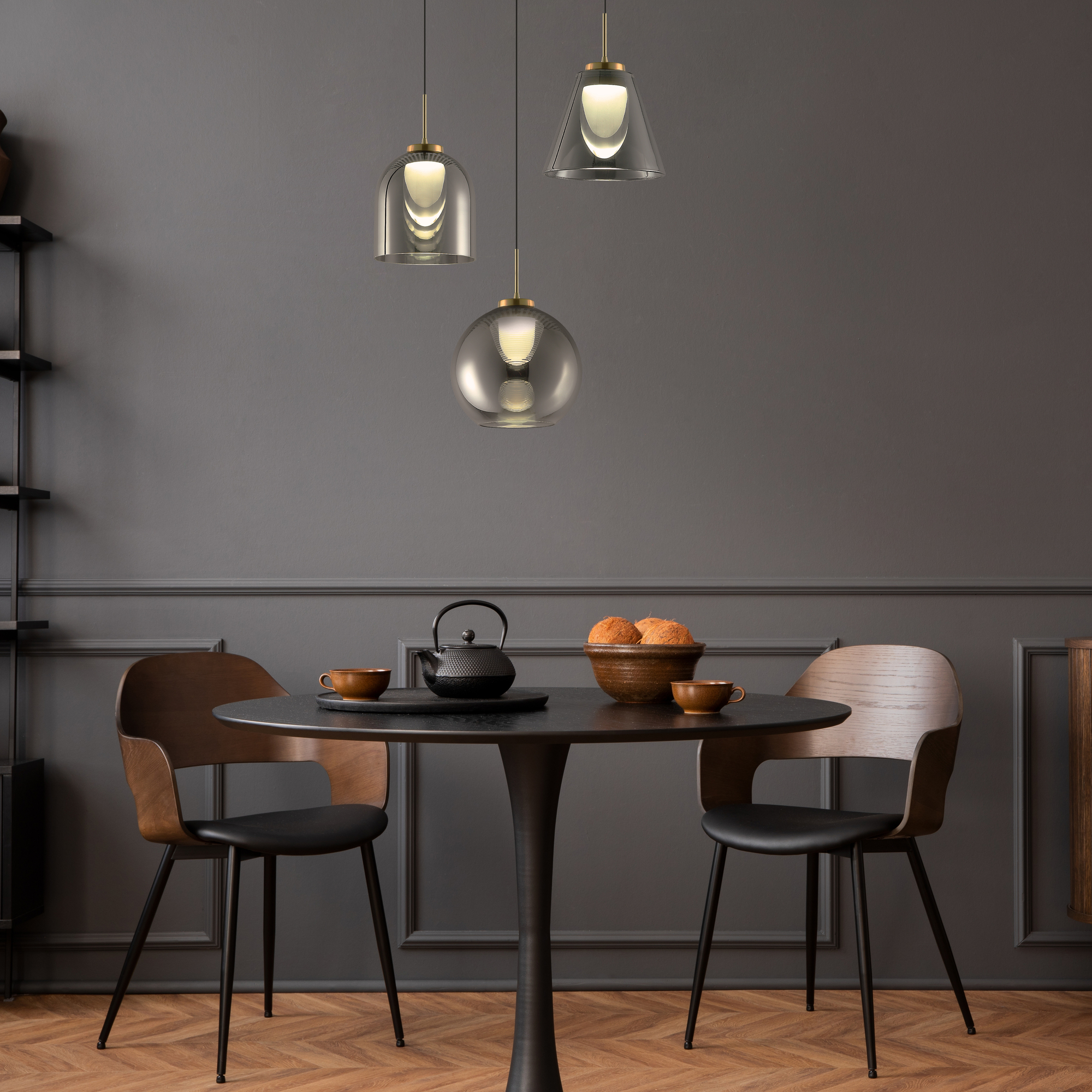 Арматура — металл, цвет — латунь. Плафоны из прозрачного стекла с дымчатым оттенком в форме овала, круга или конуса. Универсальный минималистичный дизайн позволяет составлять комбинации из нескольких подвесов. Регулируемая высота. Тренд «invisible light» - LED-источник света утоплен в основание плафона. Цветовая температура - 3000К.