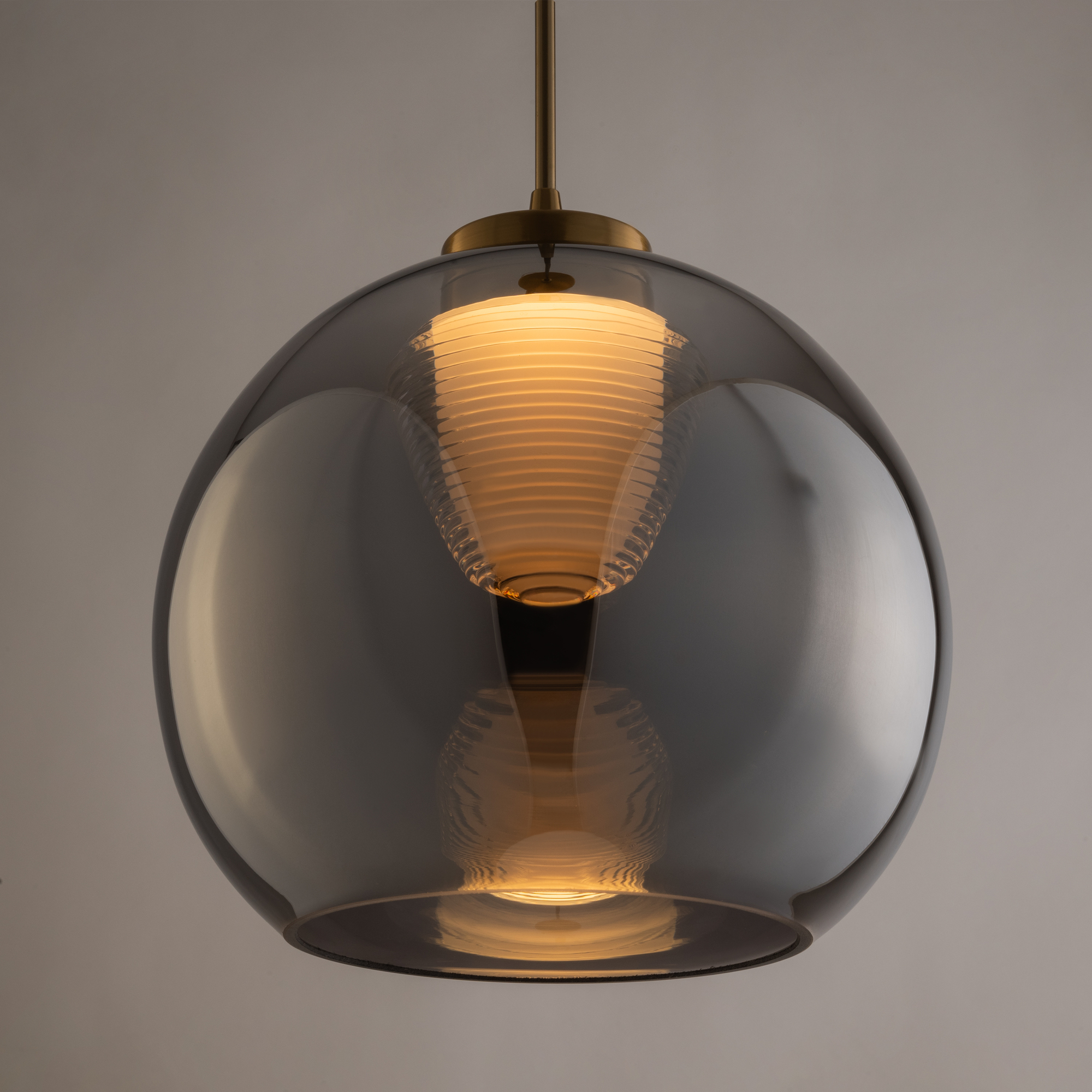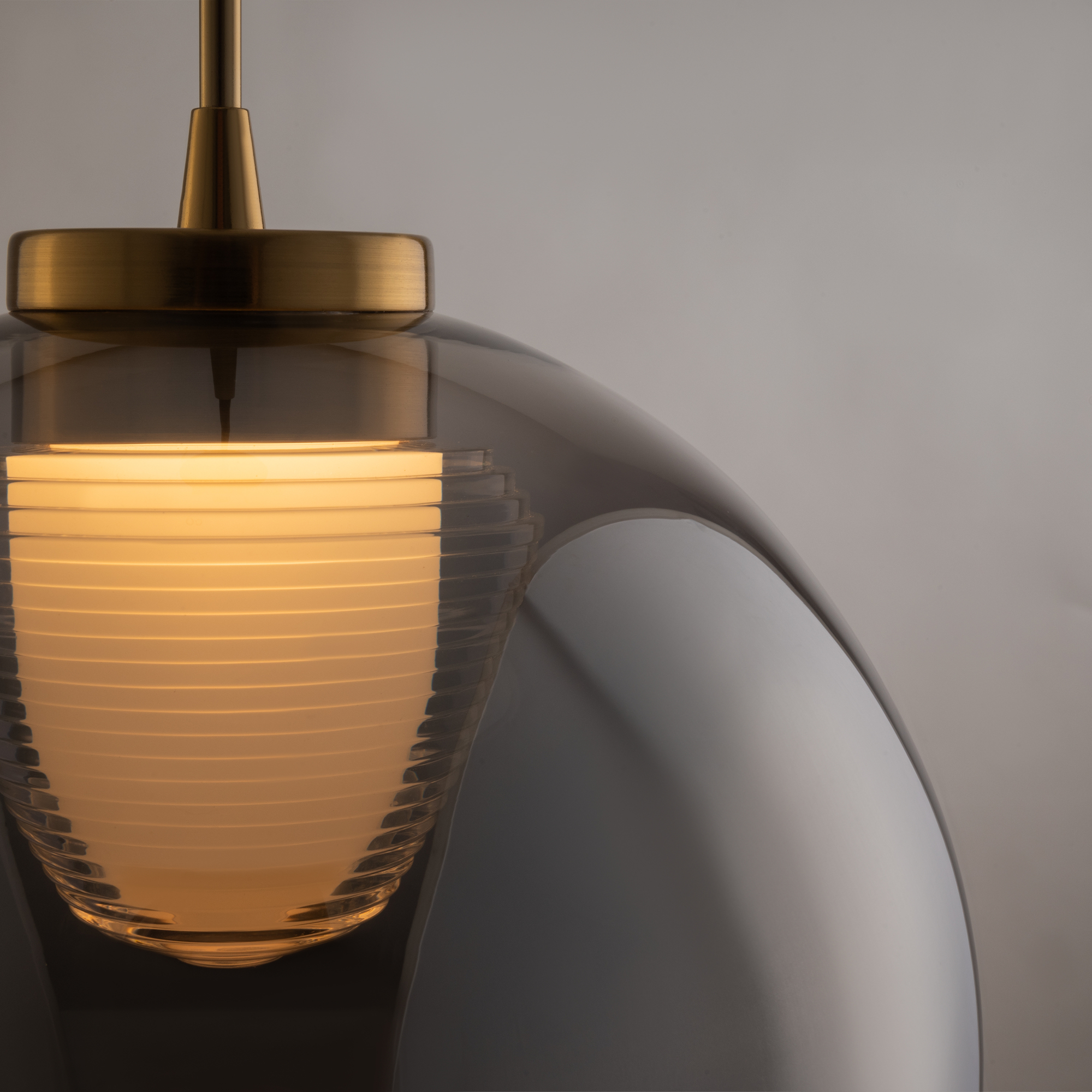Арматура — металл, цвет — латунь. Плафоны из прозрачного стекла с дымчатым оттенком в форме овала, круга или конуса. Универсальный минималистичный дизайн позволяет составлять комбинации из нескольких подвесов. Регулируемая высота. Тренд «invisible light» - LED-источник света утоплен в основание плафона. Цветовая температура - 3000К.