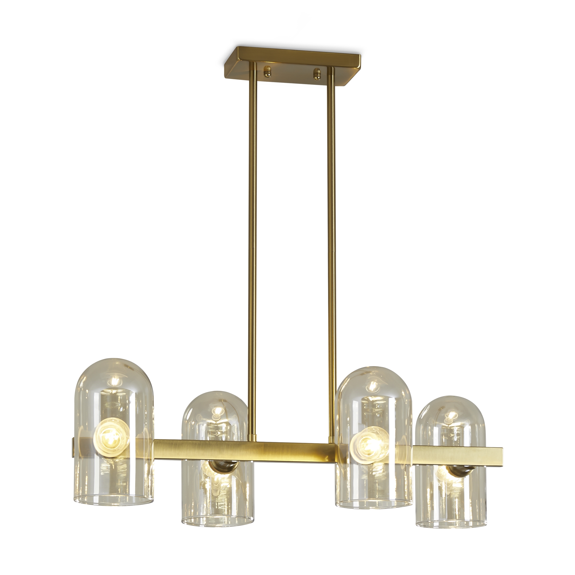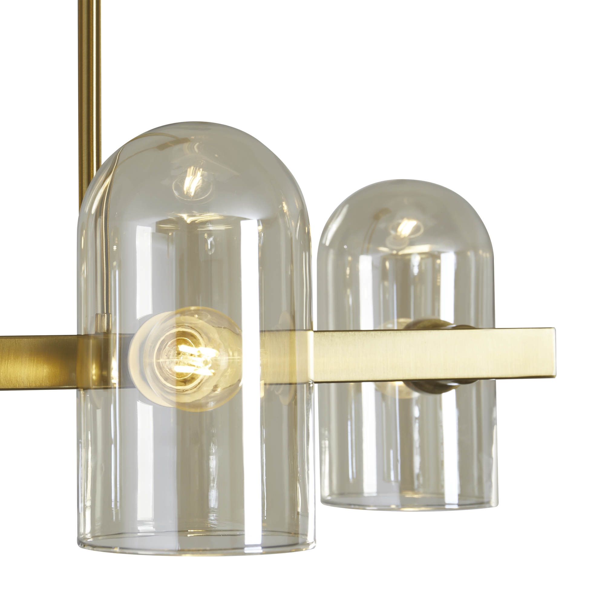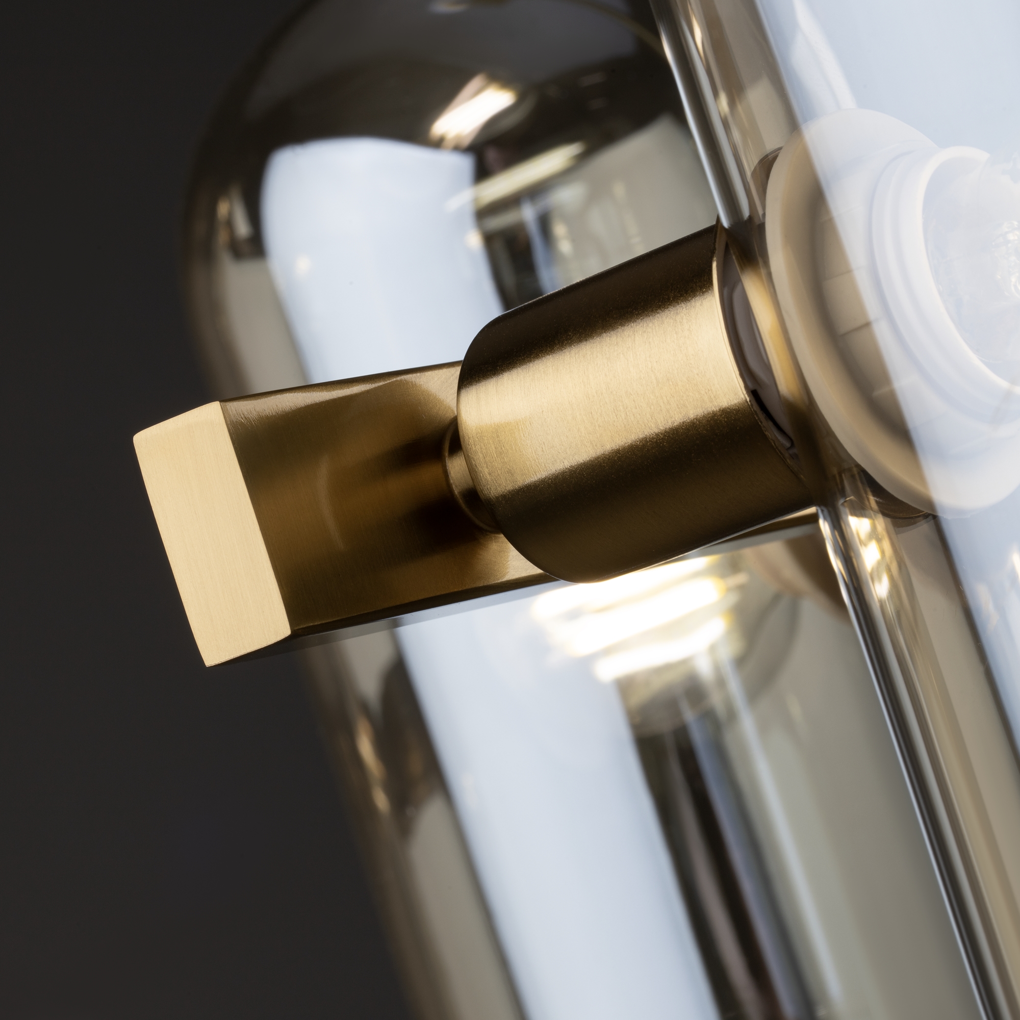 Арматура — металл. Цвет — латунь. Горизонтальные подвесы на твердой ножке. Плафоны из коньячного стекла в форме конуса. Направление плафона у настенного светильника можно регулировать за металлическое основание. Источник света лампа. Цоколь E14.
