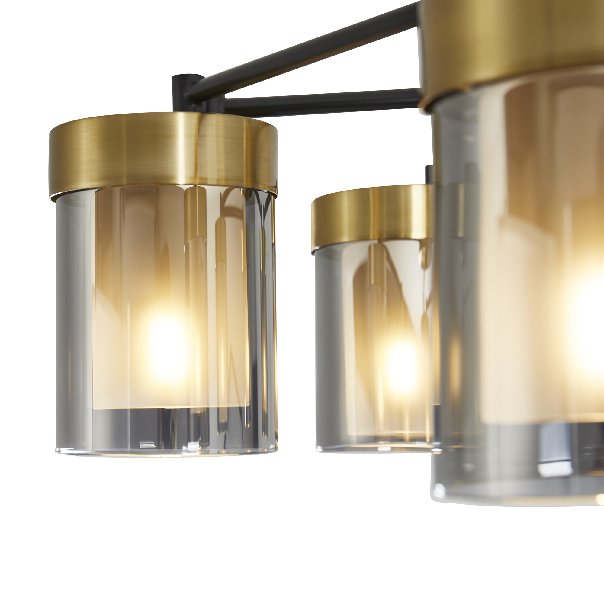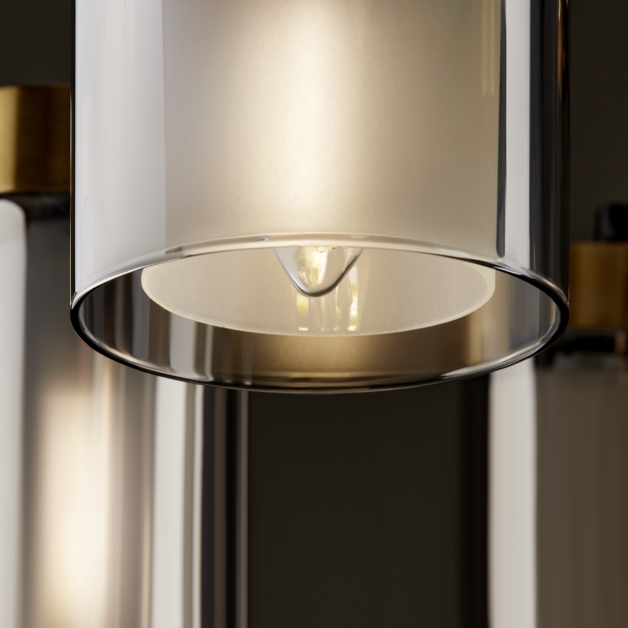 Арматура - металл в двух востребованных оттенках латунь и черный. Плафоны из двойного стекла дымчатого оттенка, внутри белый матовый. Трендовая форма плафонов в виде цилиндра. Потолочные светильники подойдут для помещений с низкими потолками. Источник света лампа. Цоколь E14