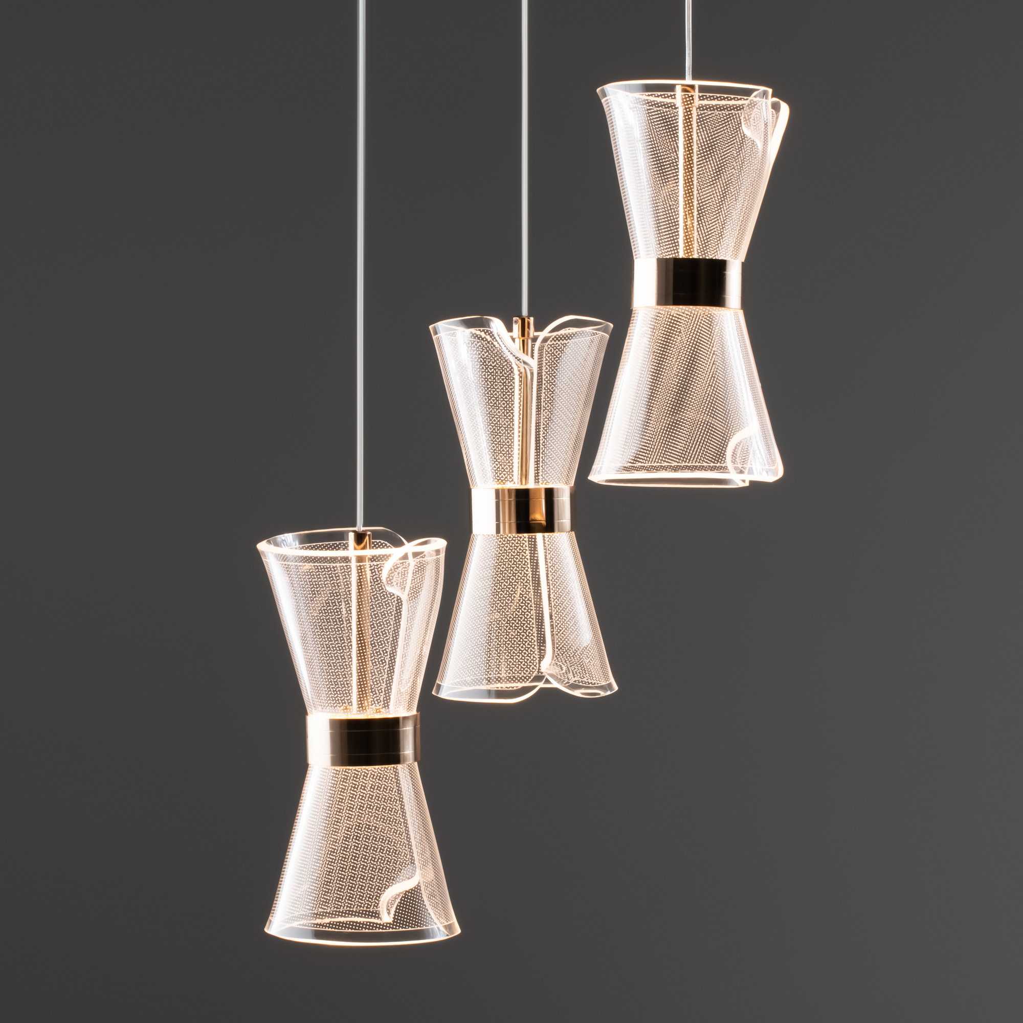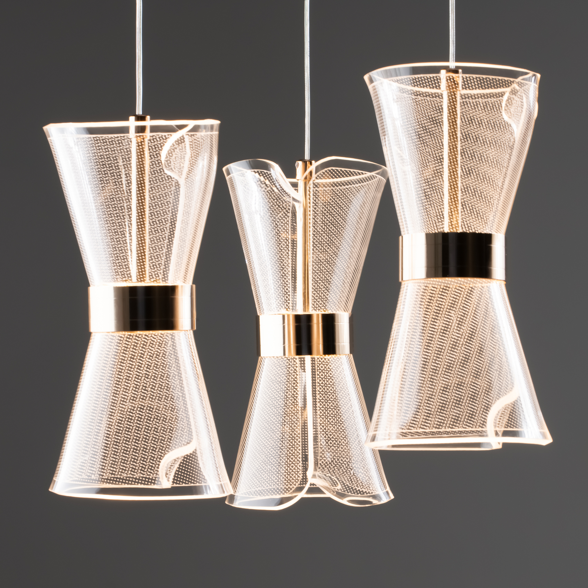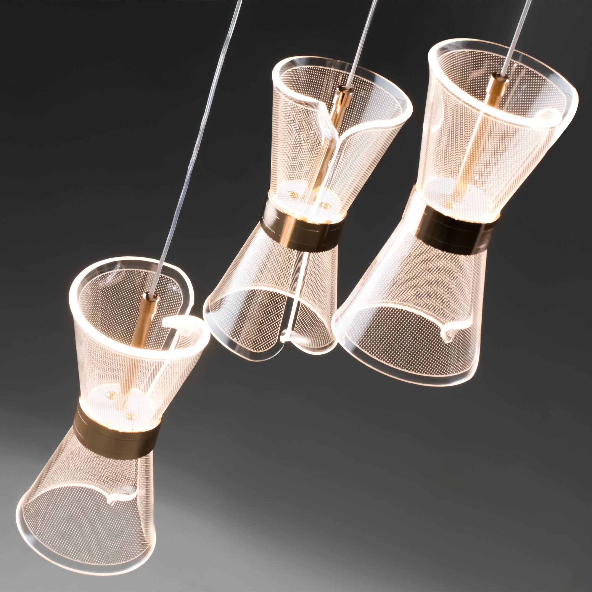 Арматура металл. Цвет золото. Плафоны из акрила. Форма песочные часы. Золотая окантовка как декоративный элемент. К светильникам прилагается пульт управления. LED источник света. Цветовая температура 2600-6000К.