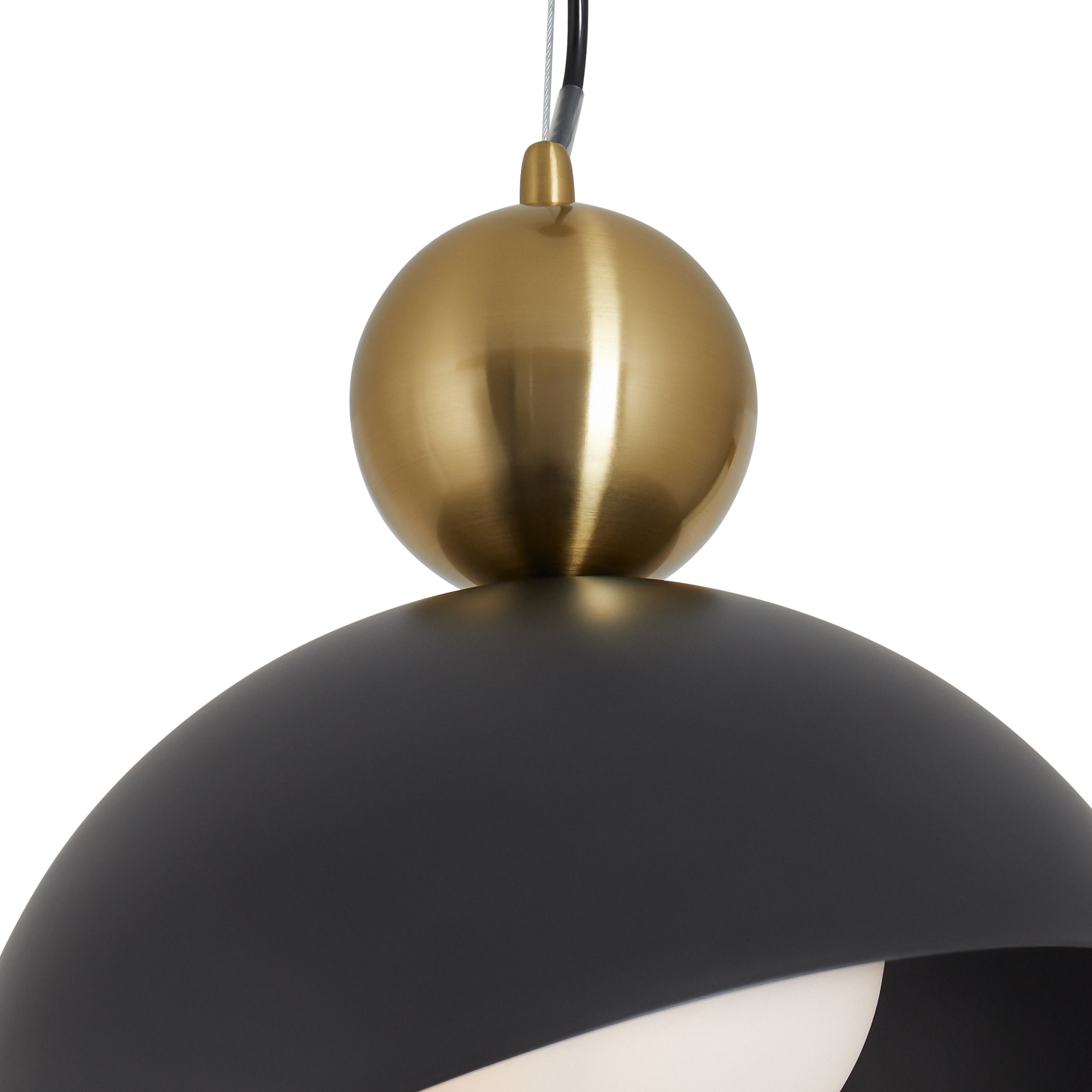 Арматура металл. Цвет арматуры матовый черный, белый. Плафоны металл. Внутри с шаровидным белым плафонов для рассеянного света. Плафоны имеют смещенный центр для крепления, украшены декоративным округлым элементом в латунном оттенке. Источник света лампа. Цоколь E27.