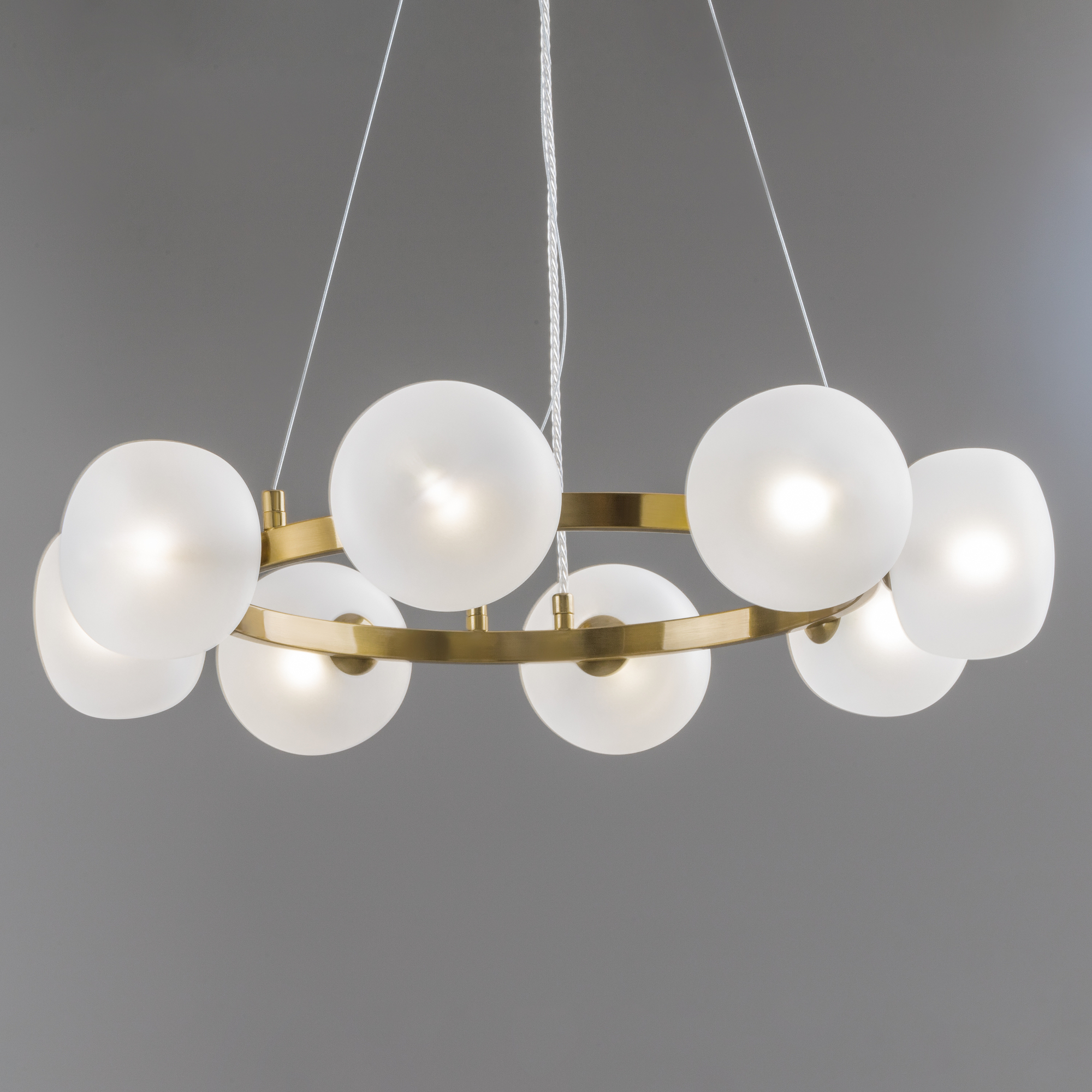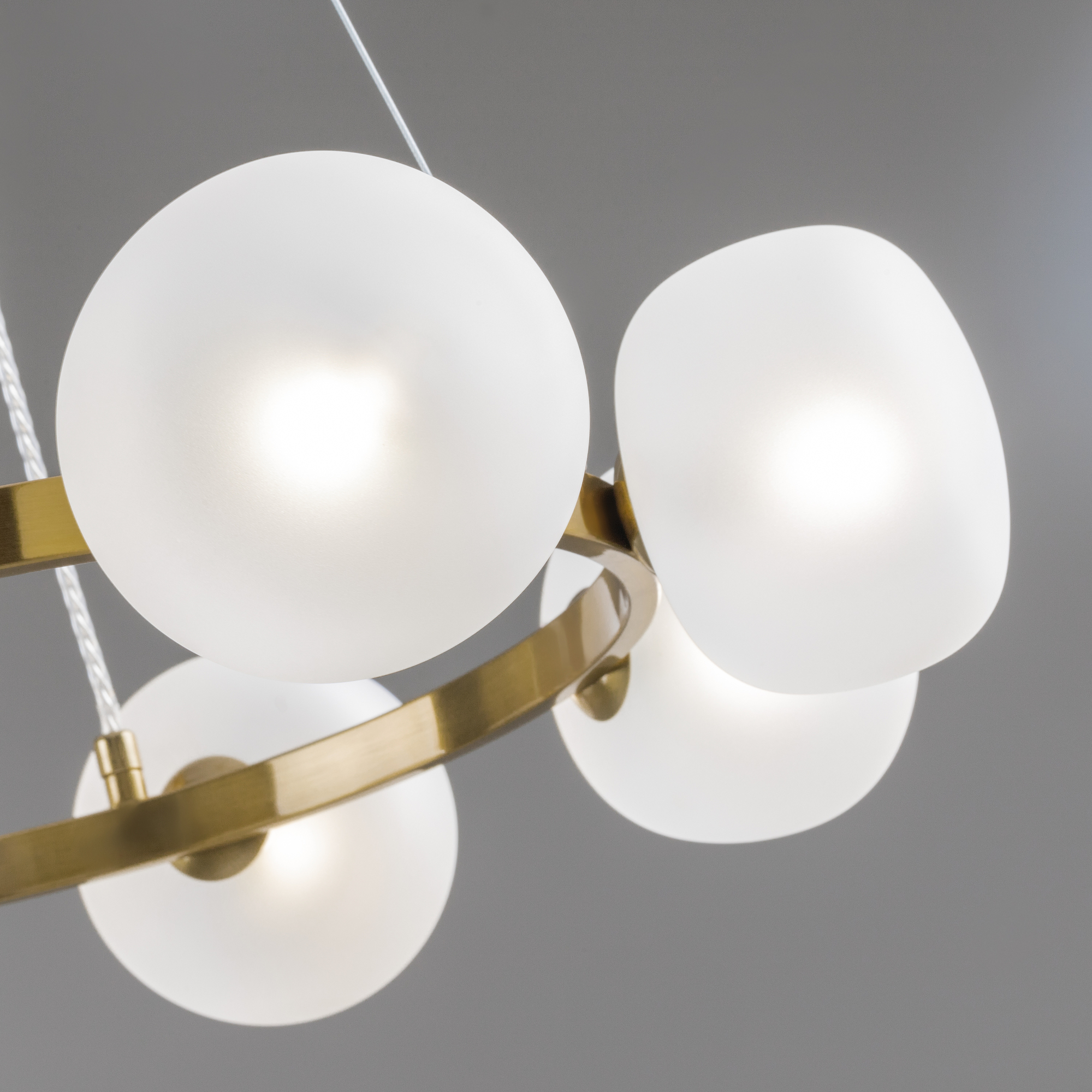 Арматура - металл. Цвет арматуры - латунь. Серия с необычной формой плафонов — немного приплюснутые, матовые белые. Настольные лампы и настенные бра выгнутой формы. Источник света лампа. Цоколь G9.