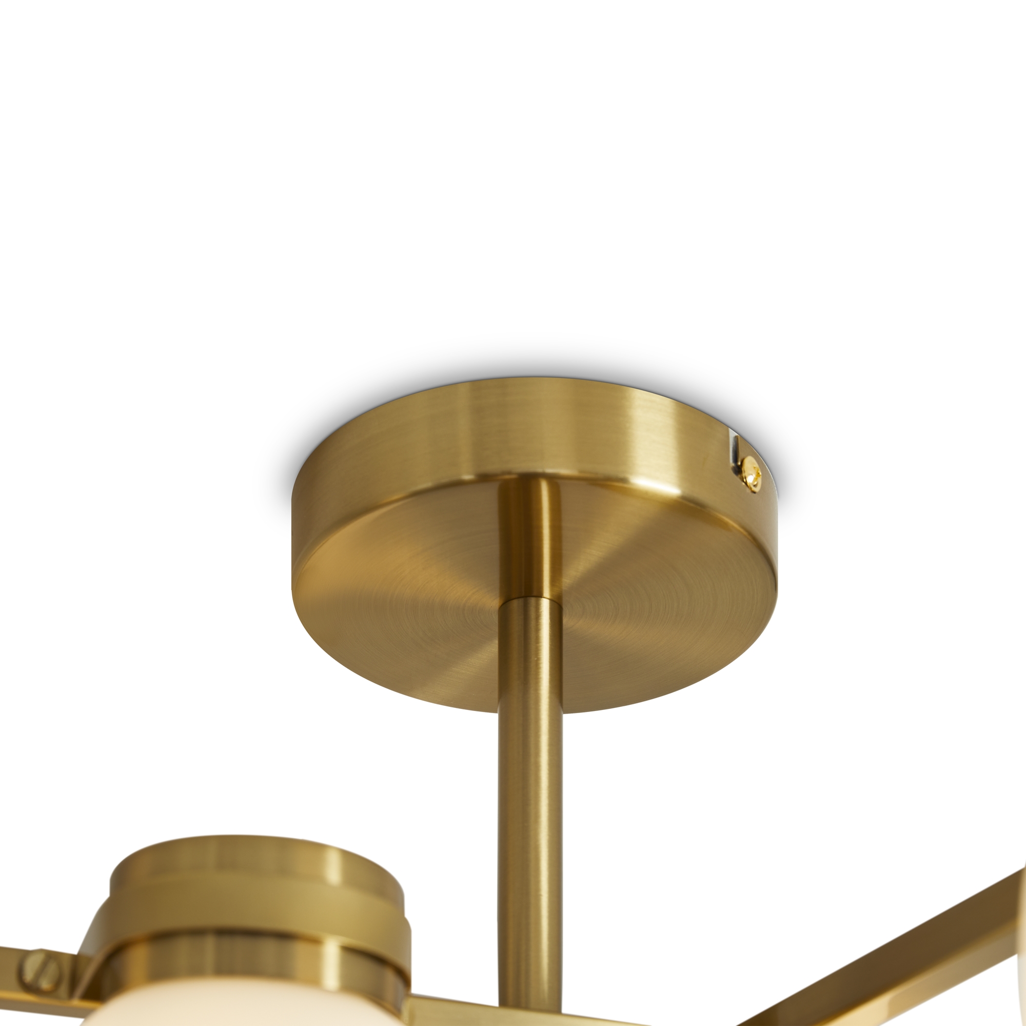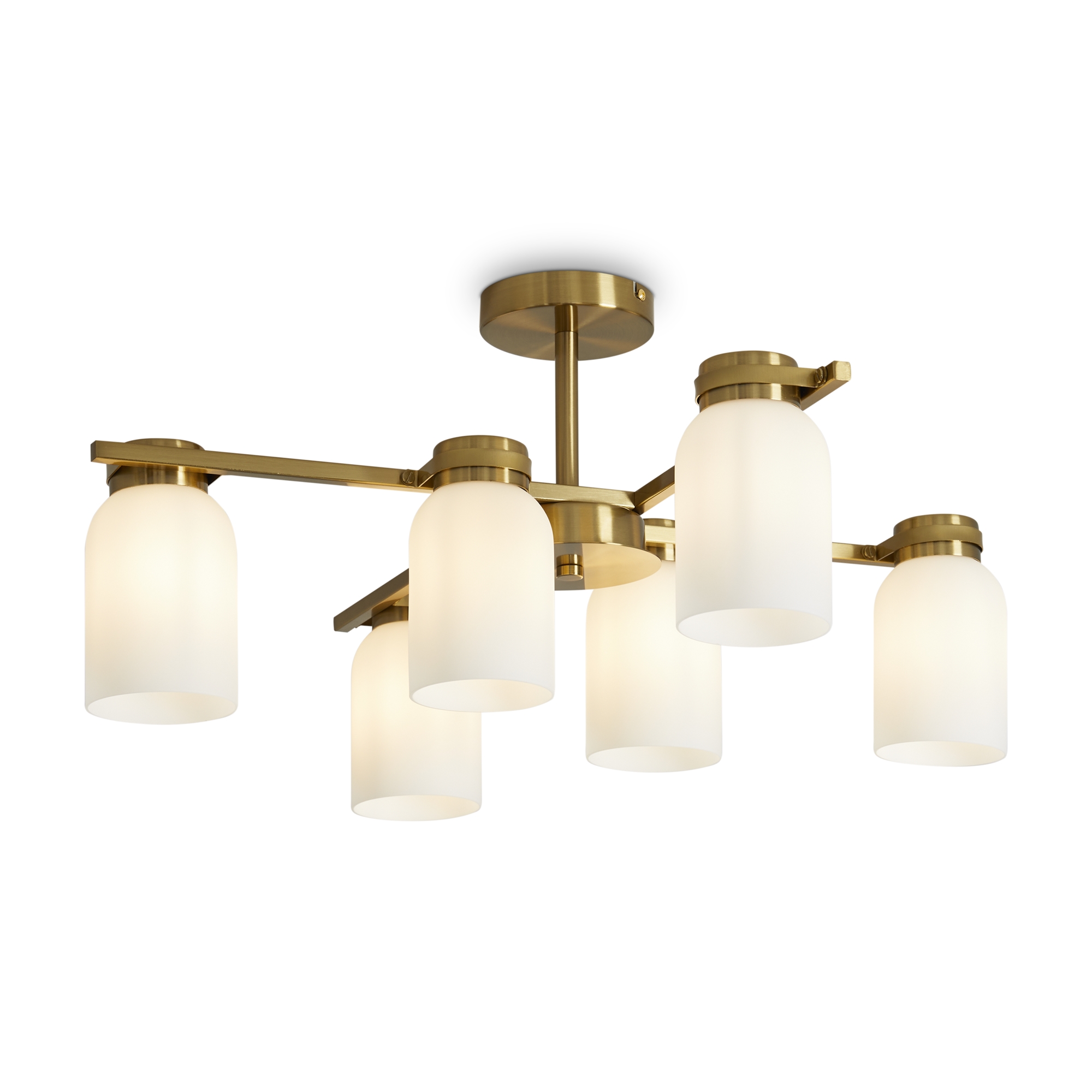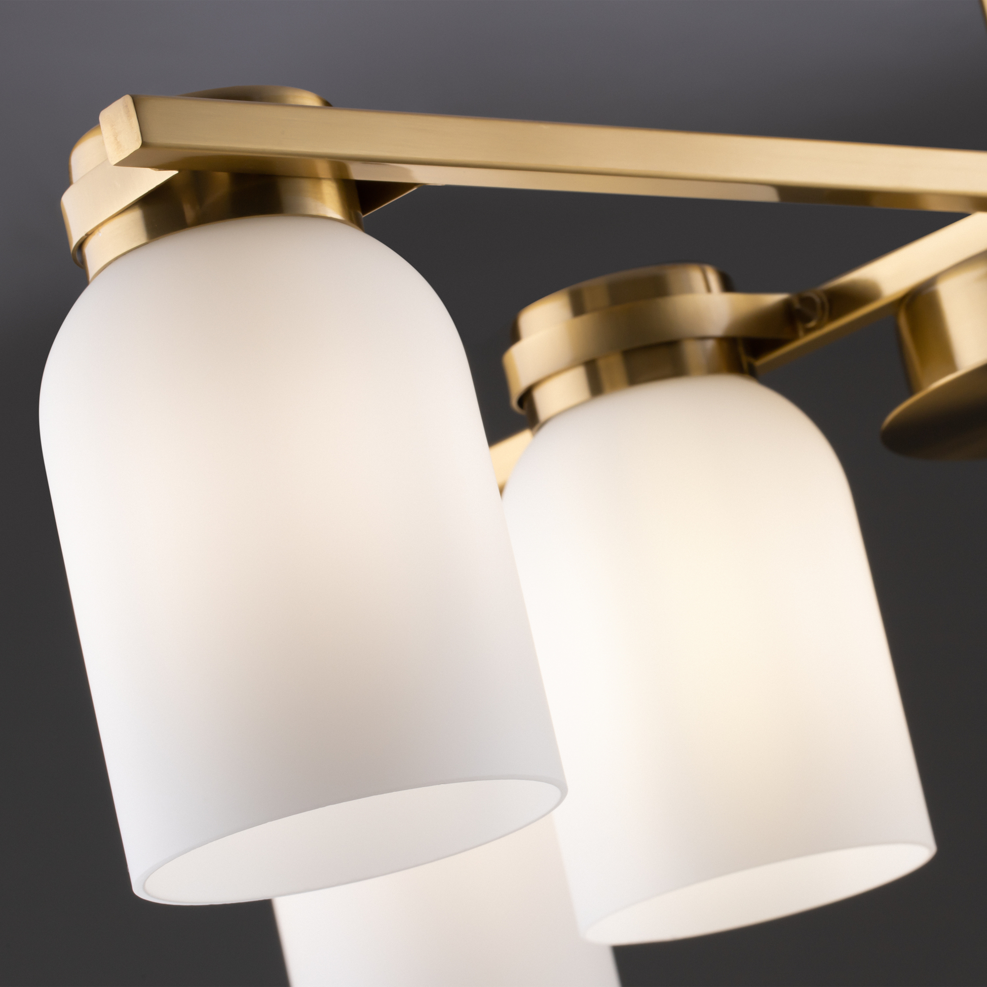 Арматура из металла. Цвет латунь. Плафоны из белого стекла новой необычной формы. Два варианта светильников — потолочные и бра. Подходит для помещений с низкими потолками. Источник света — лампа. Цоколь E14.