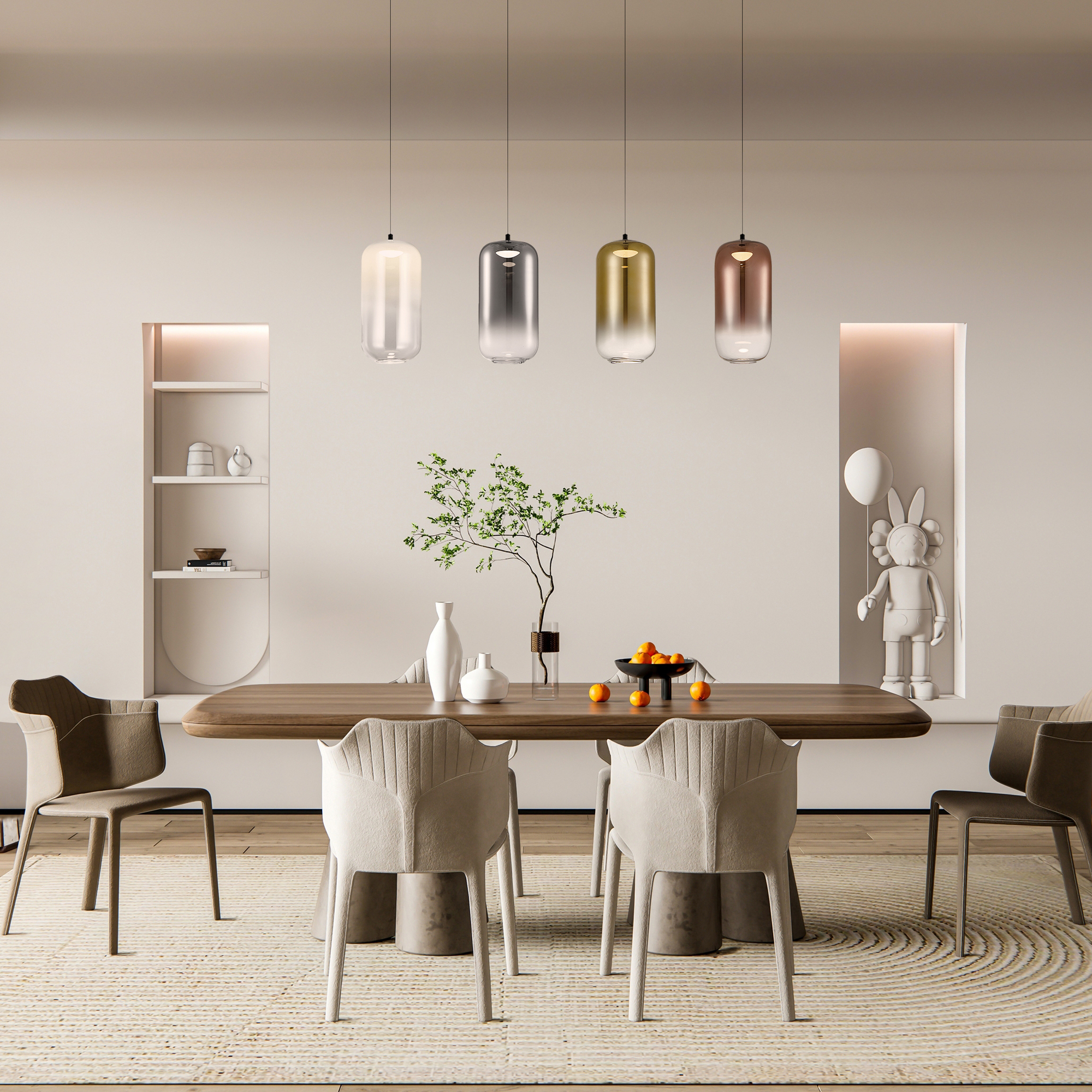Арматура металл черного матового цвета. Два вида плафонов из стекла с гальваникой растяжка. Цветовые сочетания прозрачный/белый/ дымчатый, золотой/прозрачный, дымчатый. LED — источник света, цветовая температура 3000К.