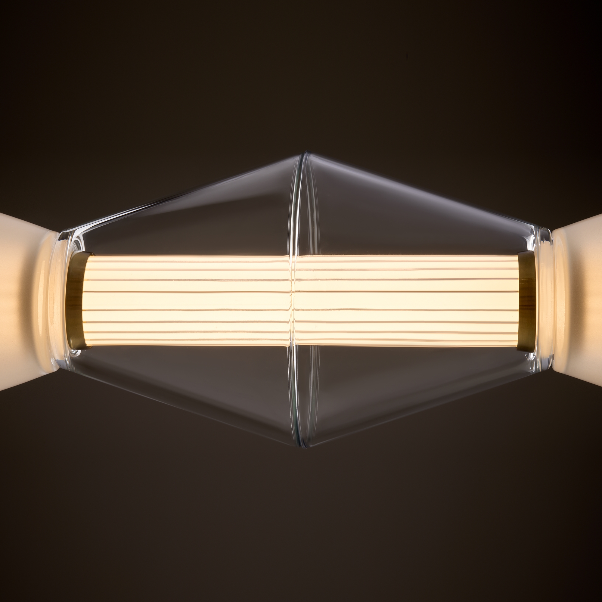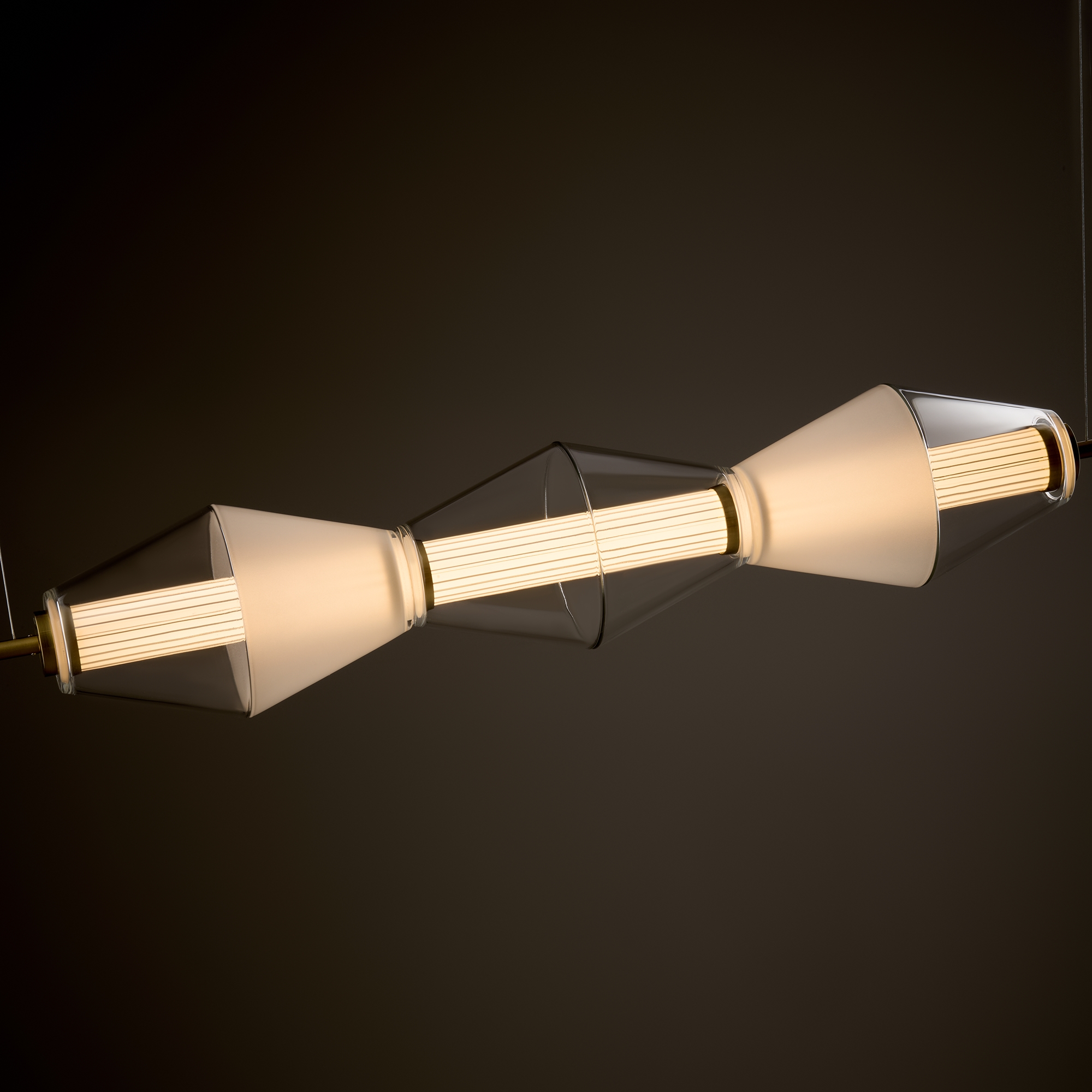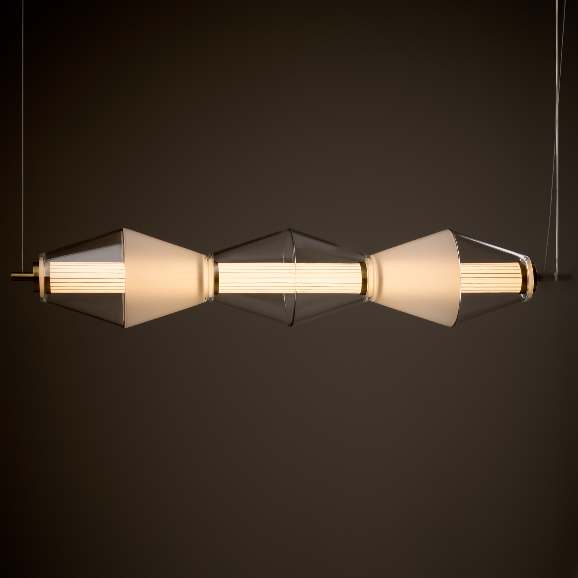 Арматура из металла. Цвет латунь. Плафон из матового, кристально прозрачного и дымчатого стекла. Горизонтальные и вертикальные подвесы. LED источник света. Цветовая температура 3000К.