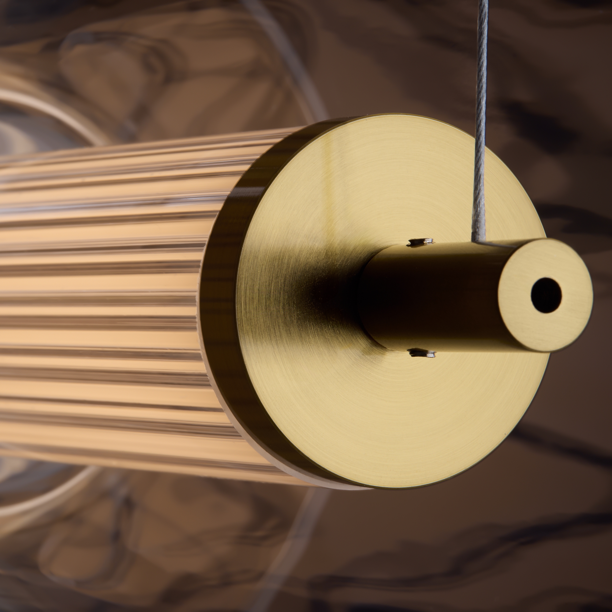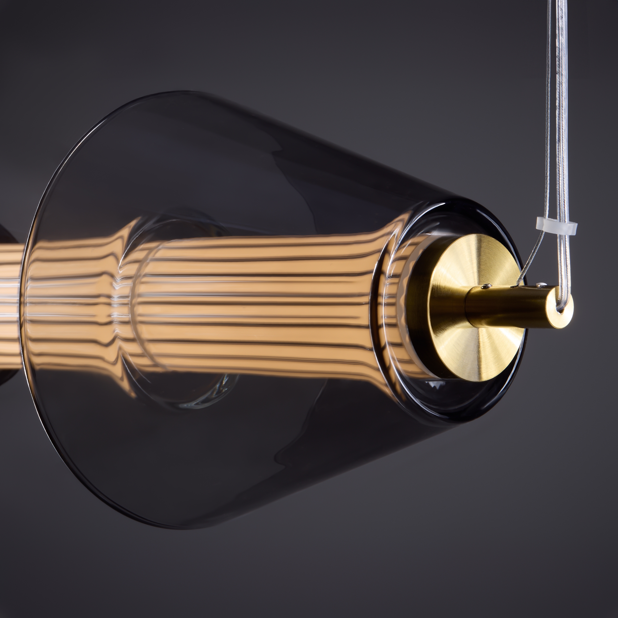 Арматура из металла. Цвет латунь. Плафон из матового, кристально прозрачного и дымчатого стекла. Горизонтальные и вертикальные подвесы. LED источник света. Цветовая температура 3000К.