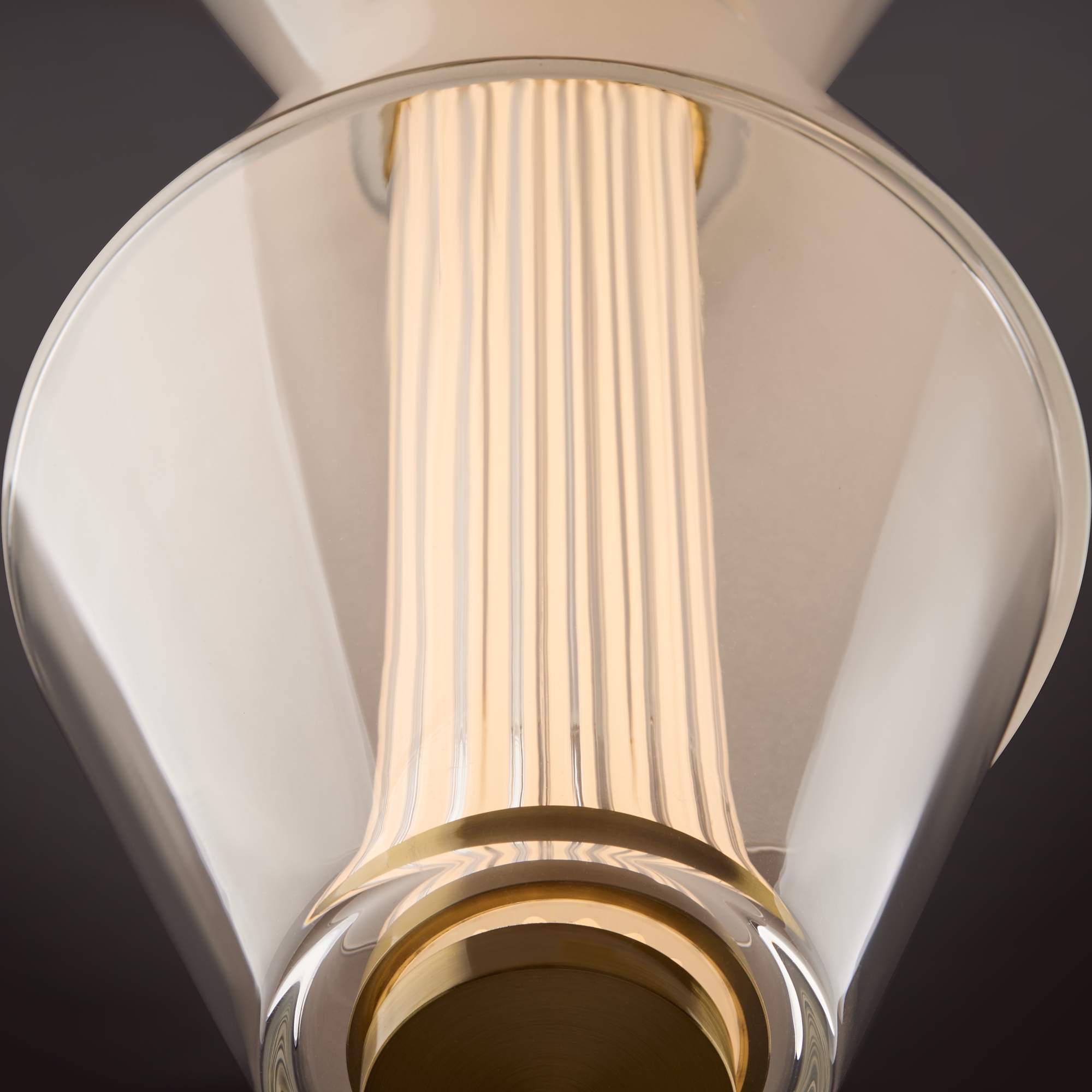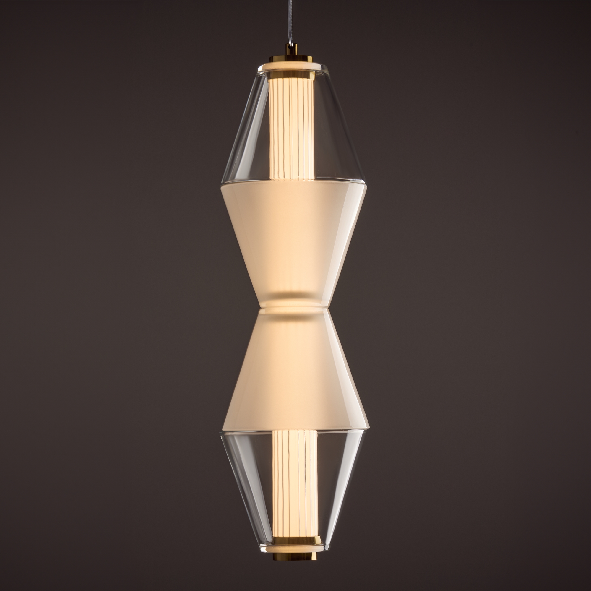 Арматура из металла. Цвет латунь. Плафон из матового, кристально прозрачного и дымчатого стекла. Горизонтальные и вертикальные подвесы. LED источник света. Цветовая температура 3000К.