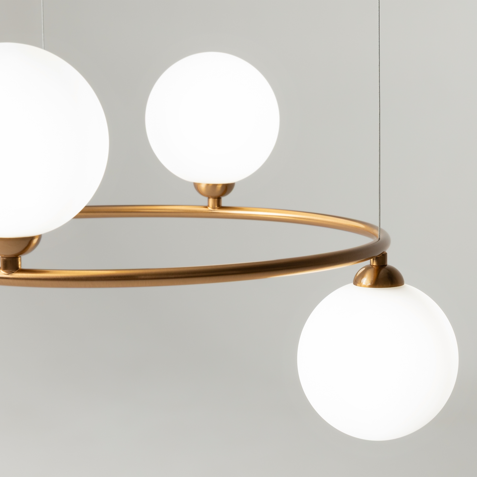 Арматура из металла в трех оттенках: белый, черный, латунь. Плафоны-сферы закреплены на округлом металлическом каркасе. Материал плафонов — выдувное стекло, цвет — белый. Высота подвесных моделей регулируется.