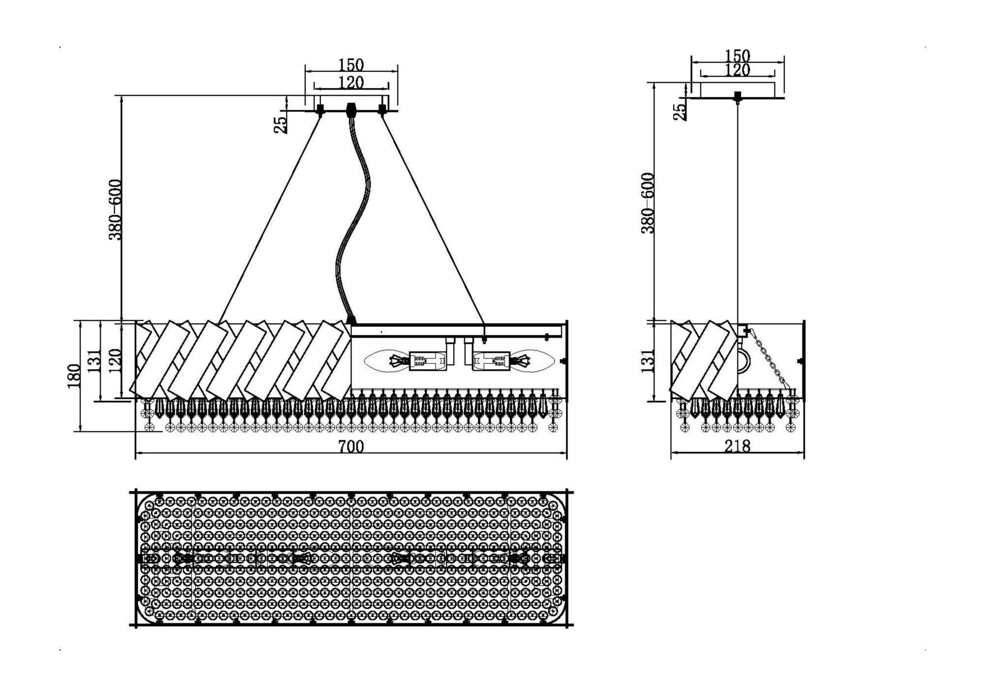 Арматура – нержавеющая сталь, цвет – латунь. Комбинация фактурных и гладких металлических пластин в декоре. Стеклянные подвески обрамляют источники света.