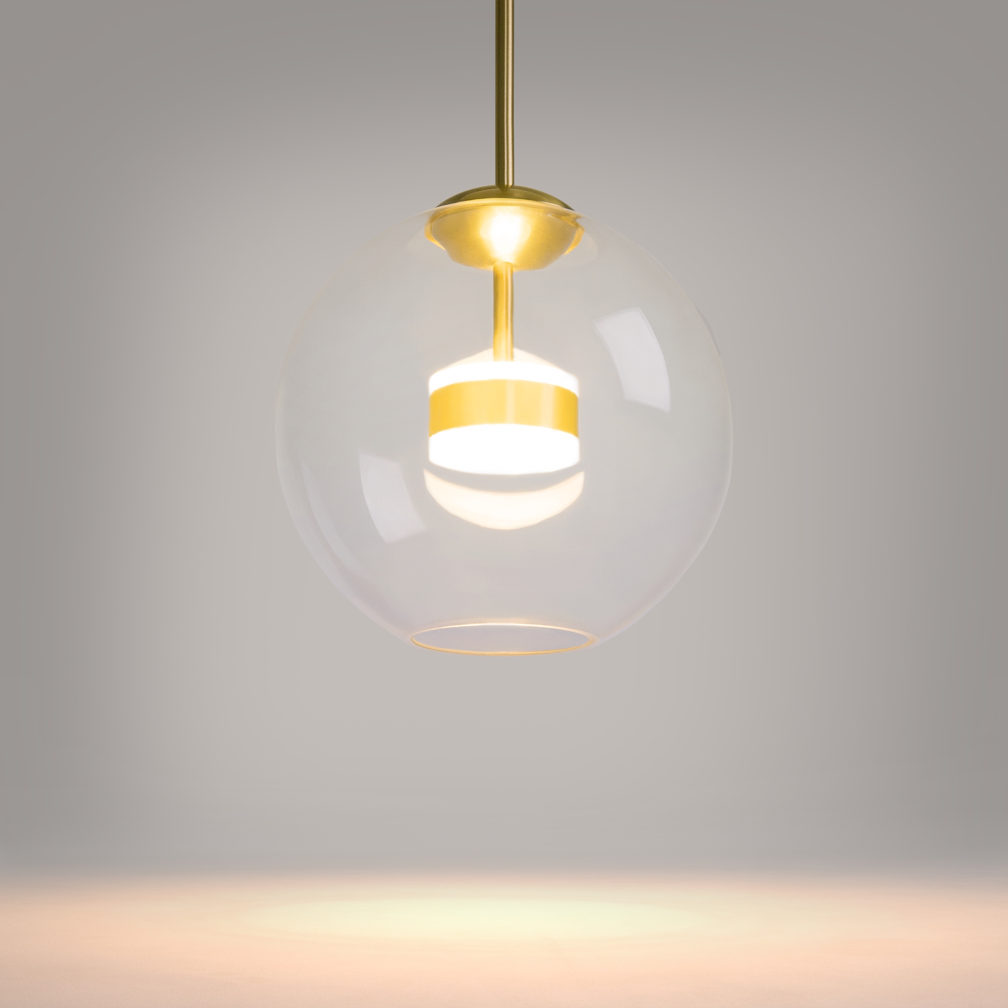 Материал арматуры – металл, цвет – матовое золото. Плафон из прозрачного выдувного стекла. LED-источник света. Регулируемая высота.