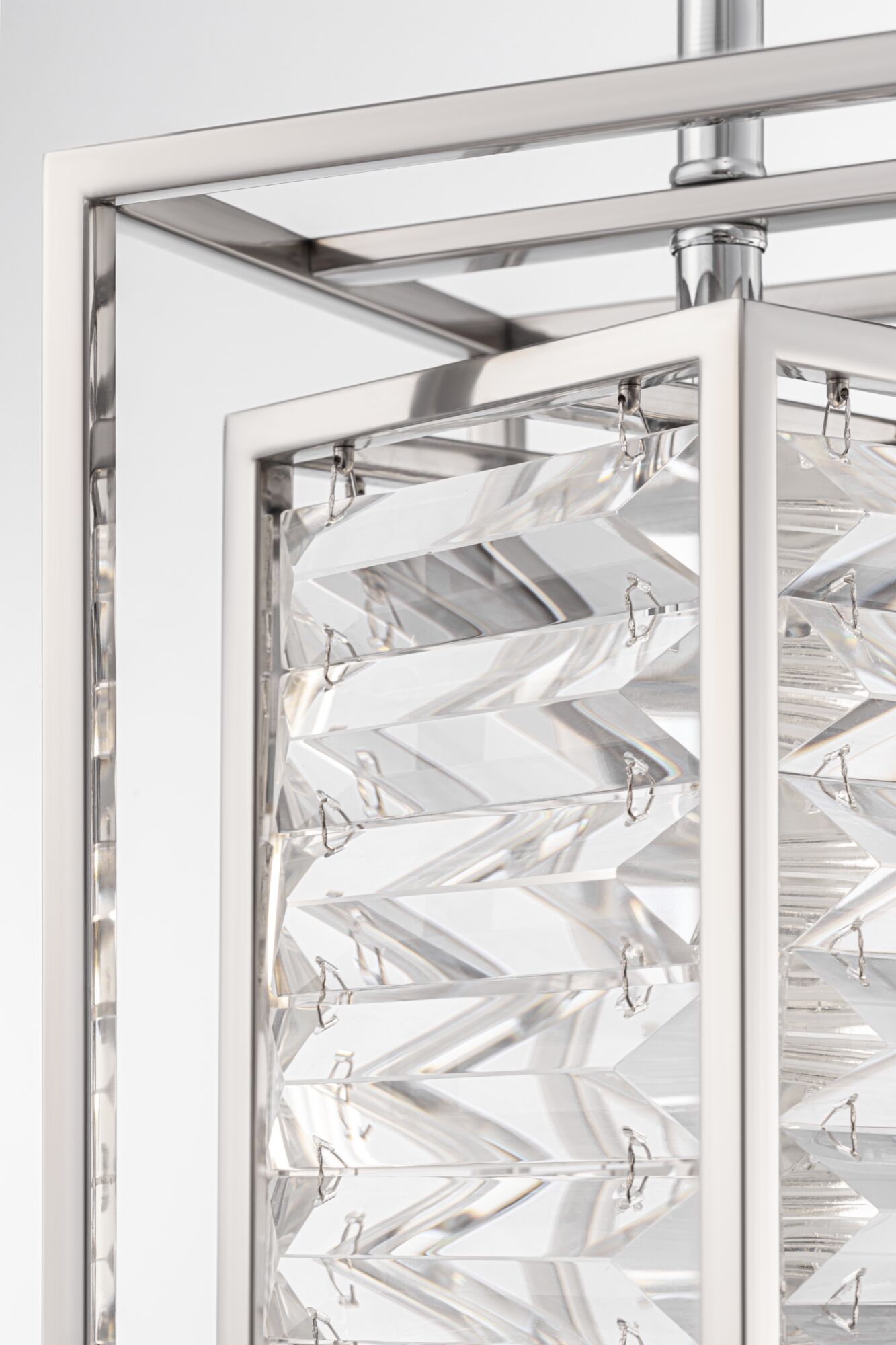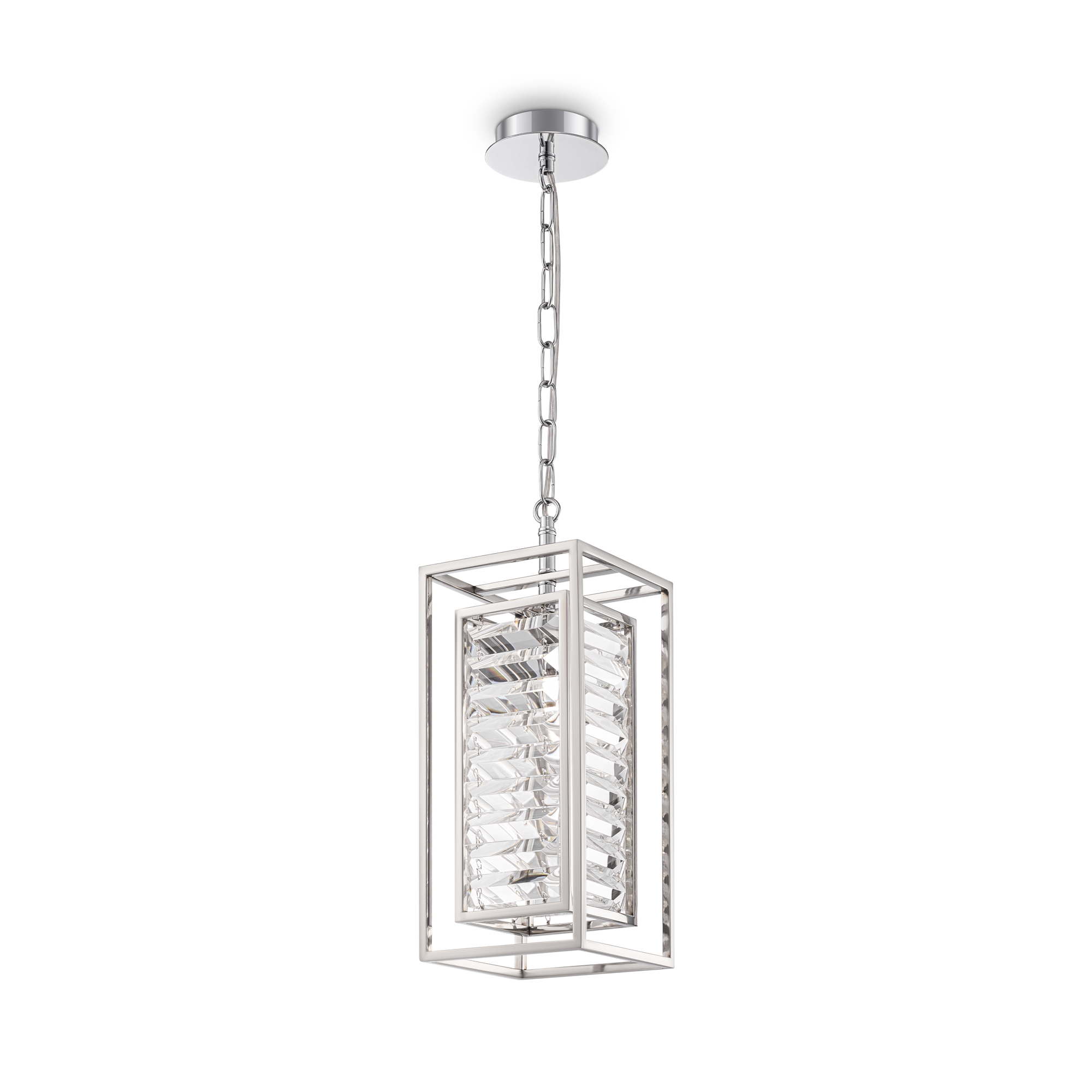 Арматура – металл, оттенки – хром, золото. Двойной геометрический плафон. Металлический каркас плафона окрашен в тон арматуре. Декор – стеклянные кри сталлы с трапециевидной огранкой. Высота подвесных моделей регулируется.