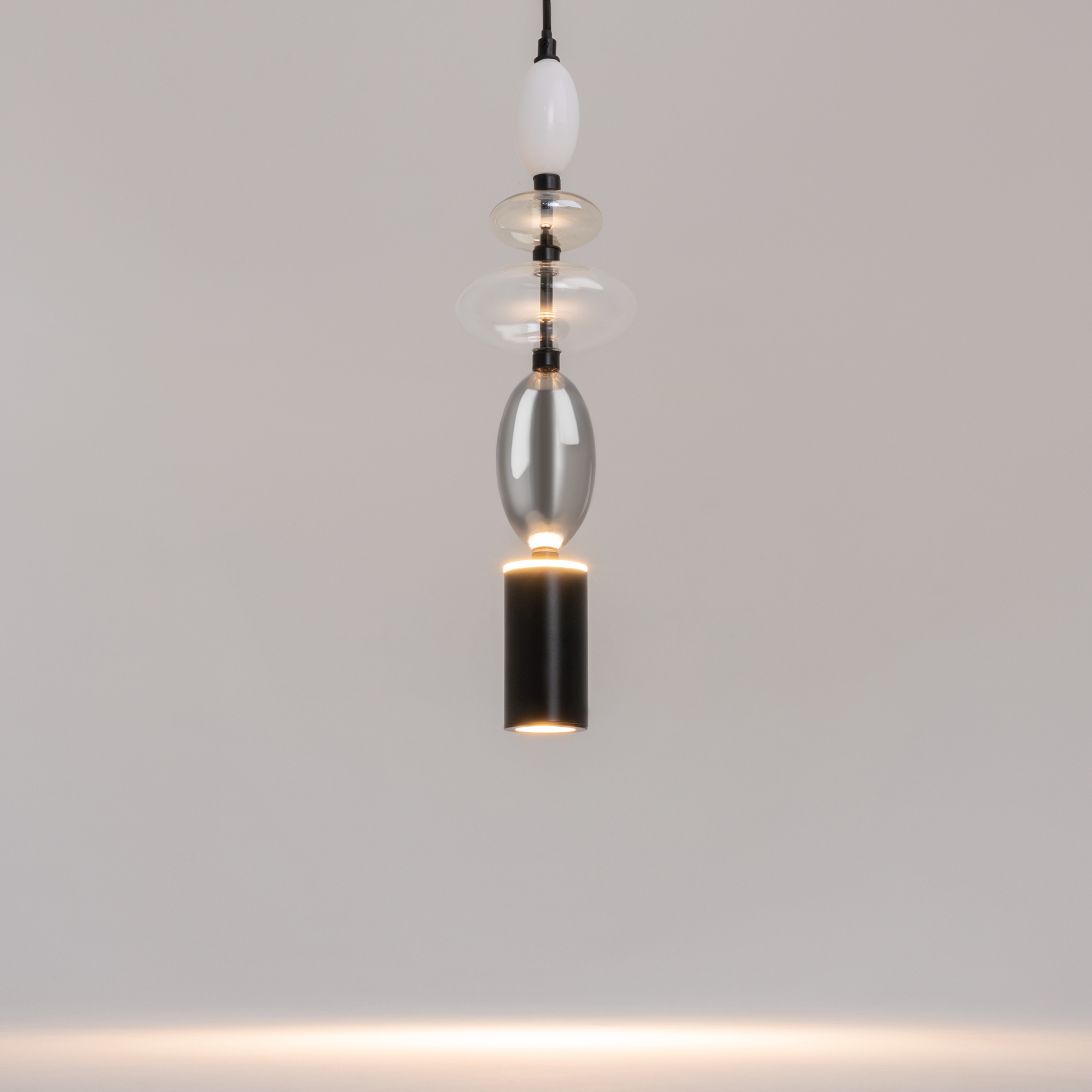 Черная металлическая арматура. Плафоны из стекла коньячного, белого, дымчатого цвета и прозрачный. Источник света комбинированный: нижний - съемная лампа с цоколем GU10, верхний - встроенный LED. Цветовая температура светильников 2700К, угол рассеивания света 120 градусов. Высота регулируется с помощью провода длиной 3 м. Монохромный дизайн, стеклянные элементы впишутся в различные стили интерьеров.