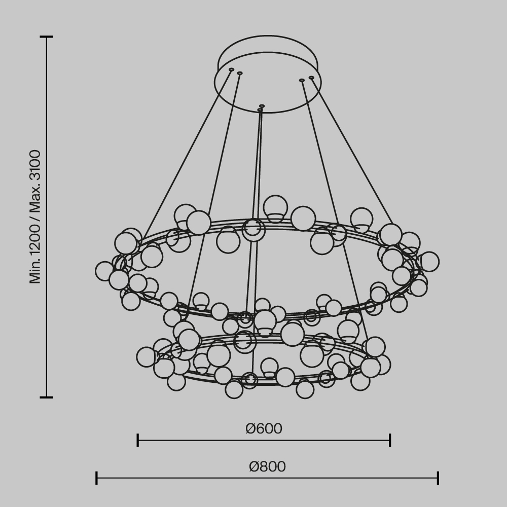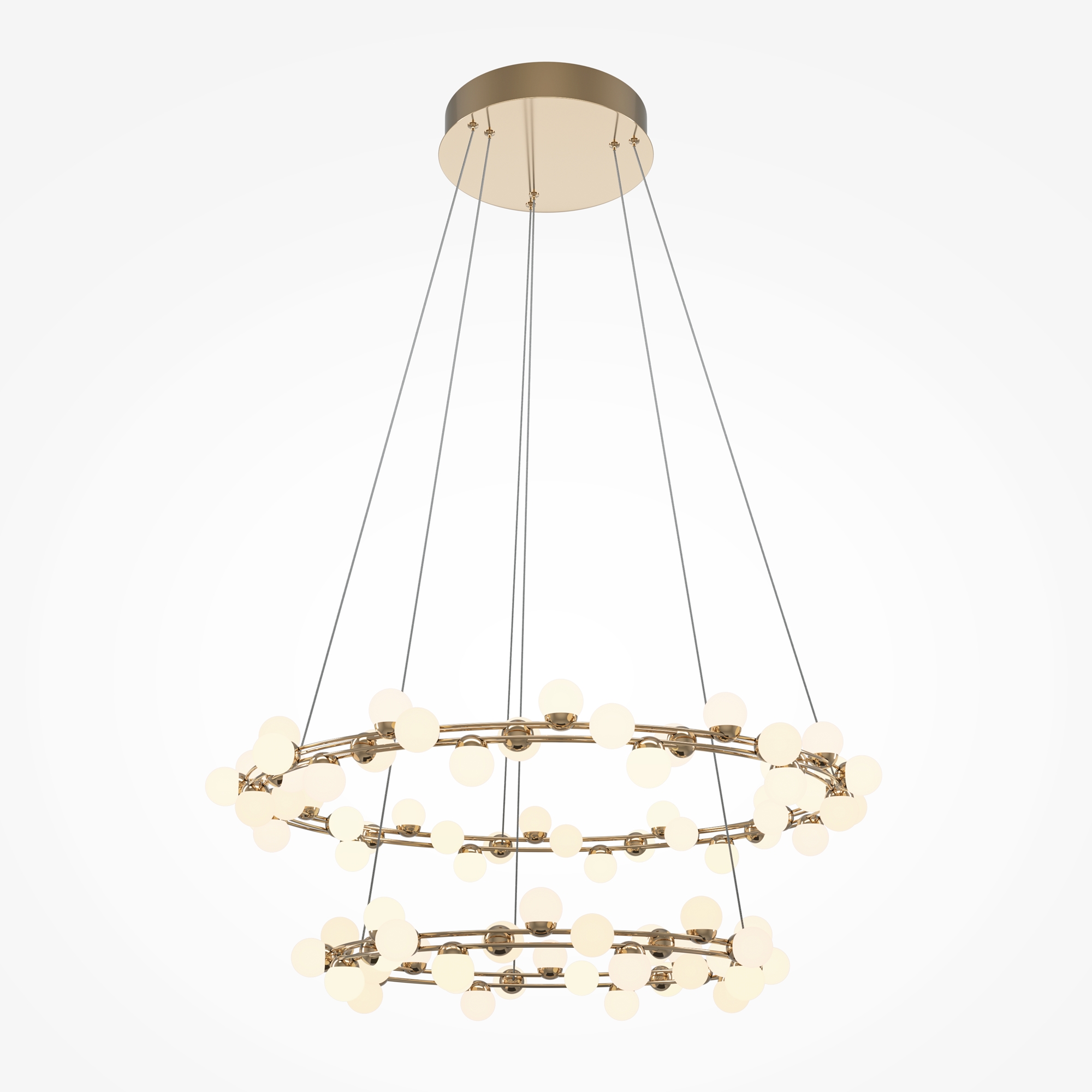 Арматура из металла в золотом цвете. Плафоны-сферы — белый пластик. Дизайн с имитацией молекулярной структуры. LED-источники света.