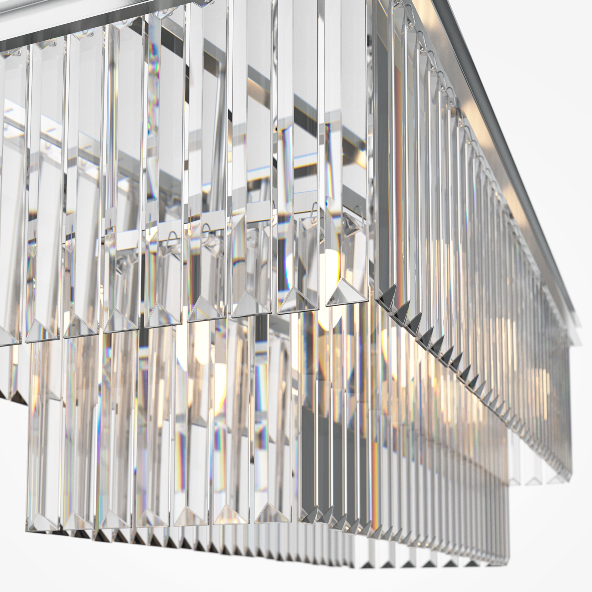 Арматура из металла в трех оттенках: латунь, хром, золото. Многоярусный декор. Подвески: прозрачное (арматура – хром, латунь) и янтарное (арматура – золото) стекло. Высота подвесных моделей регулируется.