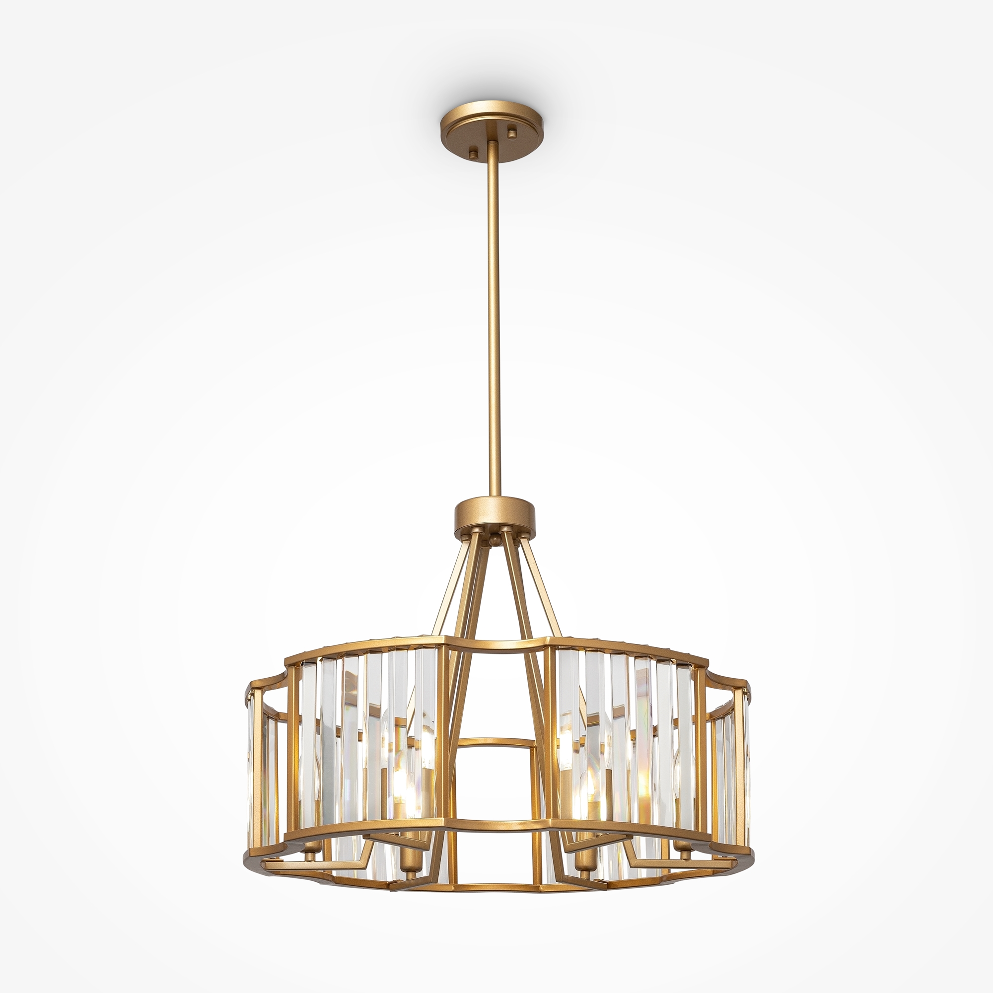 Арматура из металла в золотом цвете. Прозрачный стеклянный декор закреплен на металлическом каркасе, окрашенном в тоне арматуре. Источники света в форме свечей.