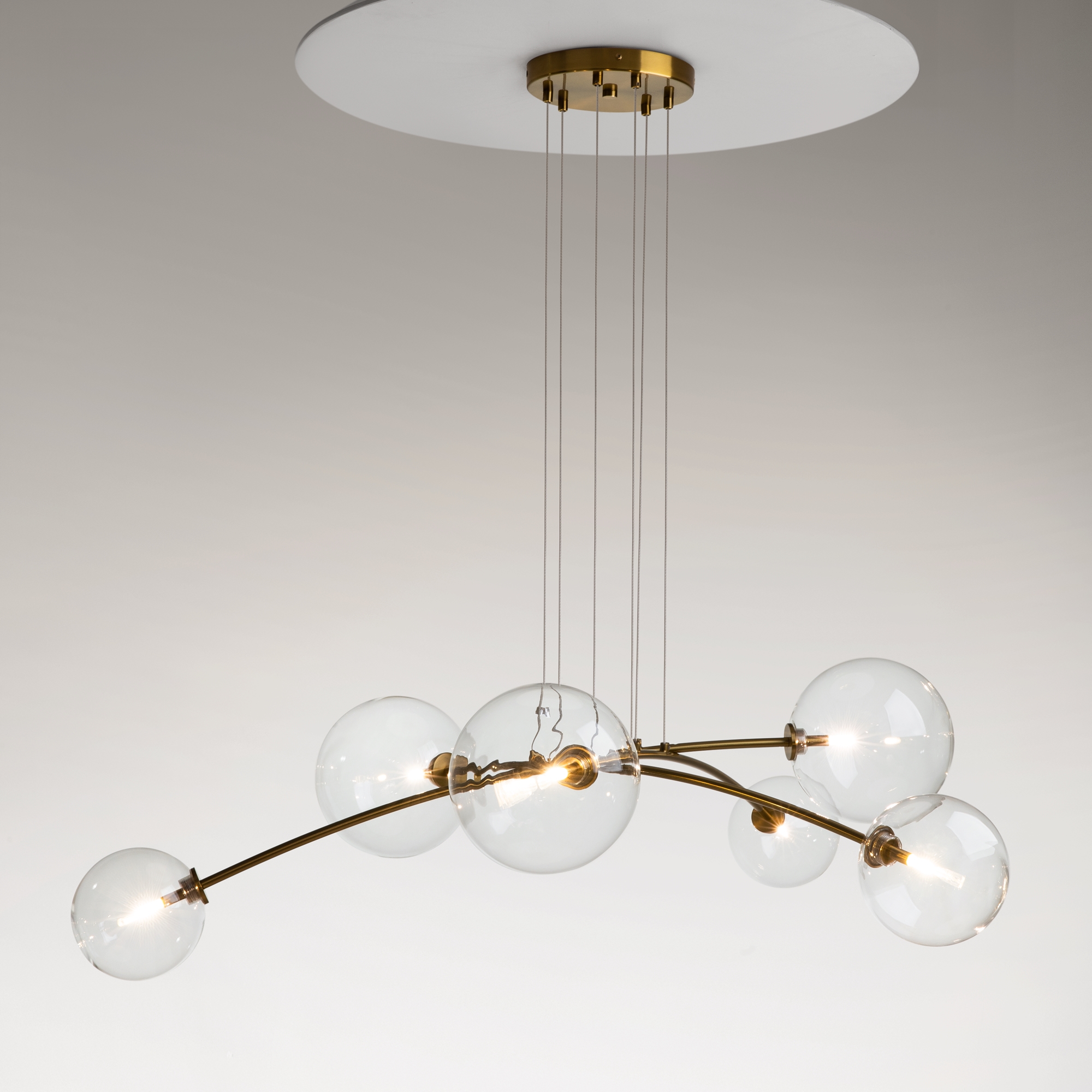 Материал арматуры - металл. Цвет - латунь, черный. Изящные линии арматуры, прозрачные плафоны из стекла в виде шара с миниатюрными лампами создают эффект воздушности светильников. Регулируемая высота подвесных светильников. Цоколь G4.