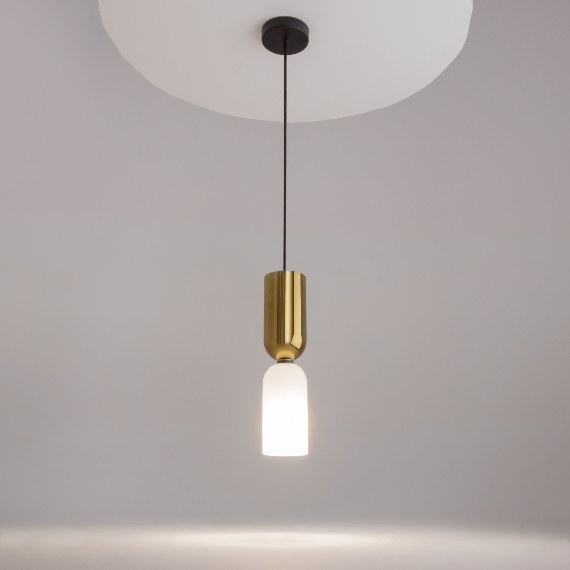 Металлическая арматура, цвет - черный. Светильники стилизованы под форму песочных часов с обтекаемой формой. Керамические элементы с глянцеовй глазурью. Подвесные светильники с плафонами из белой керамики с прозрачным, черно-белым, золото-белым и белым стеклом. Регулируемая высота подвесных светильников.