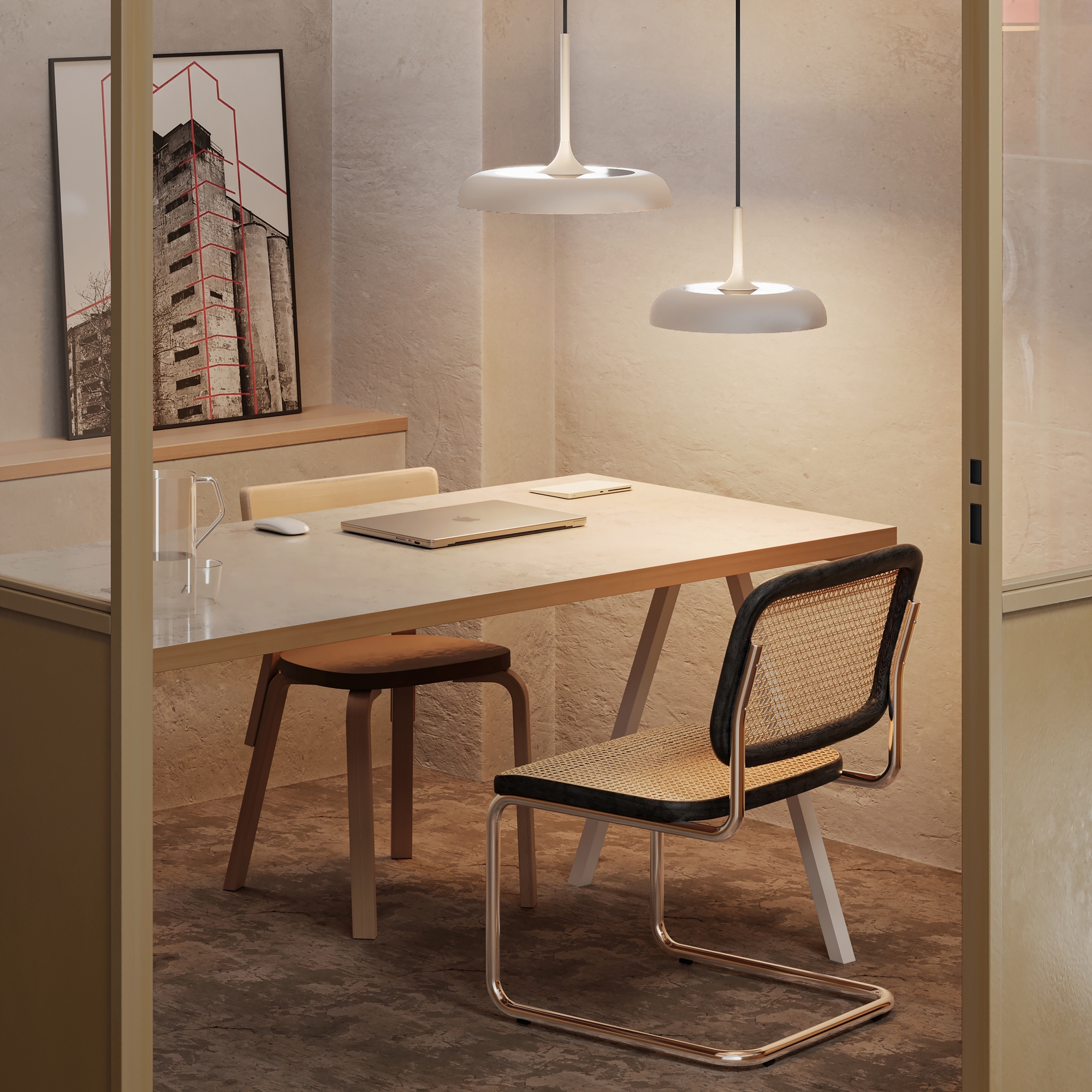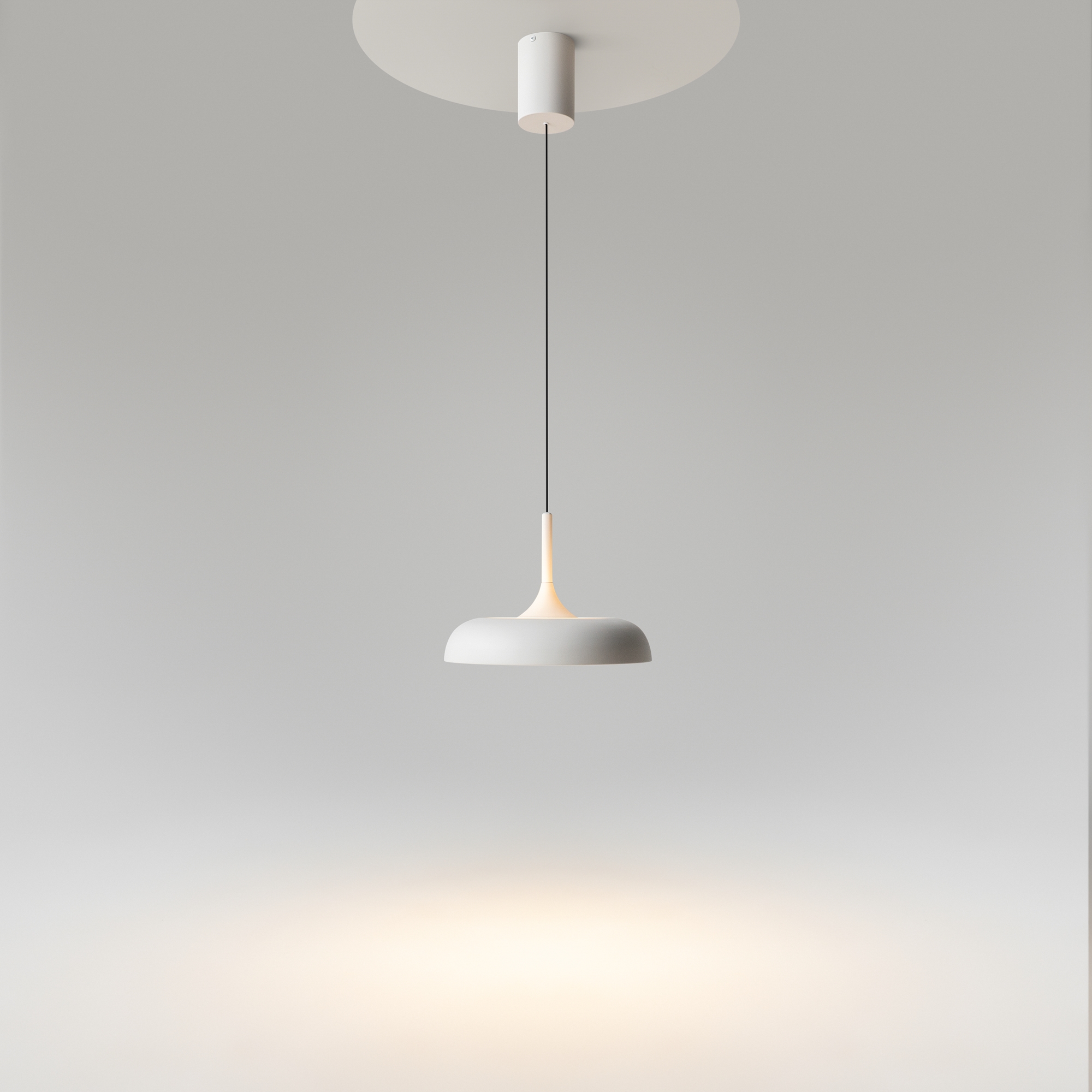 В минималистичной серии Gerhard представлены светильники в двух диаметрах (300 мм и 400 мм), двух цветах (черный и белый), а также в двух форматах. Первое поколение светильников – классические – направленный вниз свет, длина провода 3 метра. Второе поколение светильников – функциональные – двунаправленный источник света (вверх и вниз) и лифтовый механизм с проводом 2 метра, что позволяет менять высоту расположения светильника одним движением. LED-источник света с цветовой температурой 3000K.