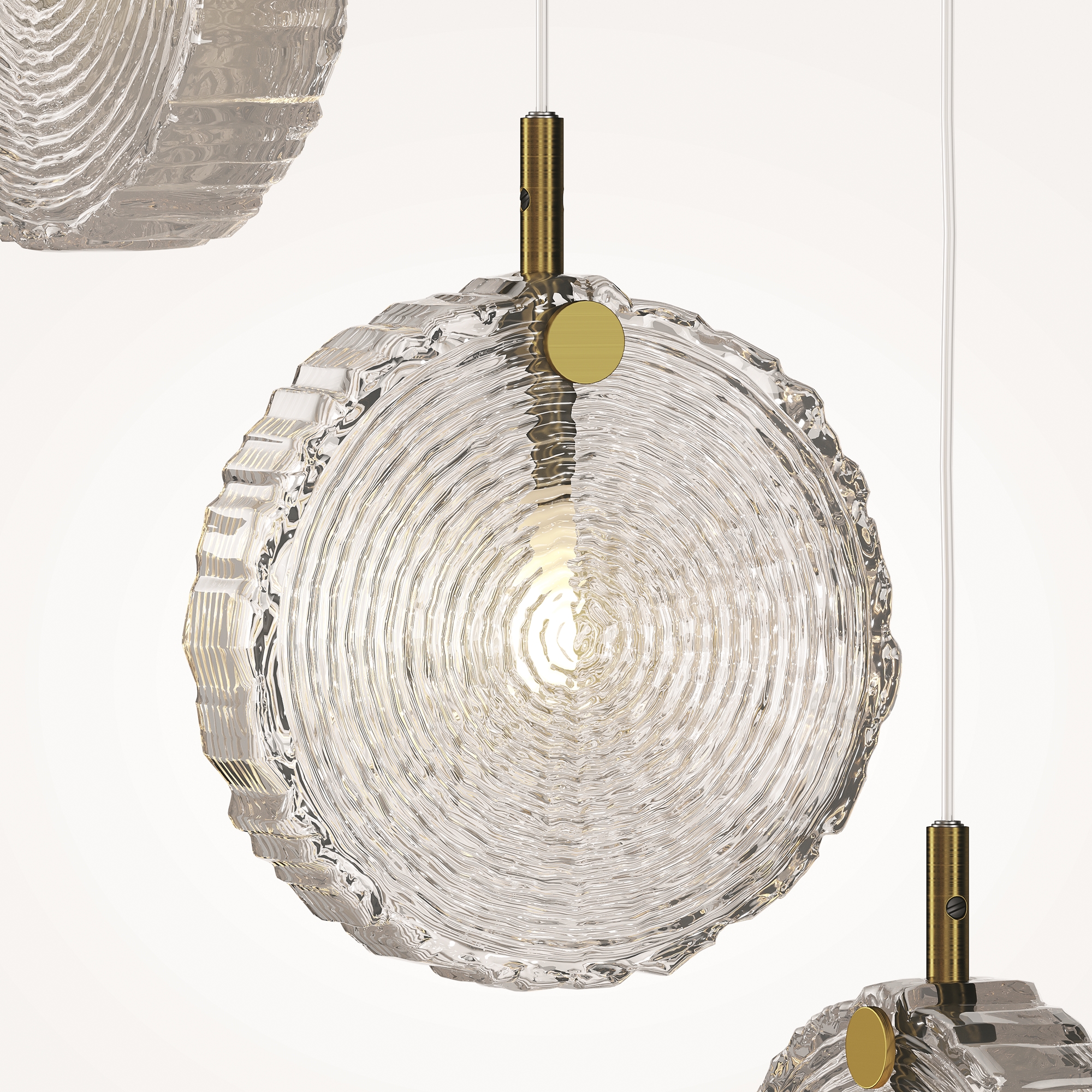 Материал арматуры - металл, цвет - латунь. Серия вдохновлена эстетикой северных лесов. Плафоны - литое цельное стекло в форме и фактуре среза дерева. Три варианта цвета плафонов: прозрачный; прозрачный + матовый; прозрачный + матовый + изумрудный. Эстетичные крепления и магнитная потолочная чаша без видимых болтов. Готовые композиции из 1, 5, 7 и 12 плафонов. Источник света - лампа с цоколем G4.