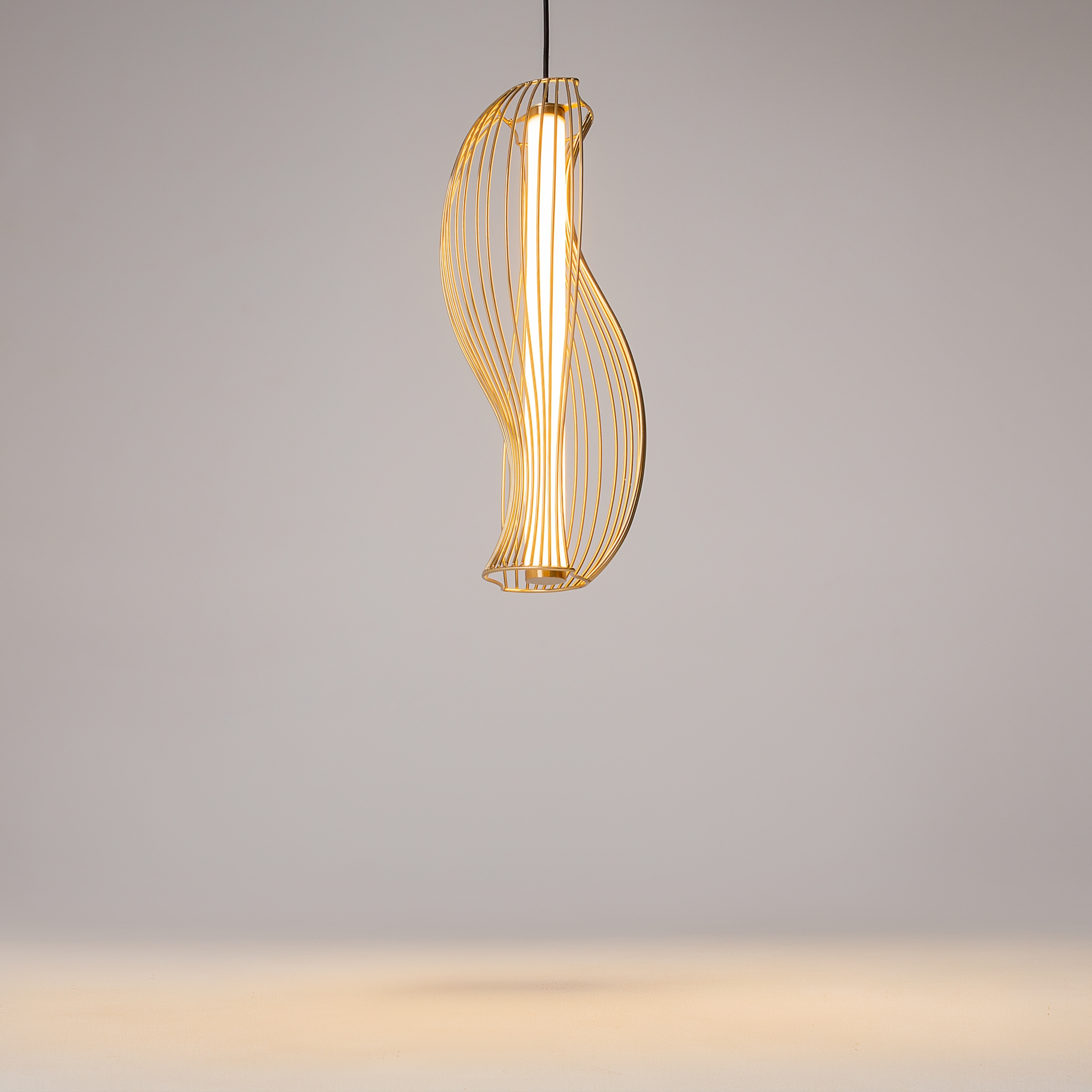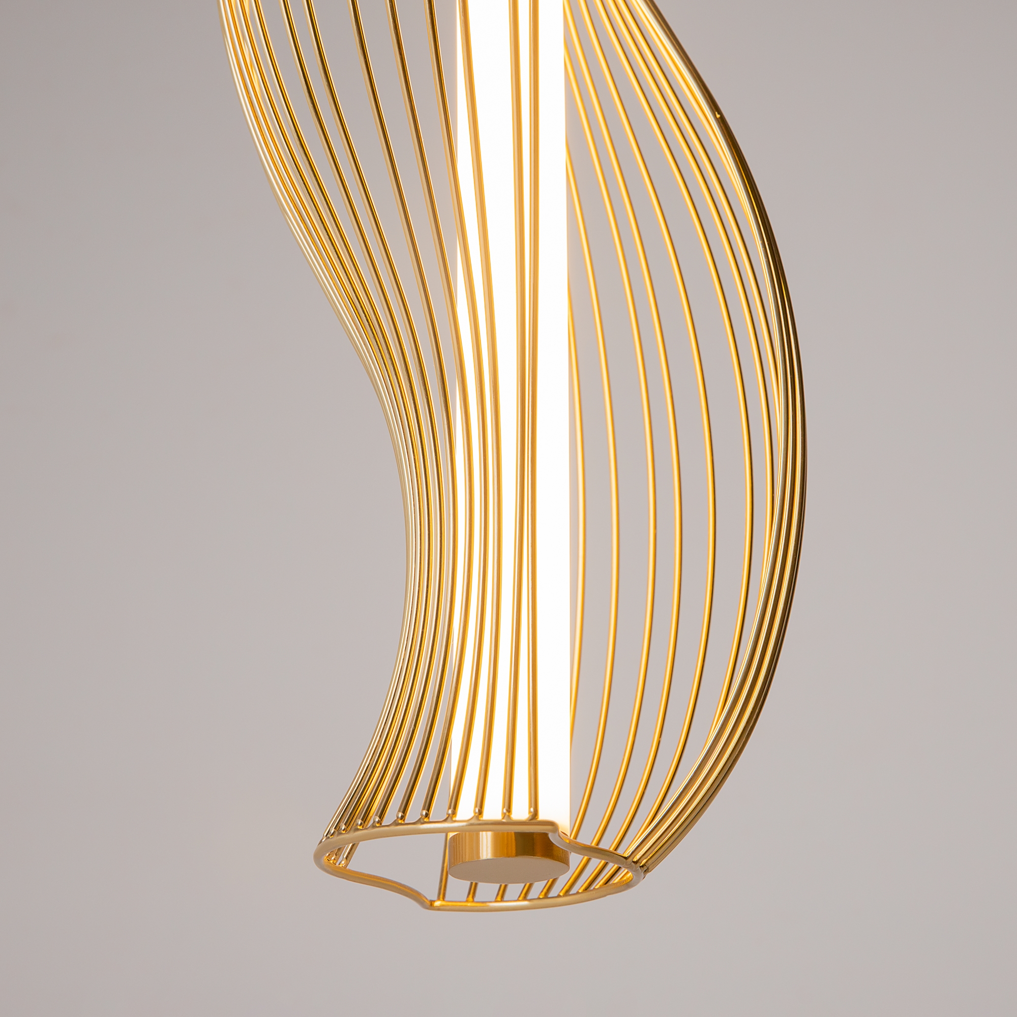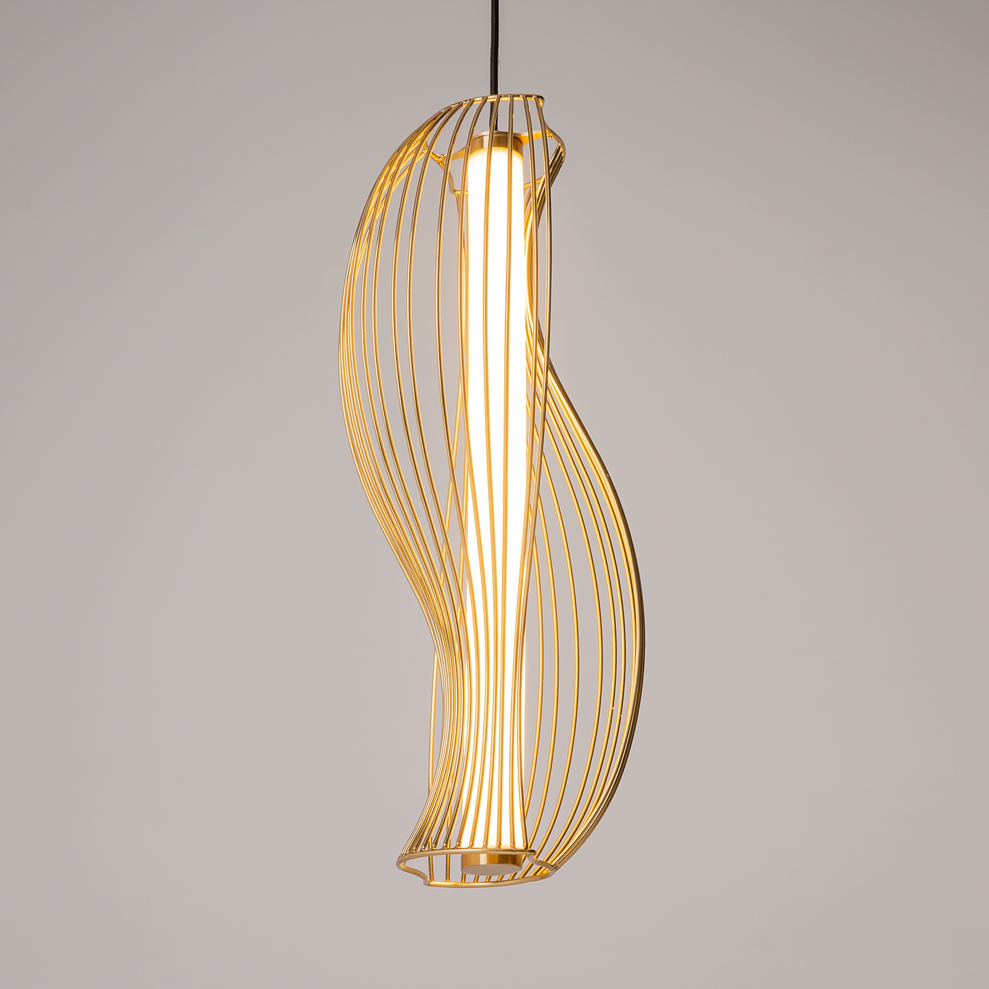 Два цветовых решения: черный и латунь. Абажуры из проволоки в асимметричном исполнении. Оригинальный дизайн, вдохновленный силуэтами античных амфор. Центральный LED-источник света с матовым рассеивателем. Регулируемая высота подвеса и провод длиной 3 метра. Возможность создания композиций.