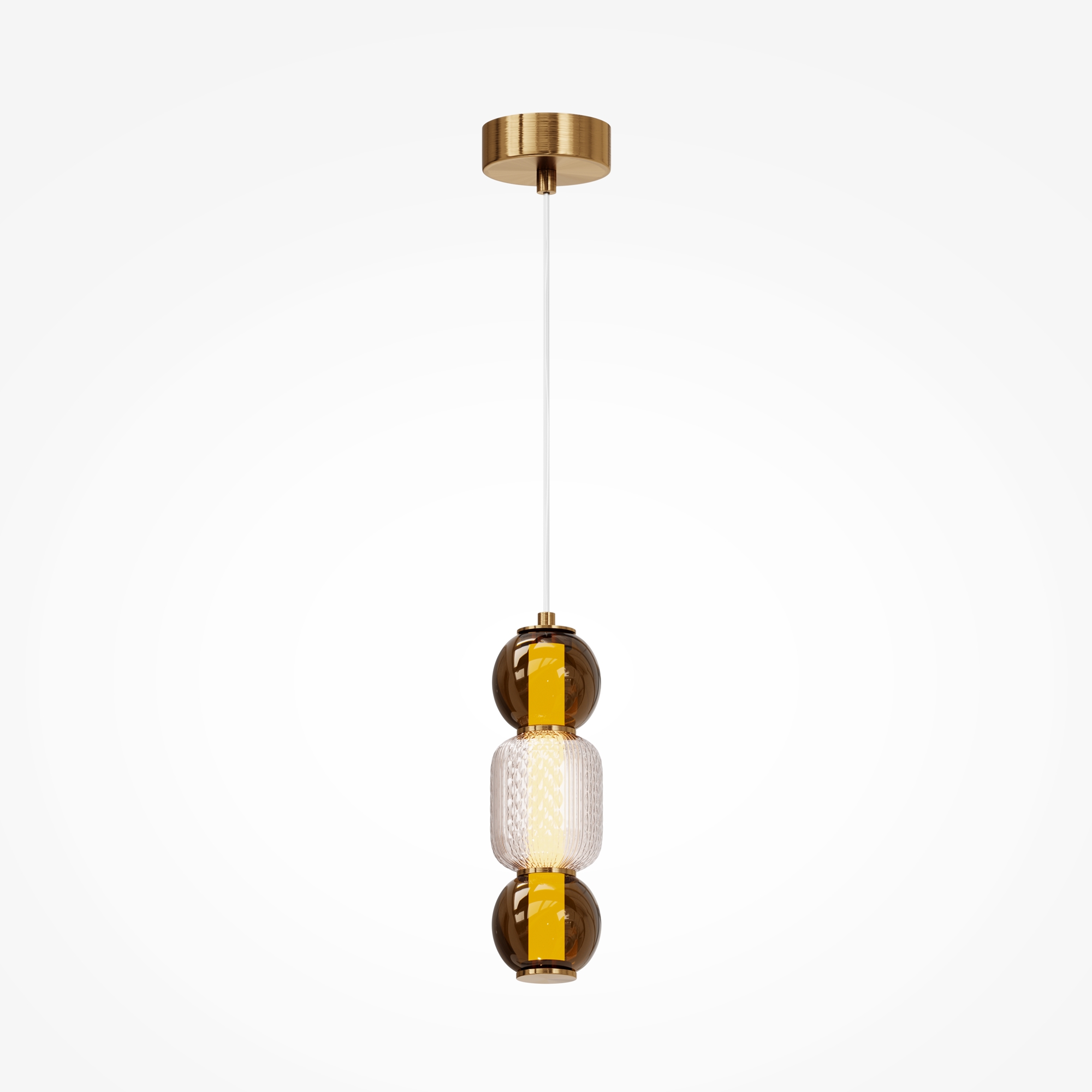 Материал арматуры - металл, цвета - золото, хром. Микс плафонов: гладкие cферы коньячного или дымчатого оттенка + округлые рельефные с ромбовидным узором из прозрачного стекла. Регулируемая высота подвесных моделей - максимальная длина провода 3 метра. LED-источник света, цветовая температура 3000К